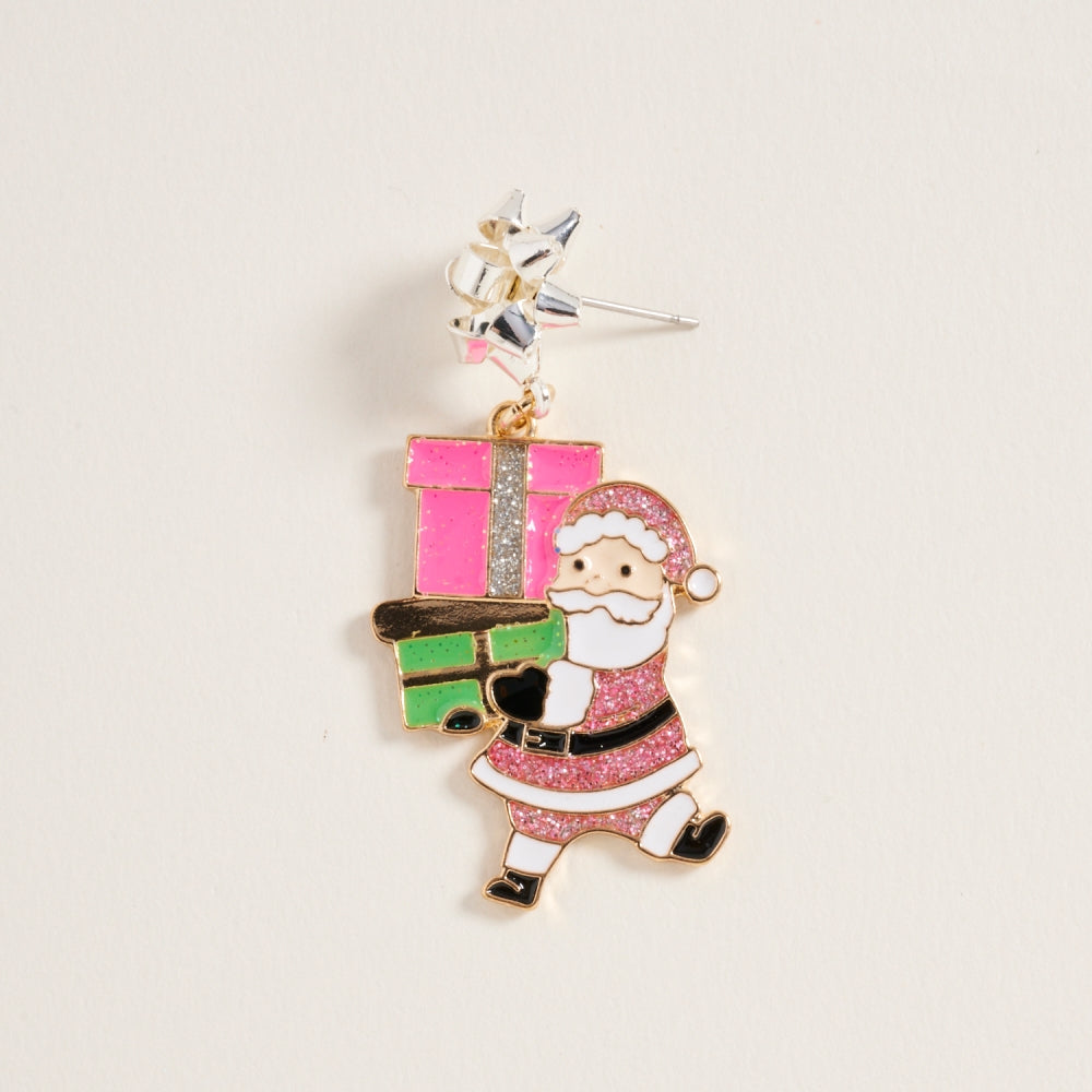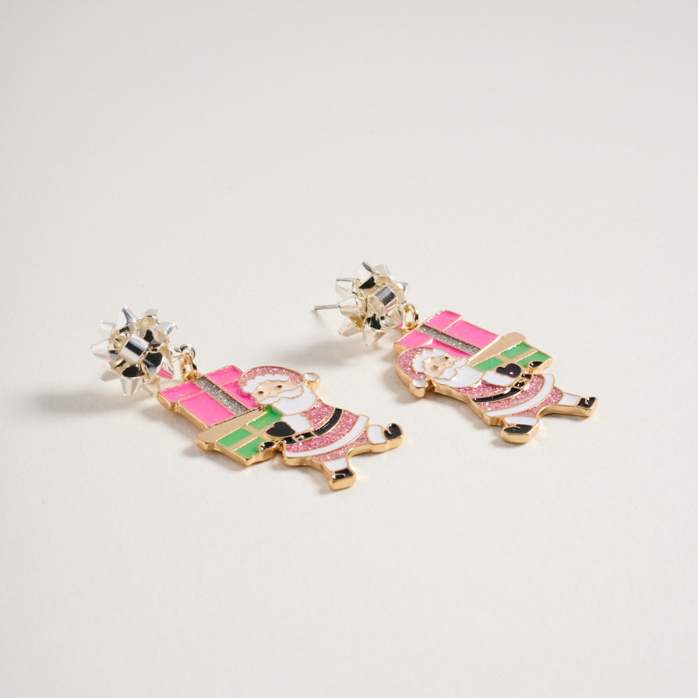 Celebrate the spirit of giving with these glittering Santa earrings adorned with bows and presents, a merry touch for any holiday ensemble.
