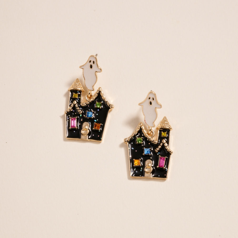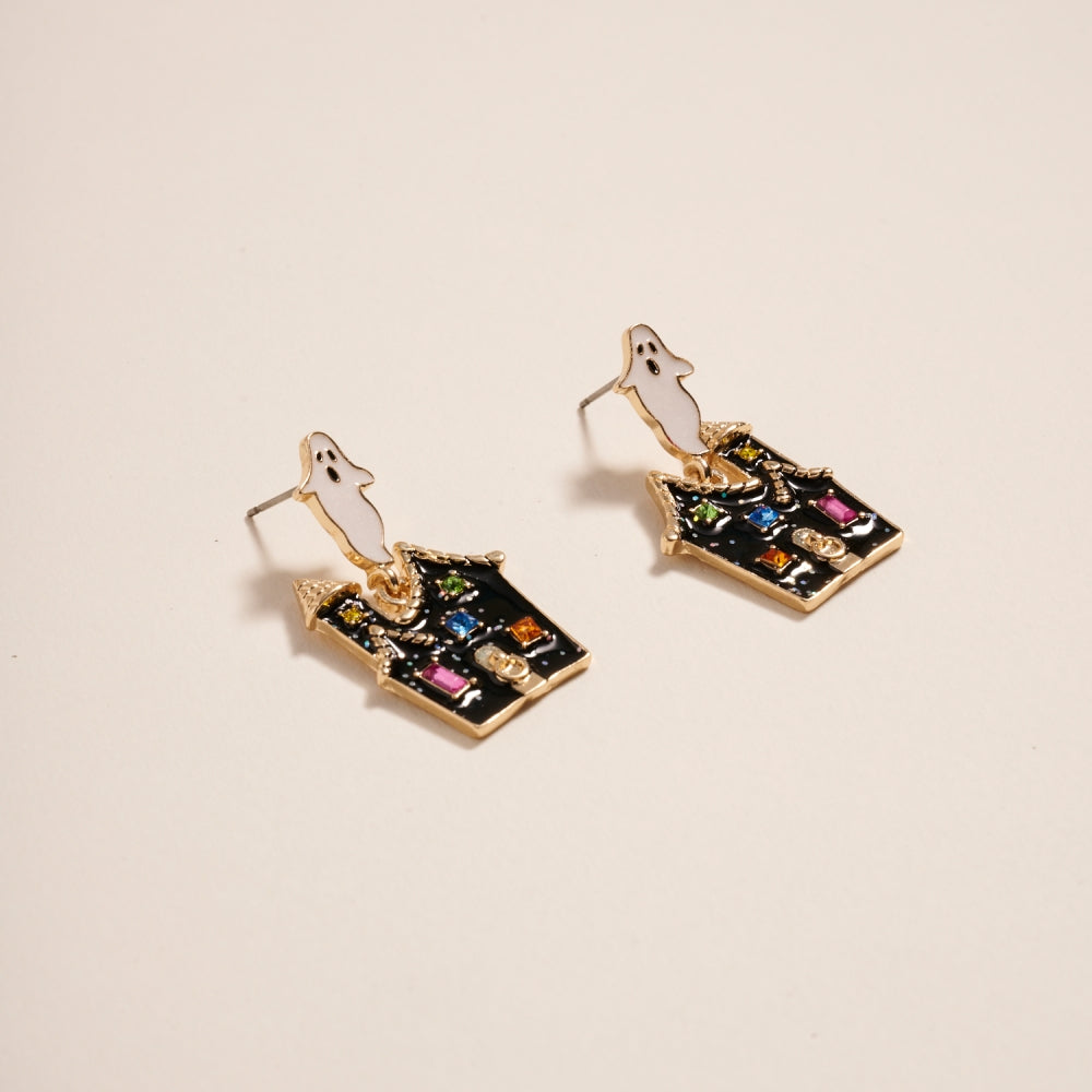 These haunted house earrings feature a playful ghost design with a hint of glitter for extra charm. A fun and festive accessory for Halloween lovers.