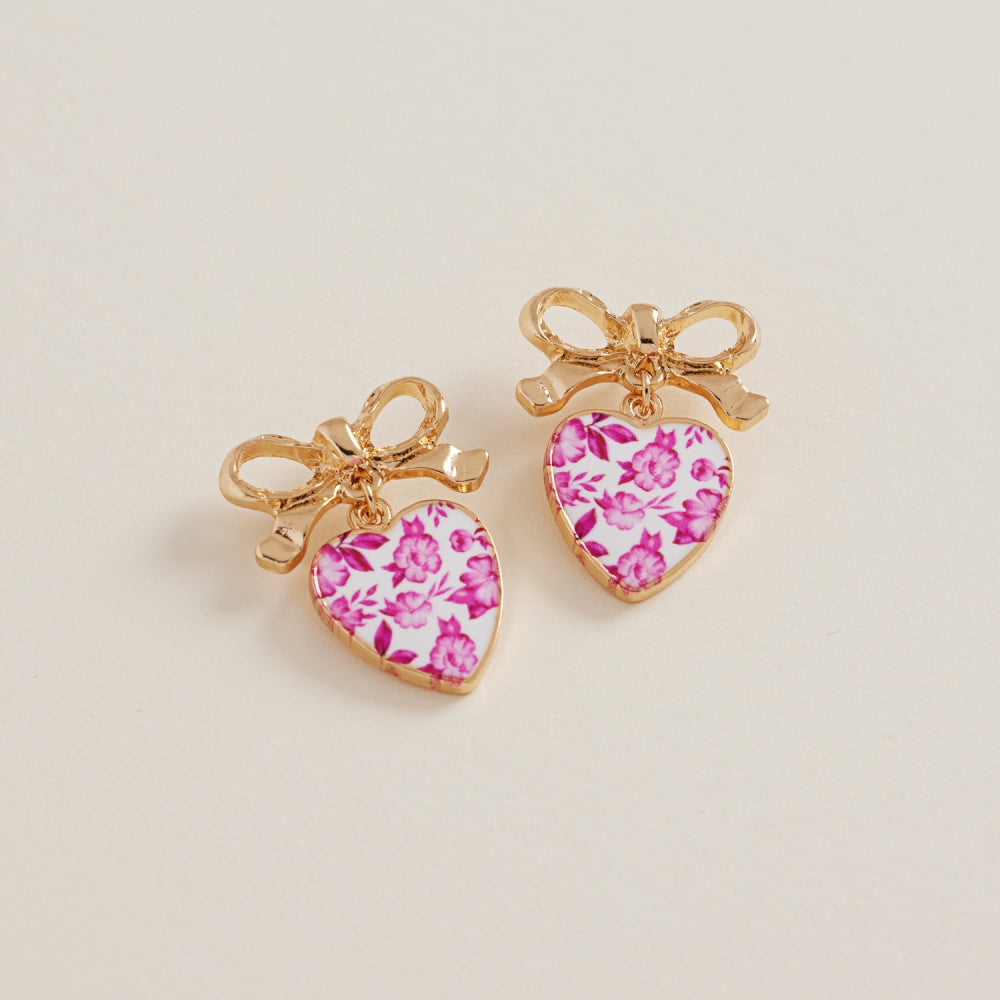 Heart Pattern Enamel Charm Metal Bow Post Earrings