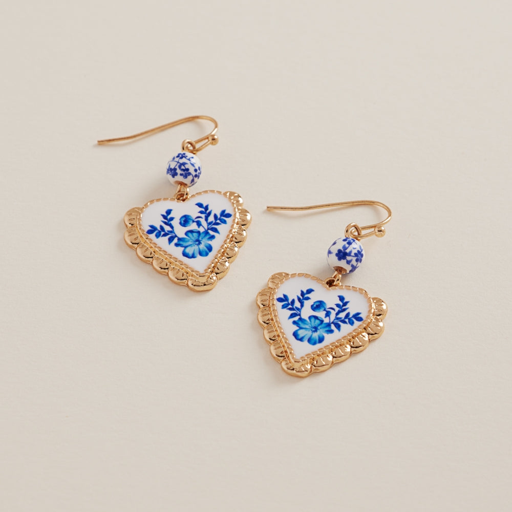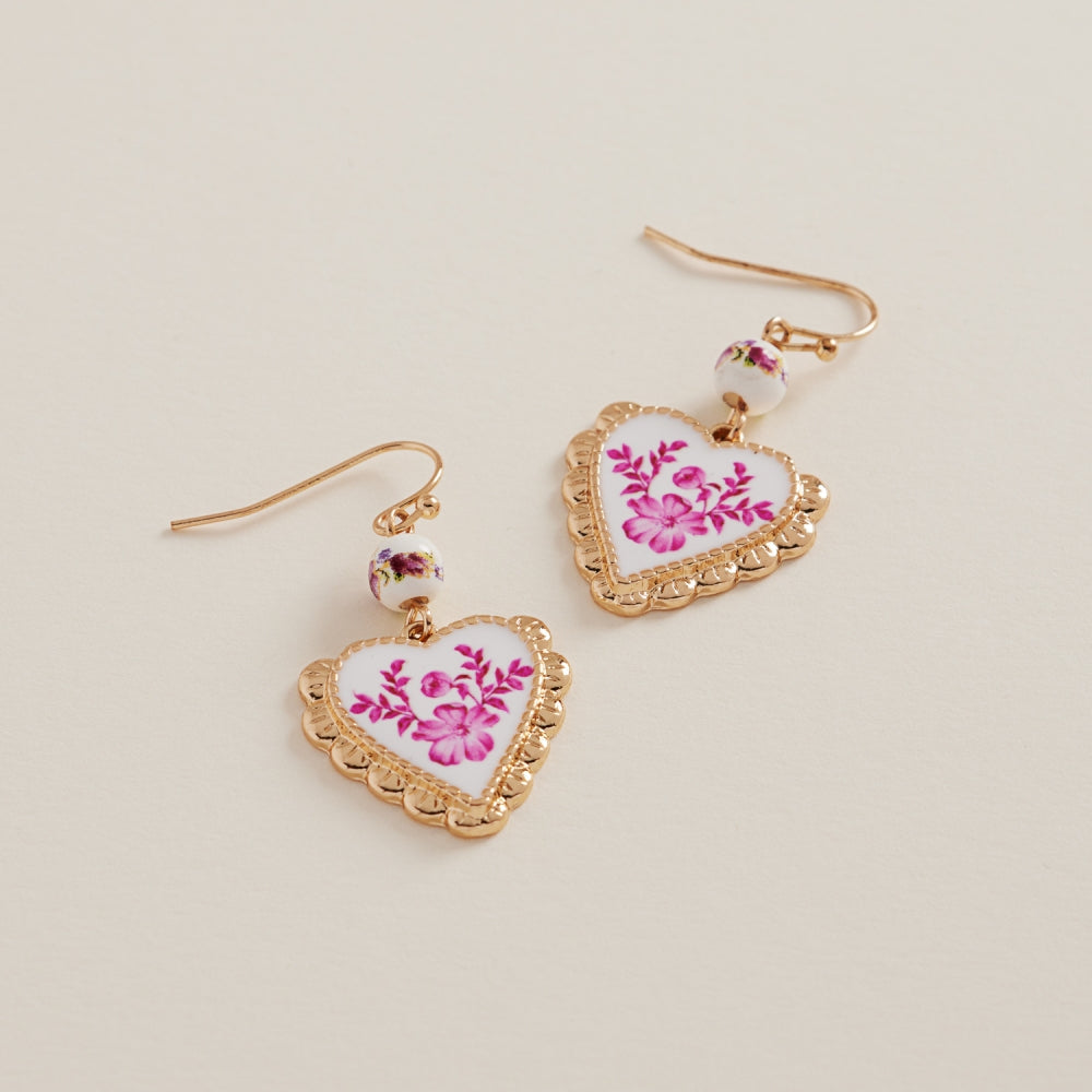 Heart Print Enamel Charm Ceramic Bead Earrings