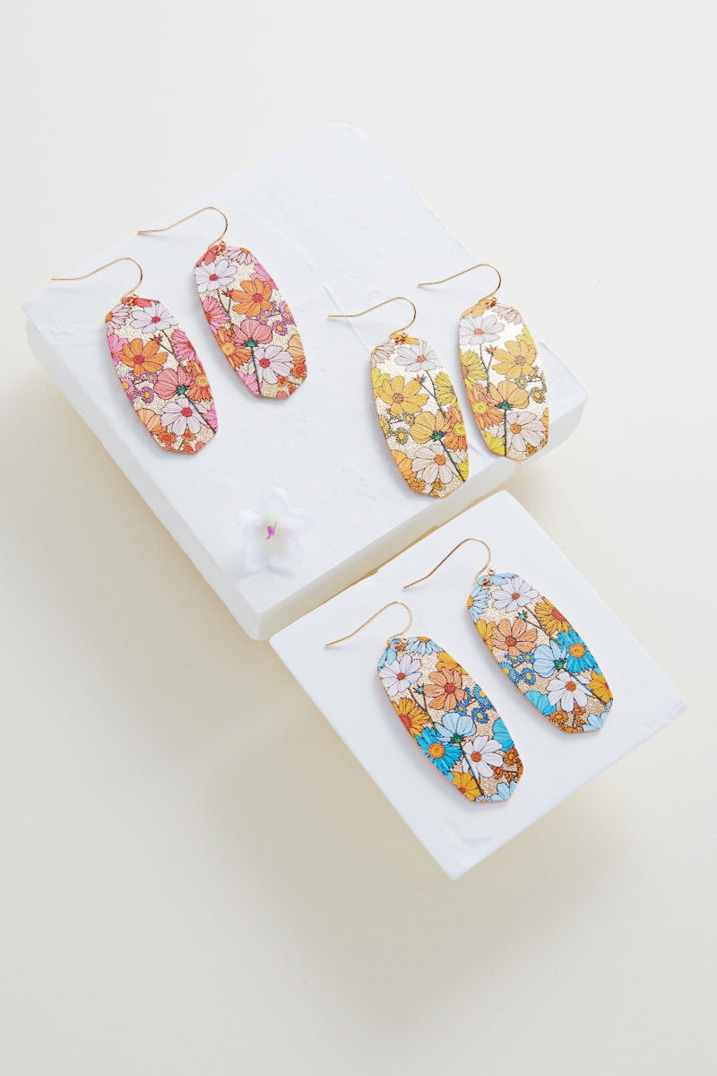 These earrings feature a unique and elegant hexagon shape, adorned with a beautiful floral design. Made from high-quality materials, they offer a stylish and trendy addition to any outfit. Perfect for adding a touch of sophistication to any occasion.
