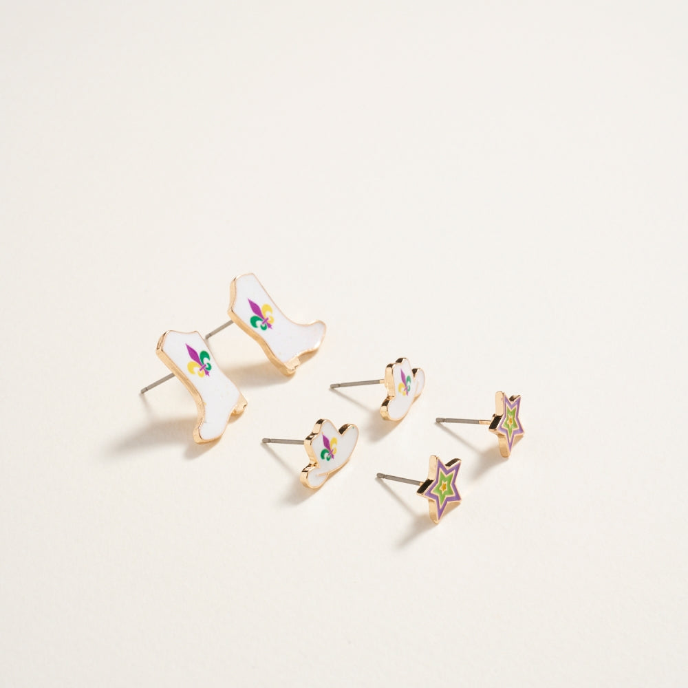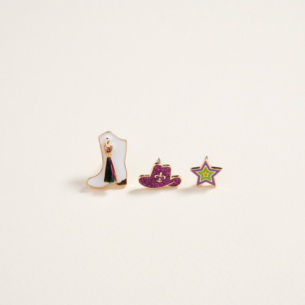 Mardi Gras Hat Boot Star Western 3PC Set Earrings