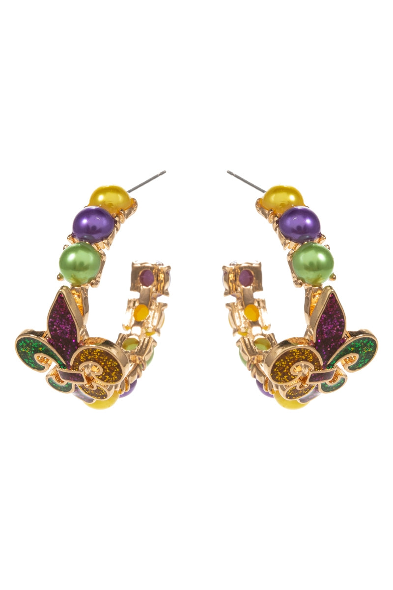 Mardi Gras Pearl Enamel Fleur De Lis Hoop Earrings