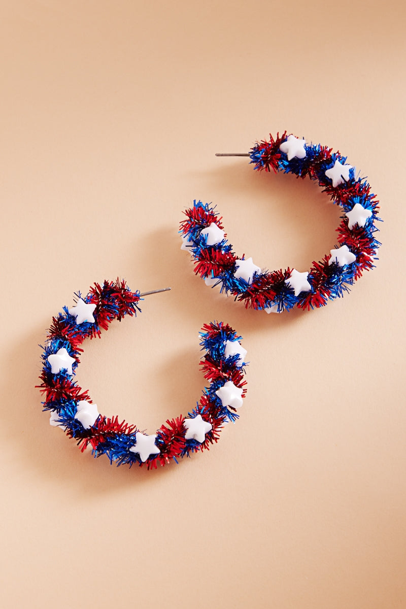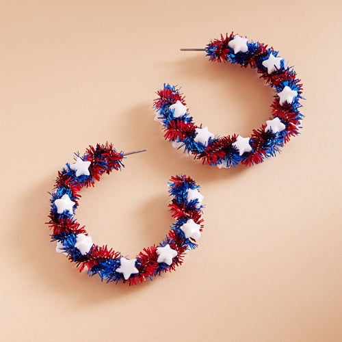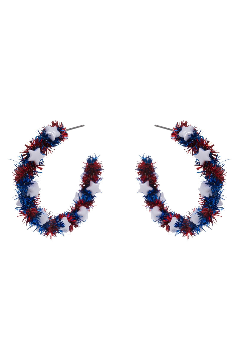 Expertly crafted with a 1.75 inch metallic thread and hypoallergenic titanium post, these hoop earrings feature an eye-catching American flag design. Lightweight and comfortable for all-day wear, these earrings are perfect for showing off your patriotism with style.