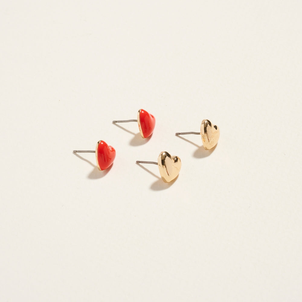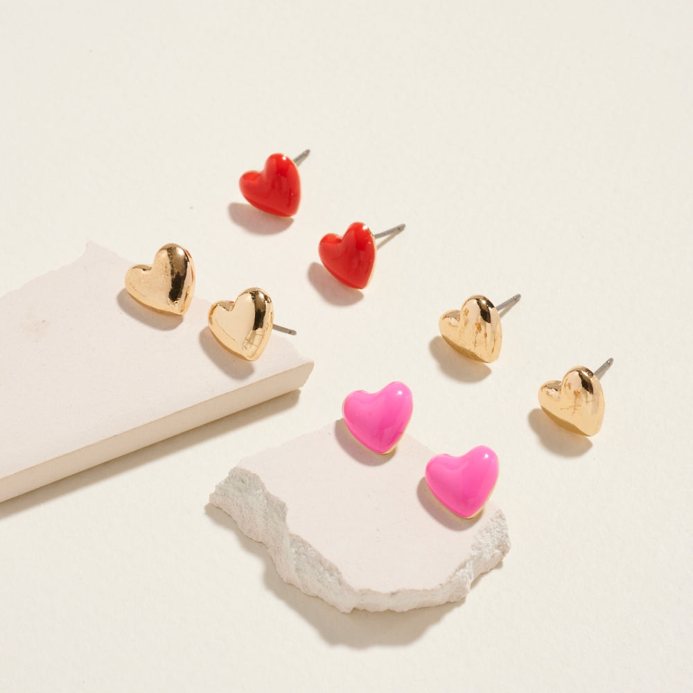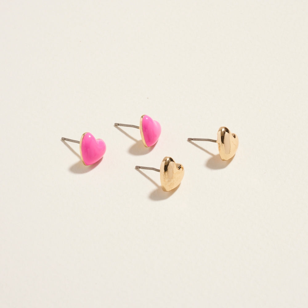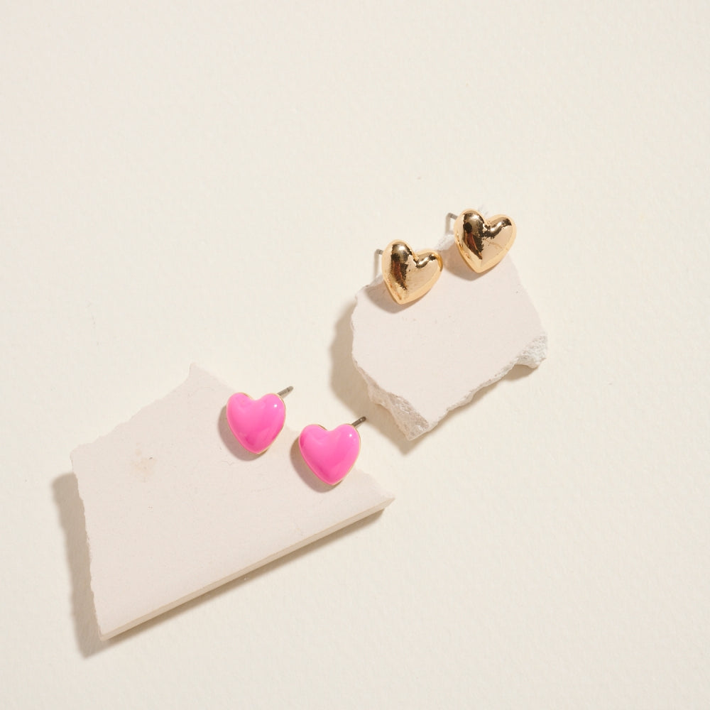 These earrings showcase smooth heart studs in a shiny metallic finish for a simple yet eye-catching look. Perfect for everyday wear or as a sweet Valentine's Day surprise.