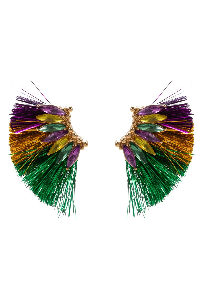 These 2.25 inch hypoallergenic titanium post earrings feature an organic shape with vibrant Mardi Gras colors, metallic threading, and sparkling stones. Expertly crafted, they provide a bold and stylish statement while being gentle on sensitive skin.