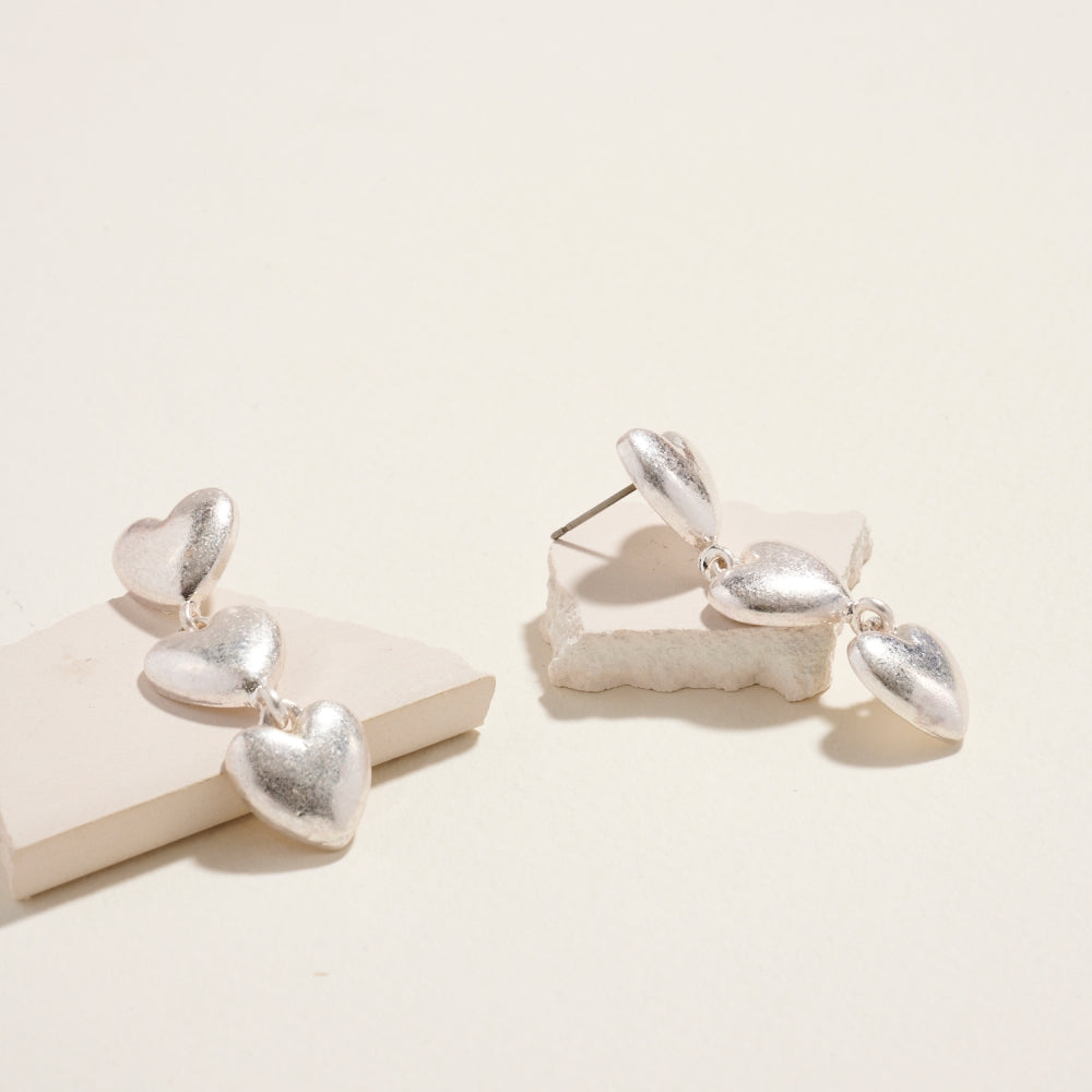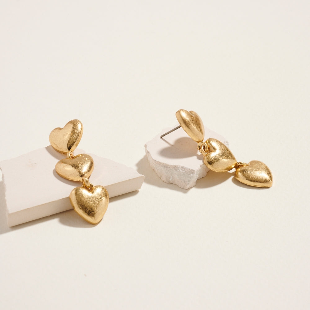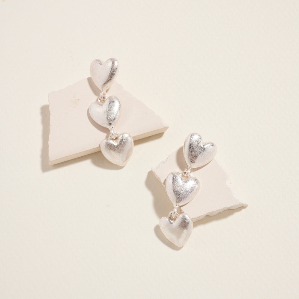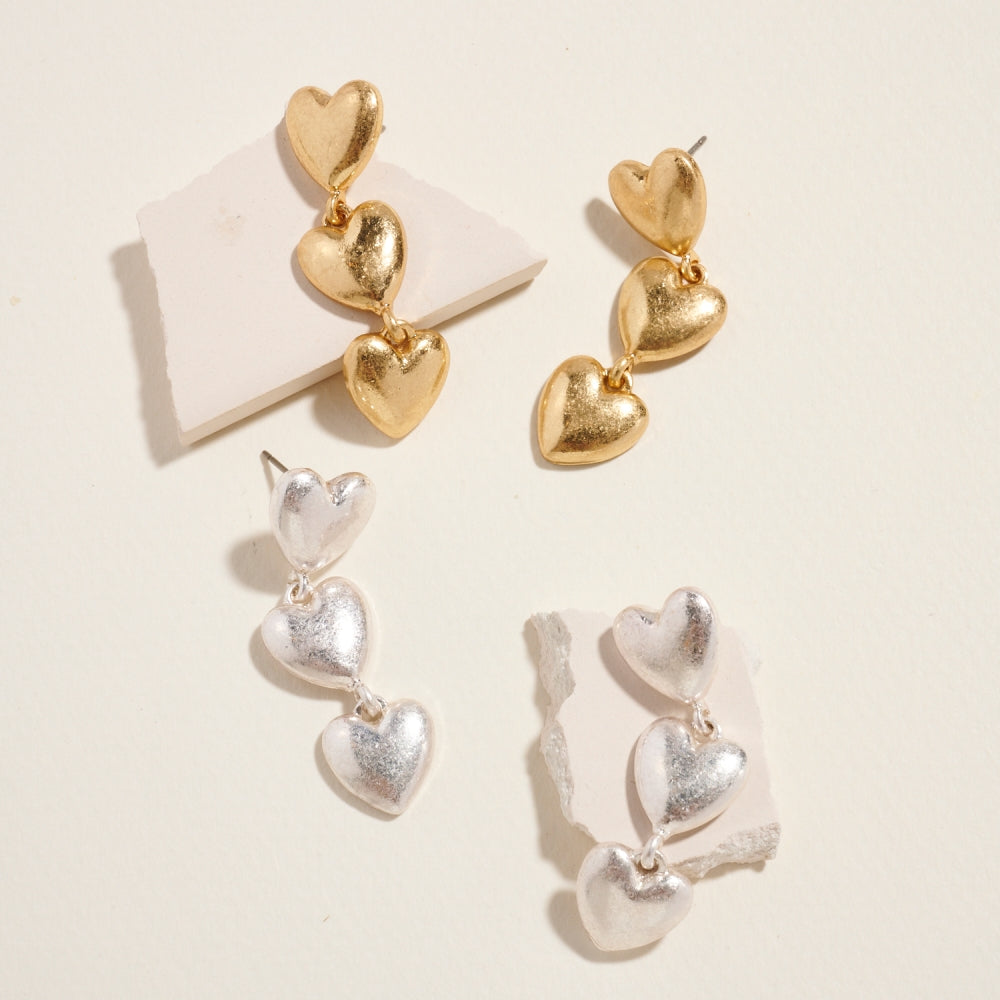 Fall in love with these drop earrings featuring a cascading trio of puffed hearts. A bold and romantic design that's perfect for Valentine's Day celebrations or gifting.