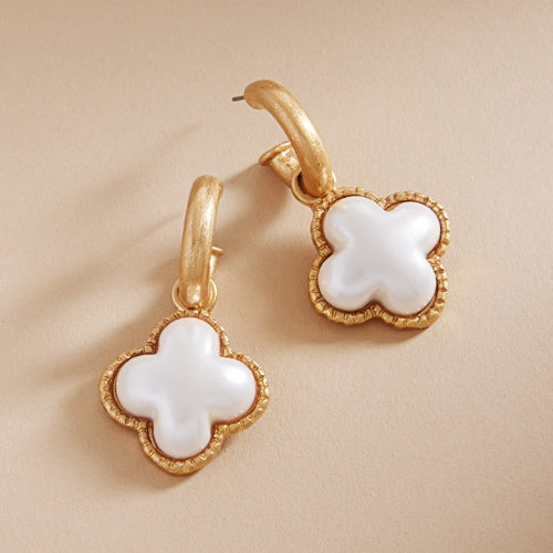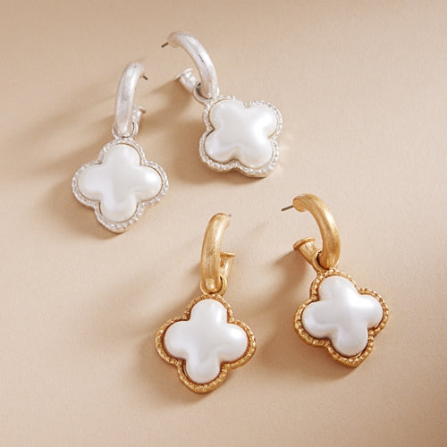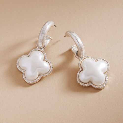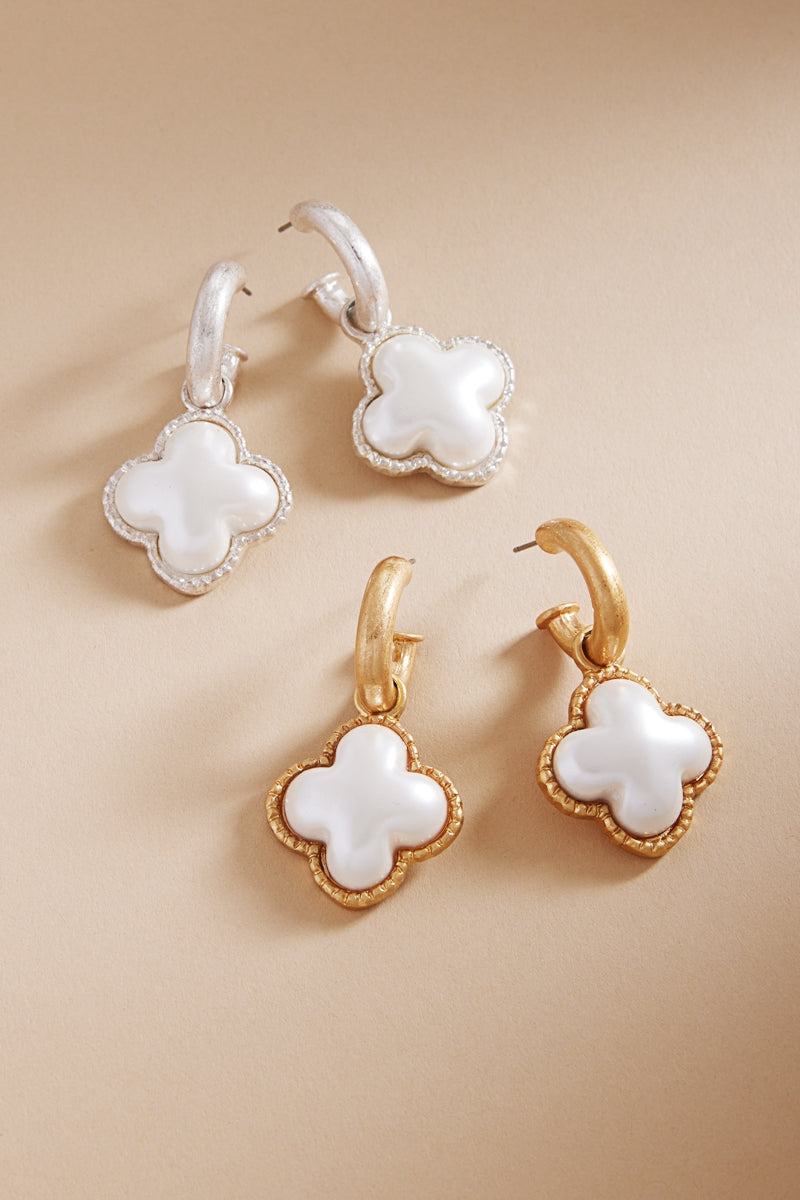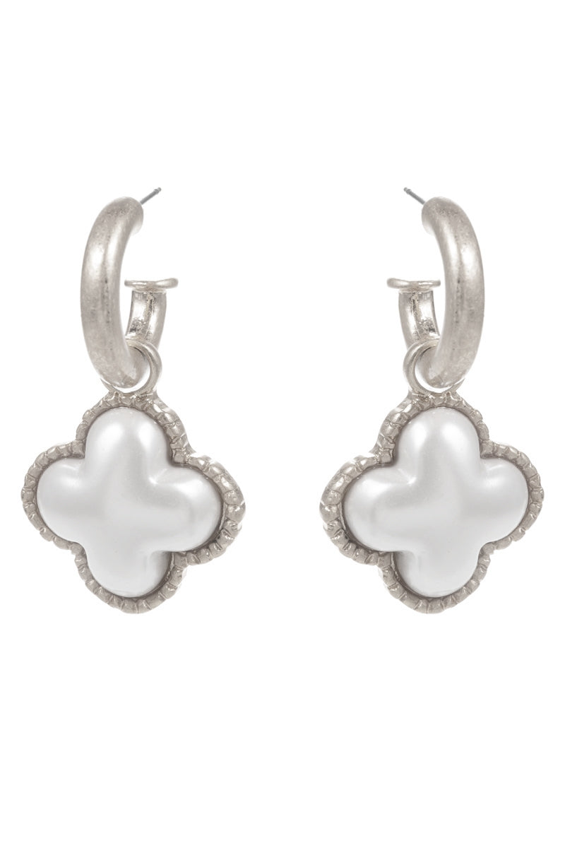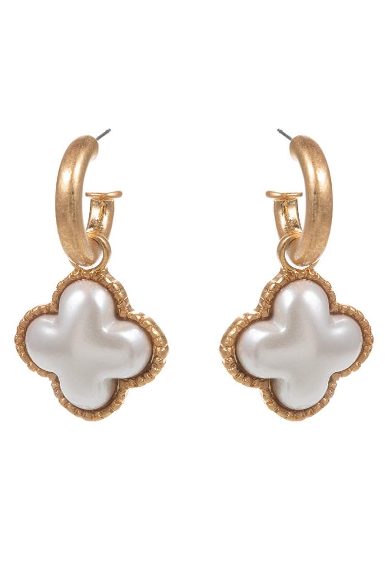 Quatrefoil Pearl Cabochon Post Pin Hoop Earrings
