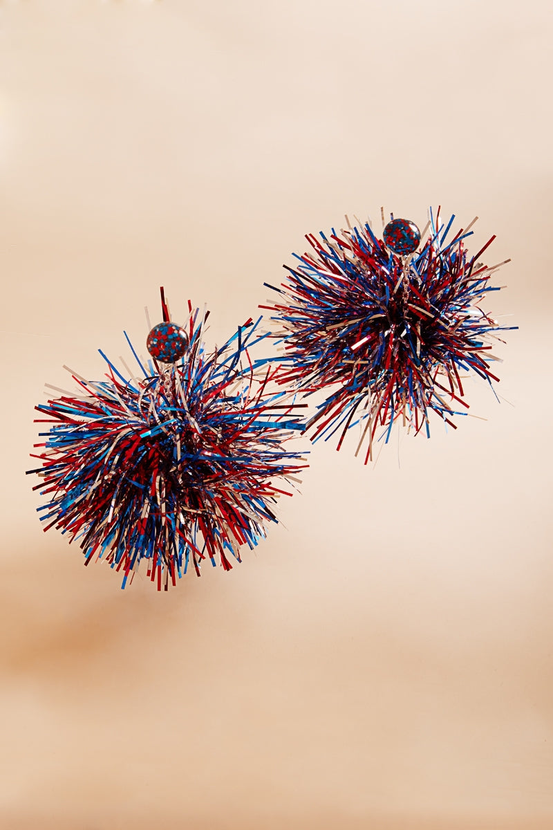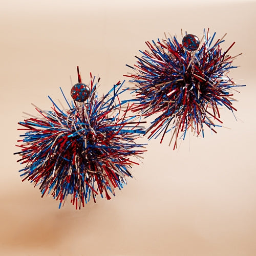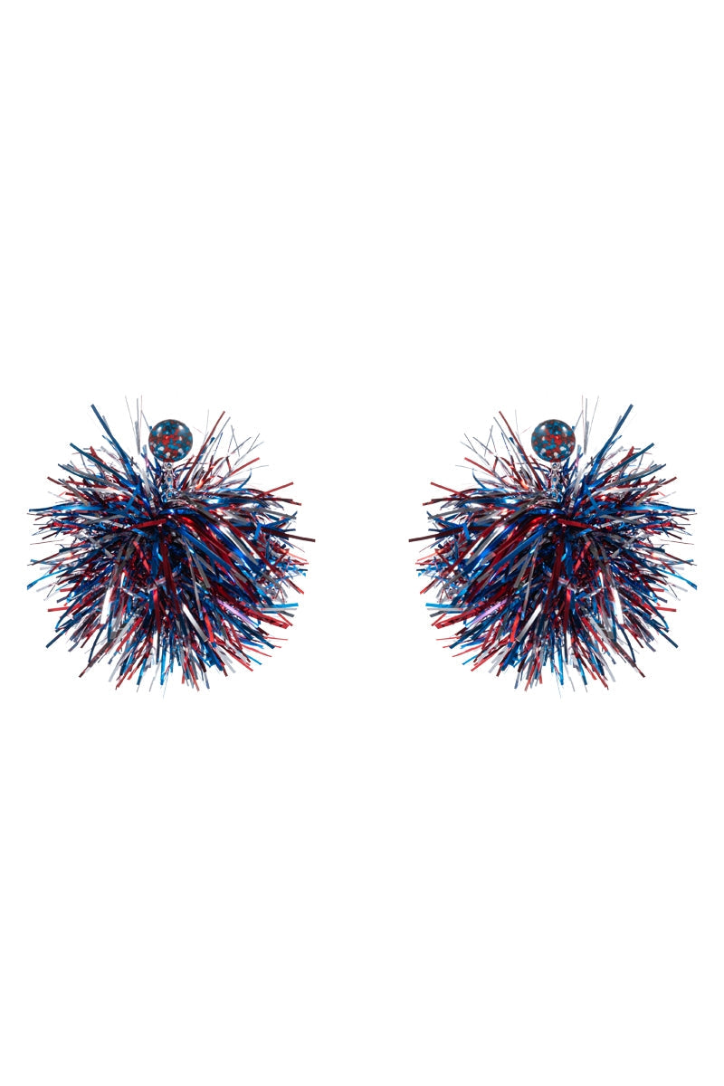 These hypoallergenic earrings feature a 3 inch round glitter cabochon with an American flag design and a colorful pompom. Made with titanium posts, these earrings are safe for sensitive ears. Add a touch of sparkle and patriotism to your outfit with these stylish and comfortable earrings.