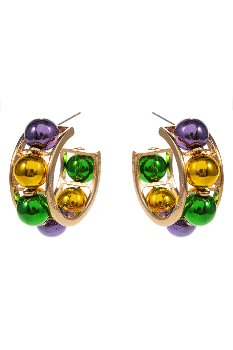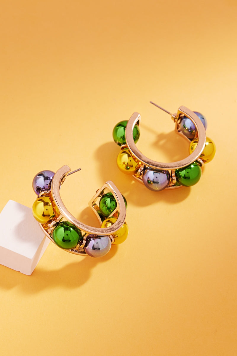 Round Mardi Gras Color Metalic Beads Hoop Earrings