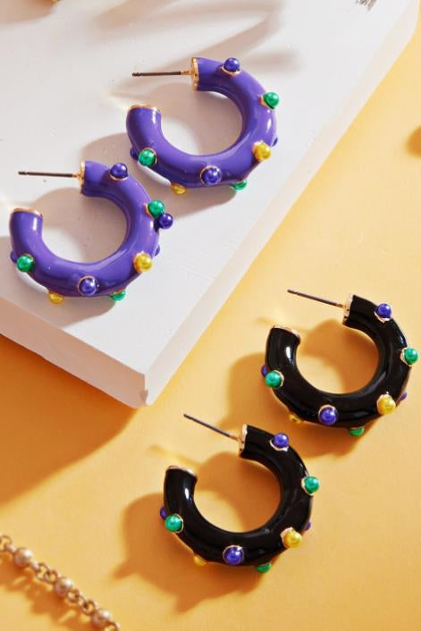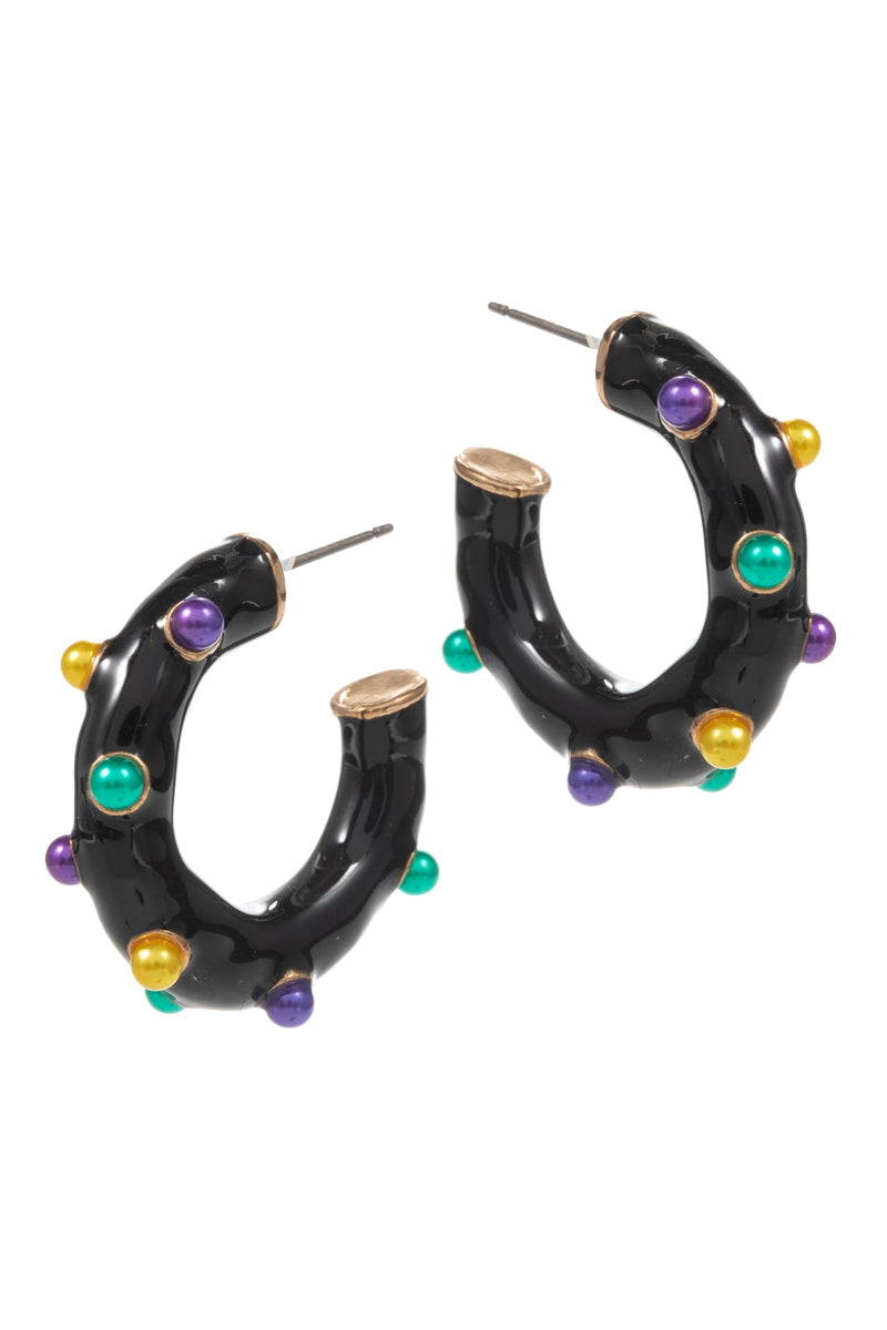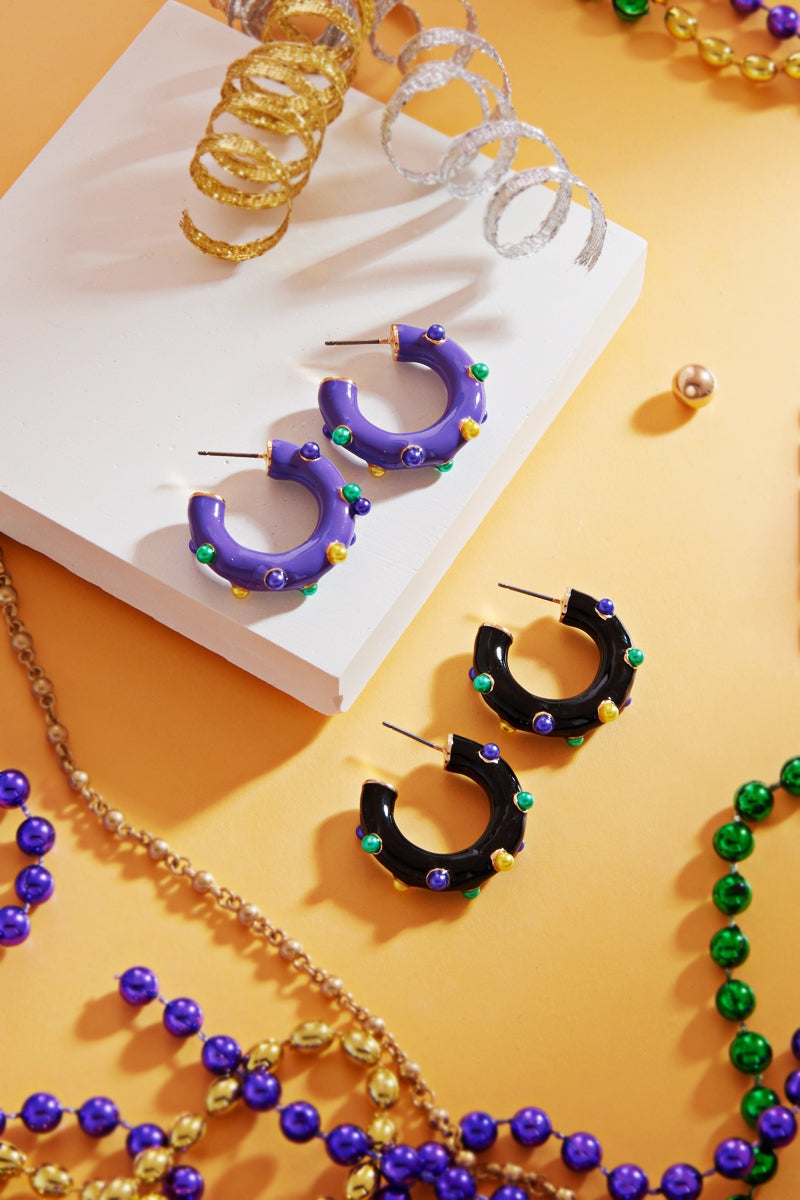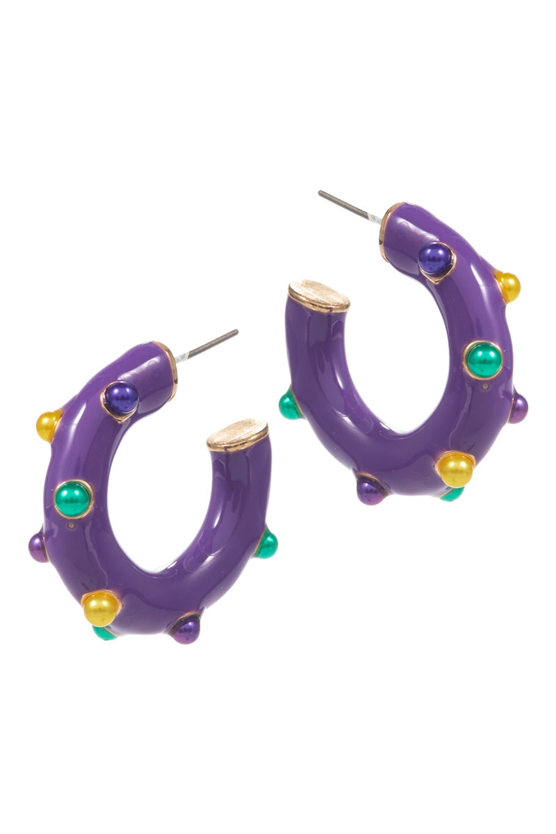 Round Mardi Gras Color Pearls Enamel Hoop Earrings
