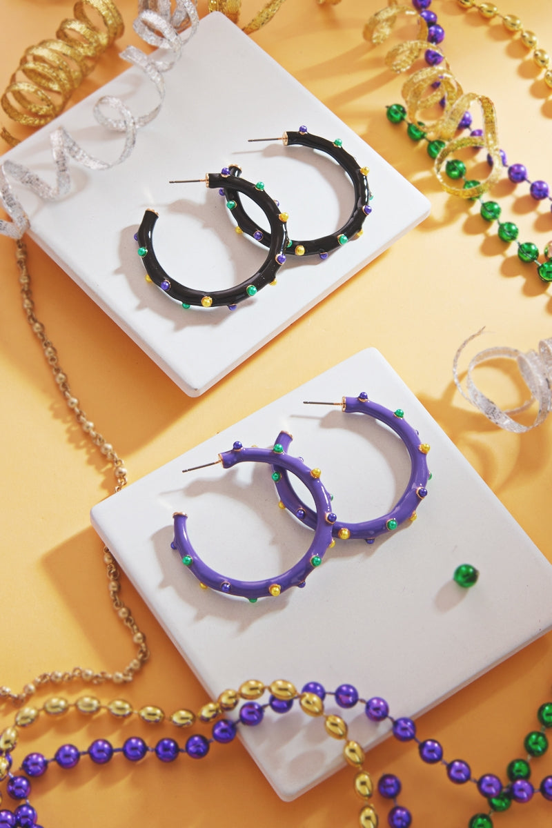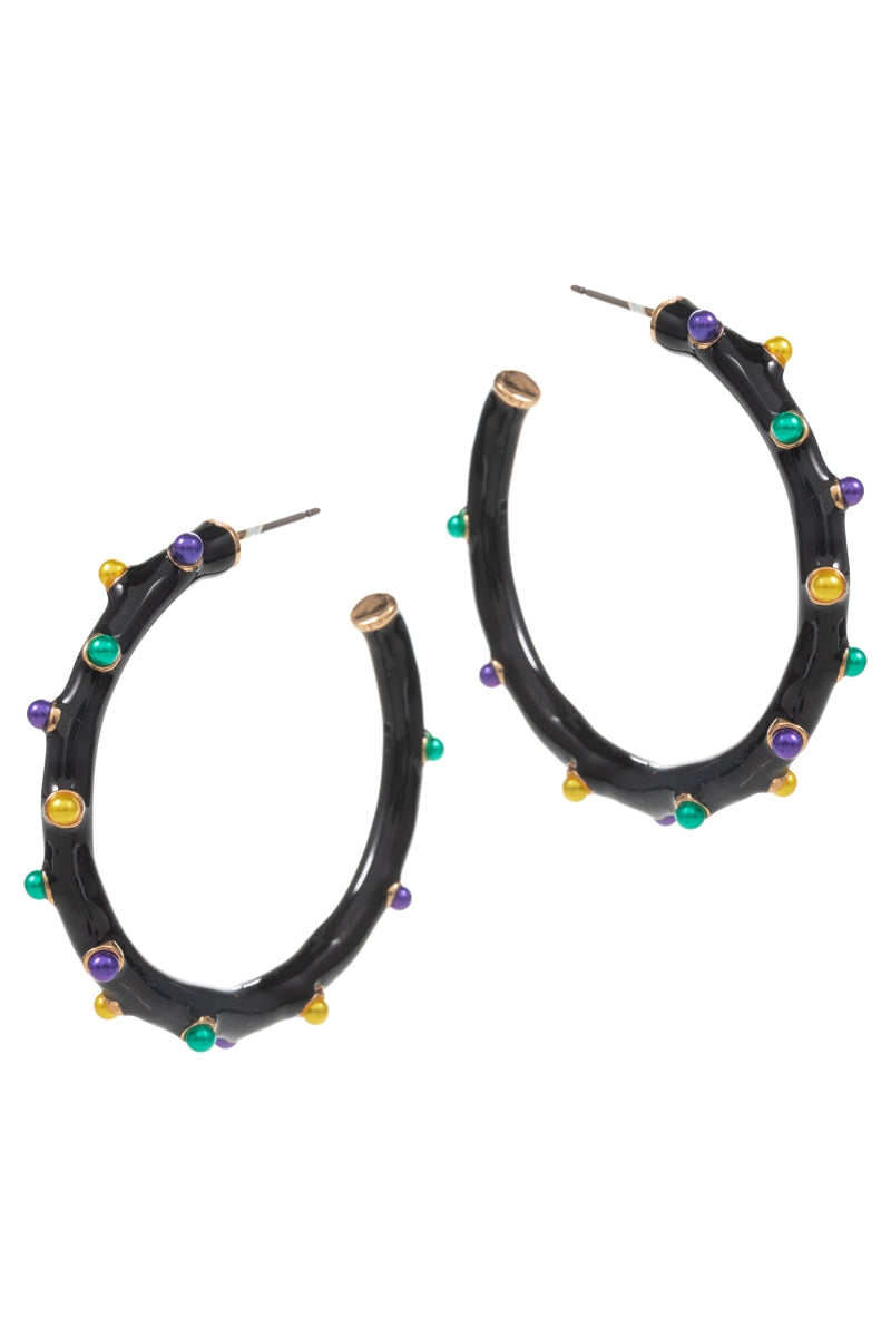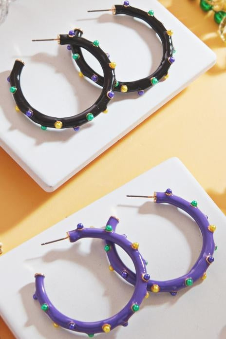 Round Mardi Gras Color Pearls Enamel Hoop Earrings