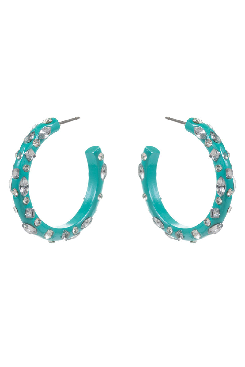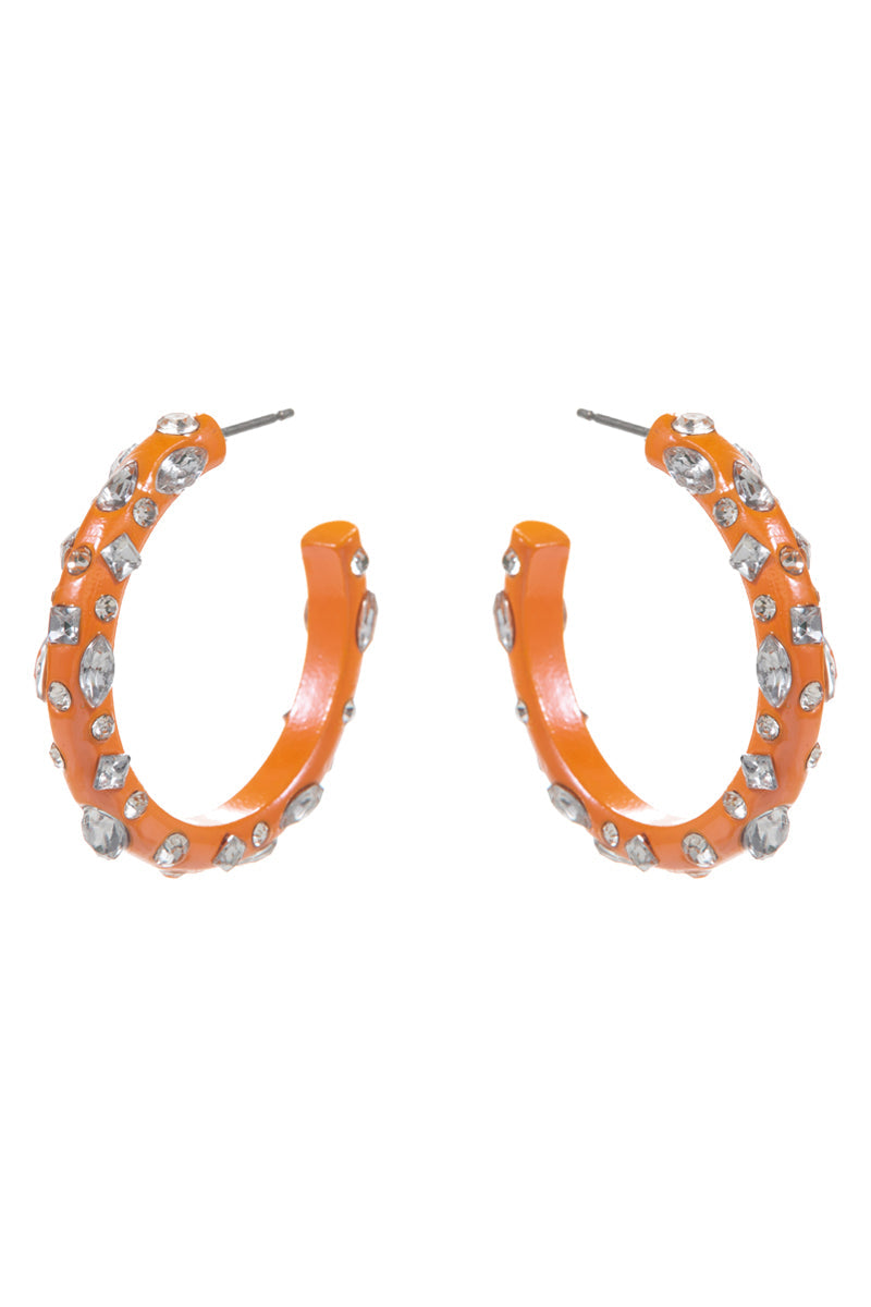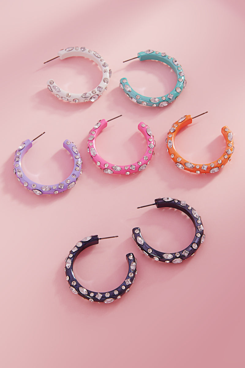 These elegant hoop earrings are 1.5 inches in diameter and feature a shiny color coating with sparkling stones. Add a touch of sophistication to any outfit with these stylish accessories. Perfect for any occasion, from casual to formal.