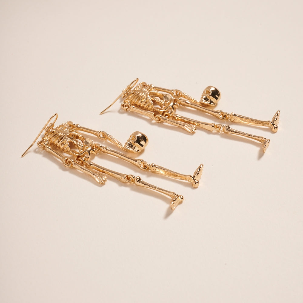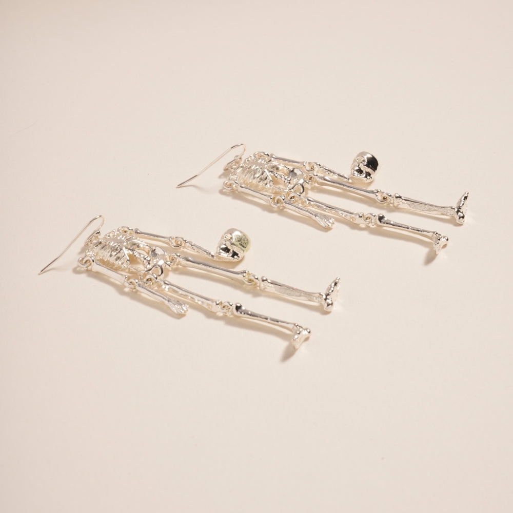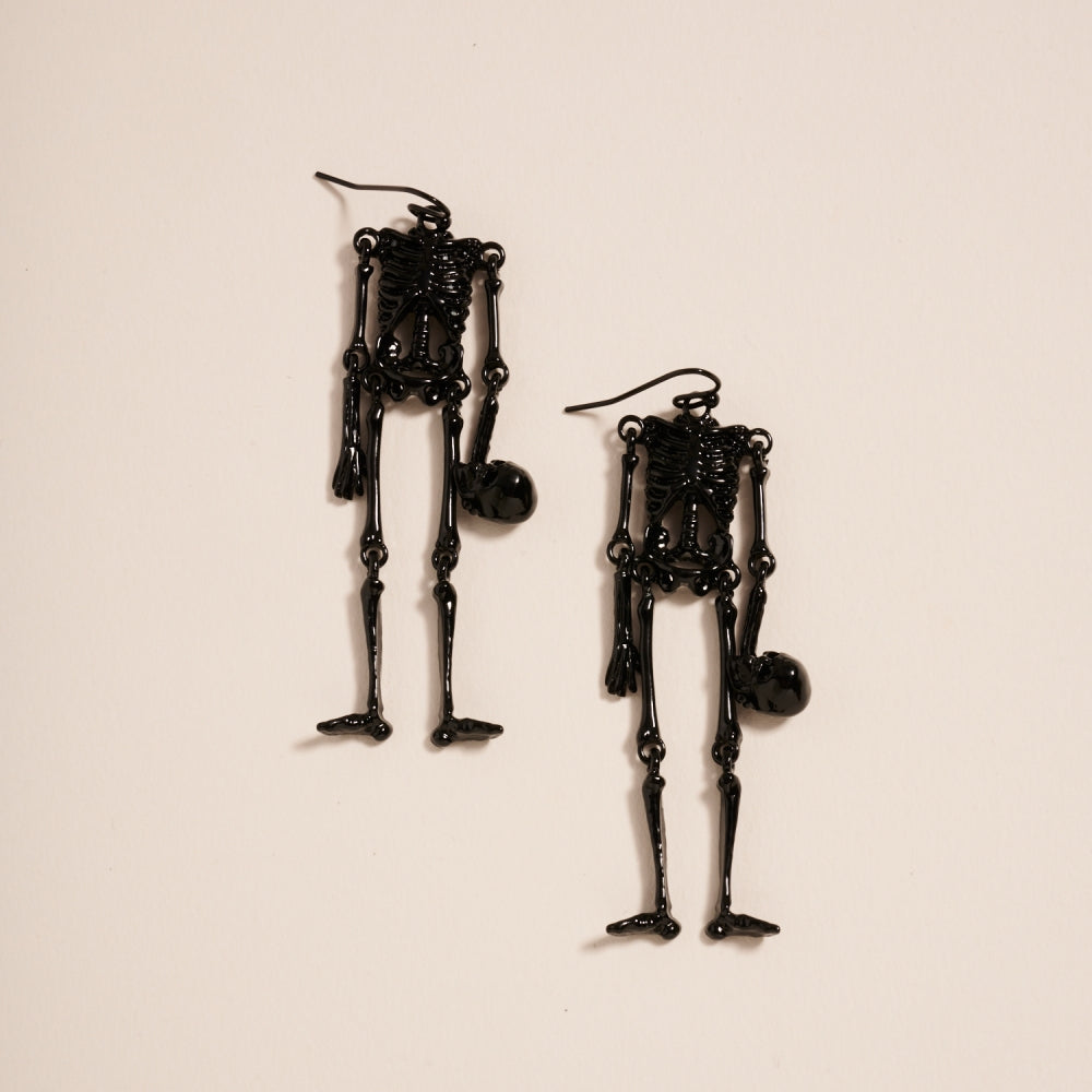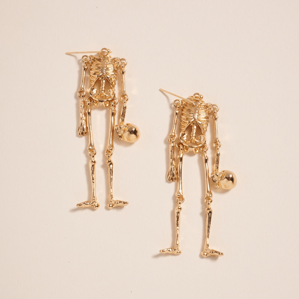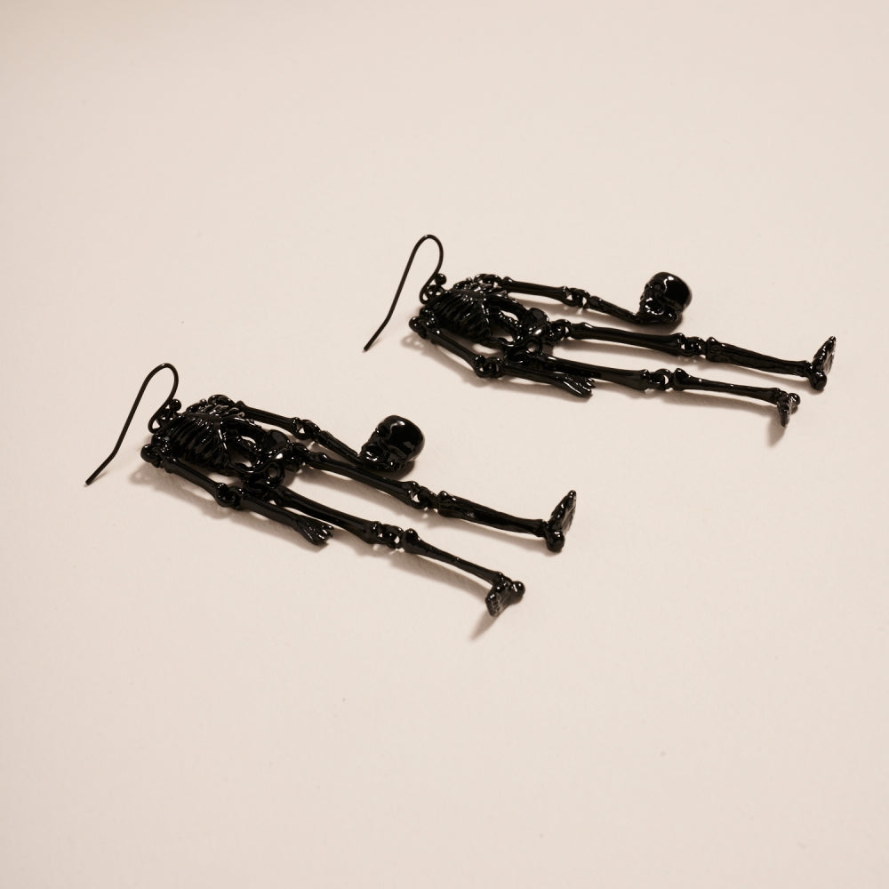 These dangling earrings feature a detailed skeleton clutching a skull. A fun and eerie piece perfect for Halloween or gothic-inspired styles.