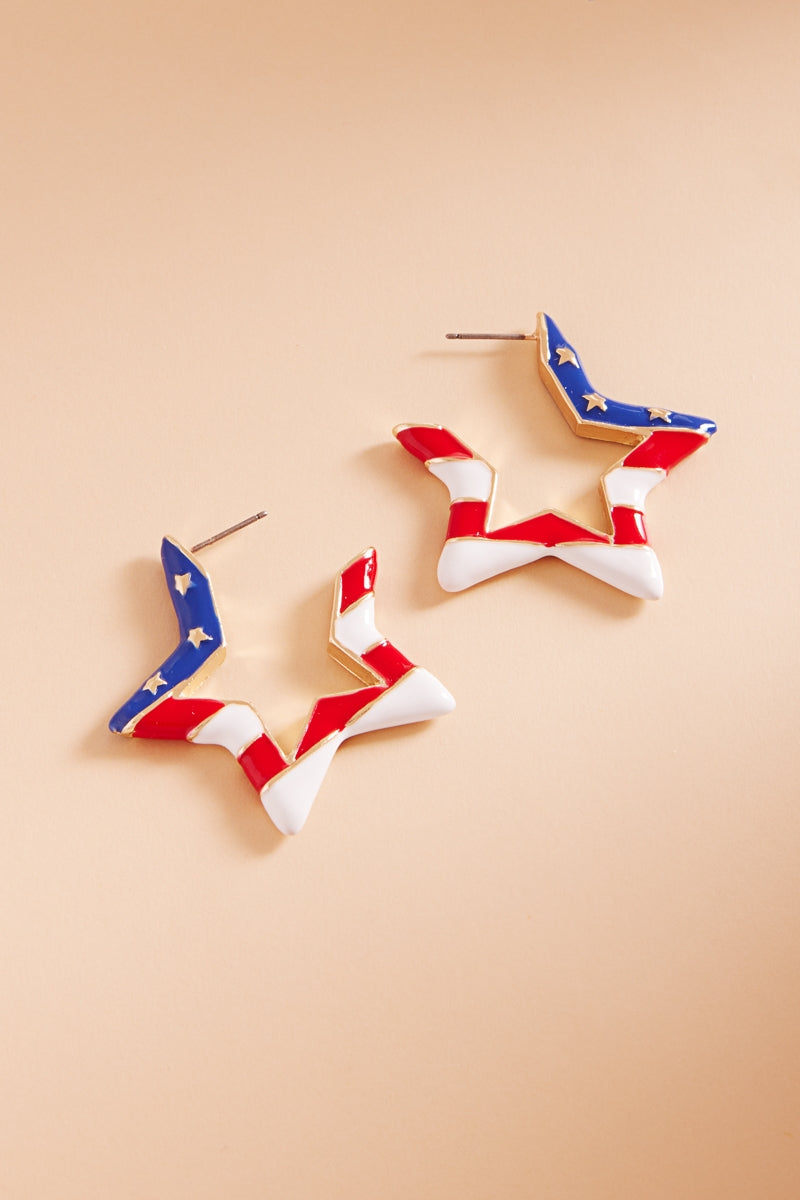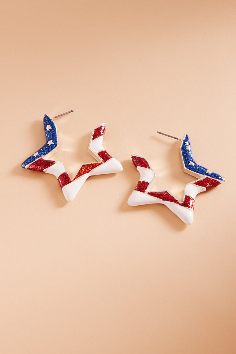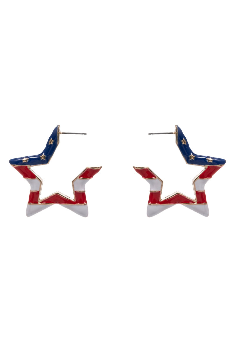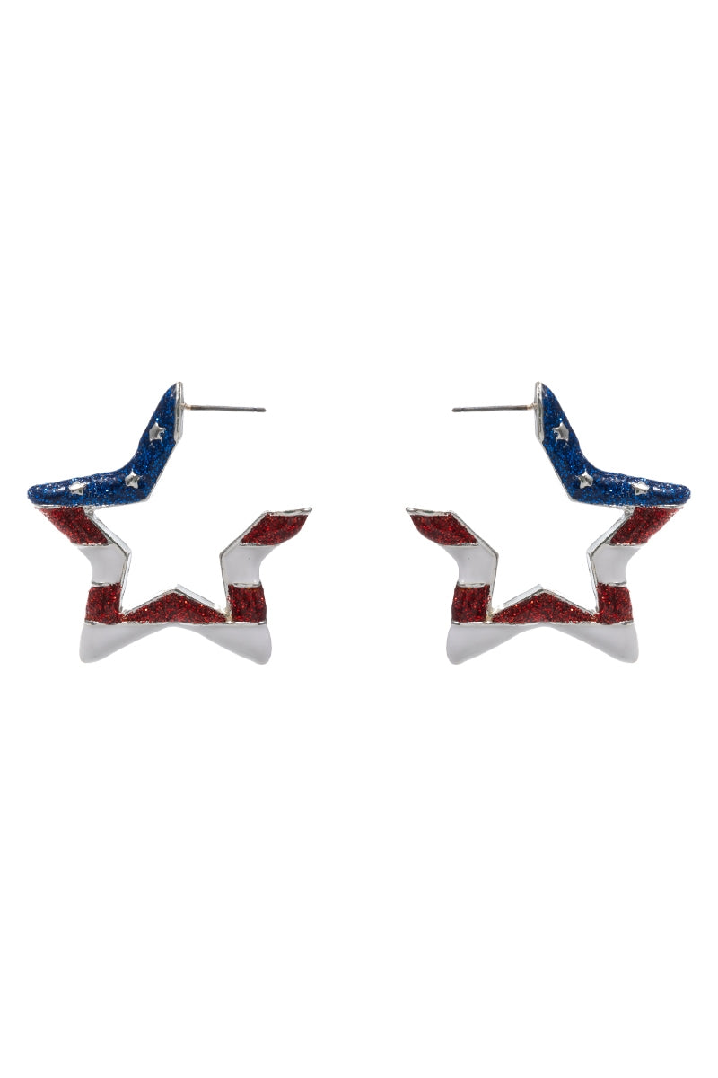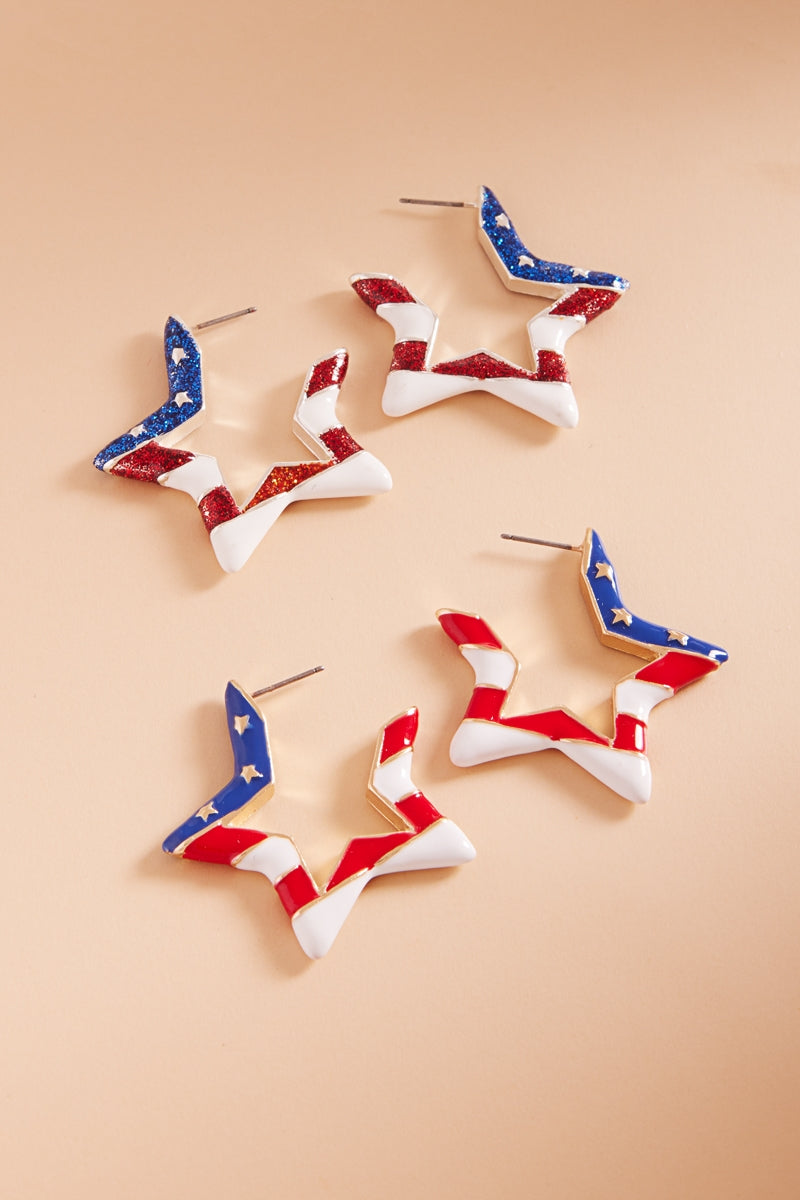 Add a patriotic touch to your style with our hypoallergenic titanium post pin hoop earrings. Featuring a 1.5 inch star shape with a striking American flag pattern, these earrings are perfect for any occasion. Durable and eye-catching, these earrings are a must-have for any jewelry collection.