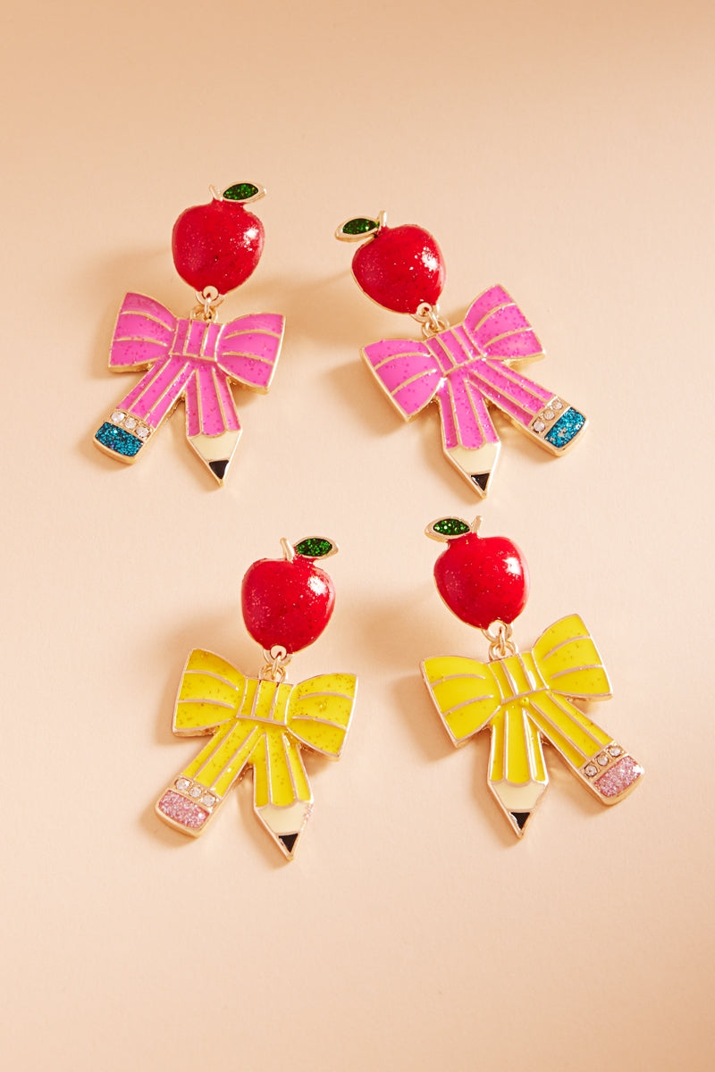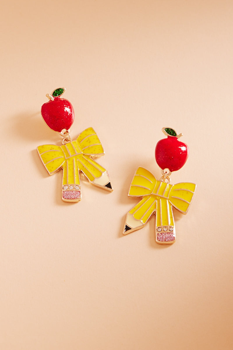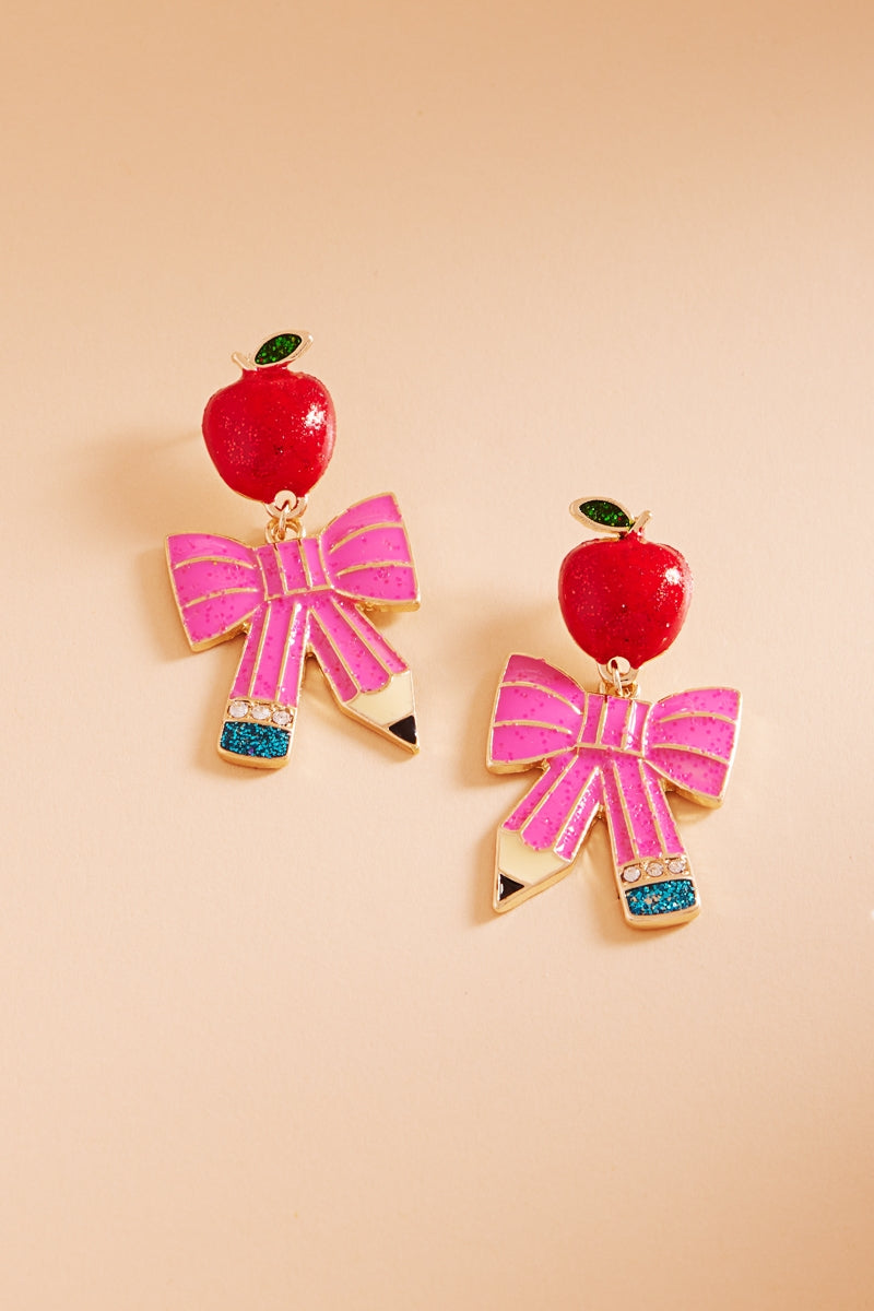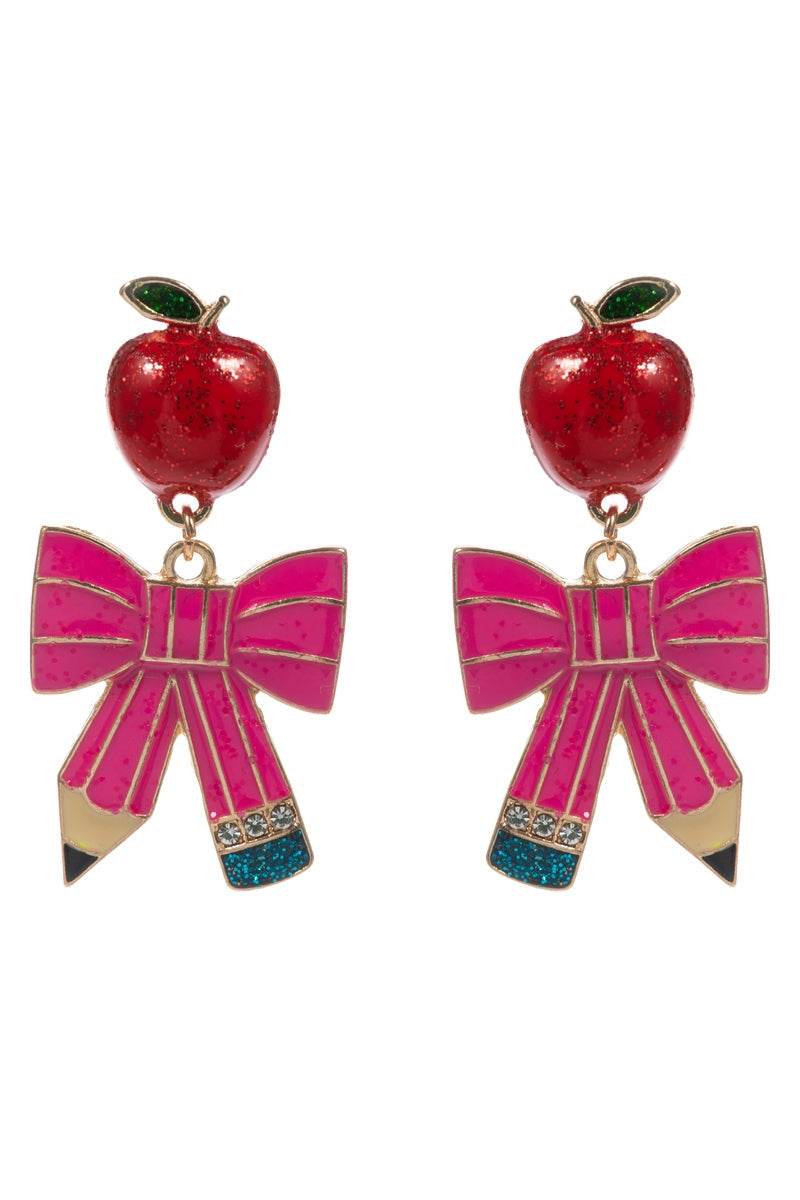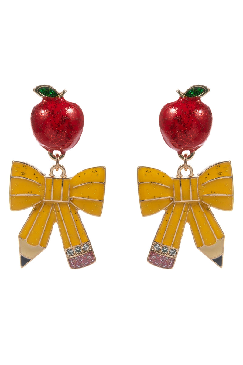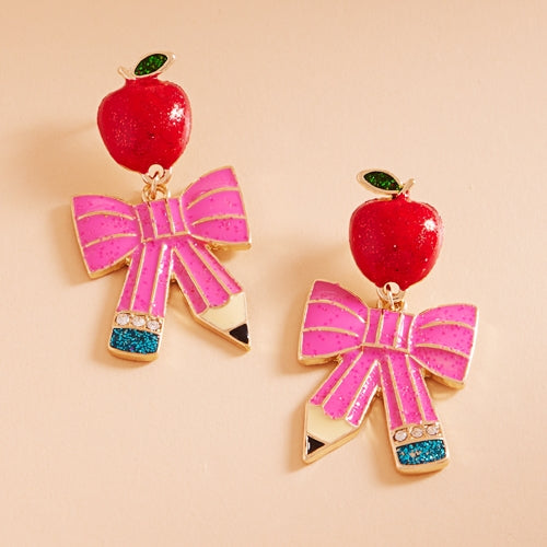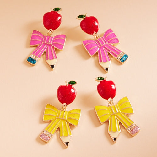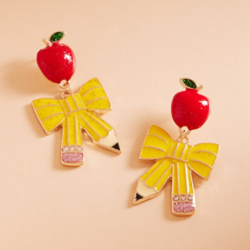 Teachers Day Bow Enamel Pencil Apple Post Earrings