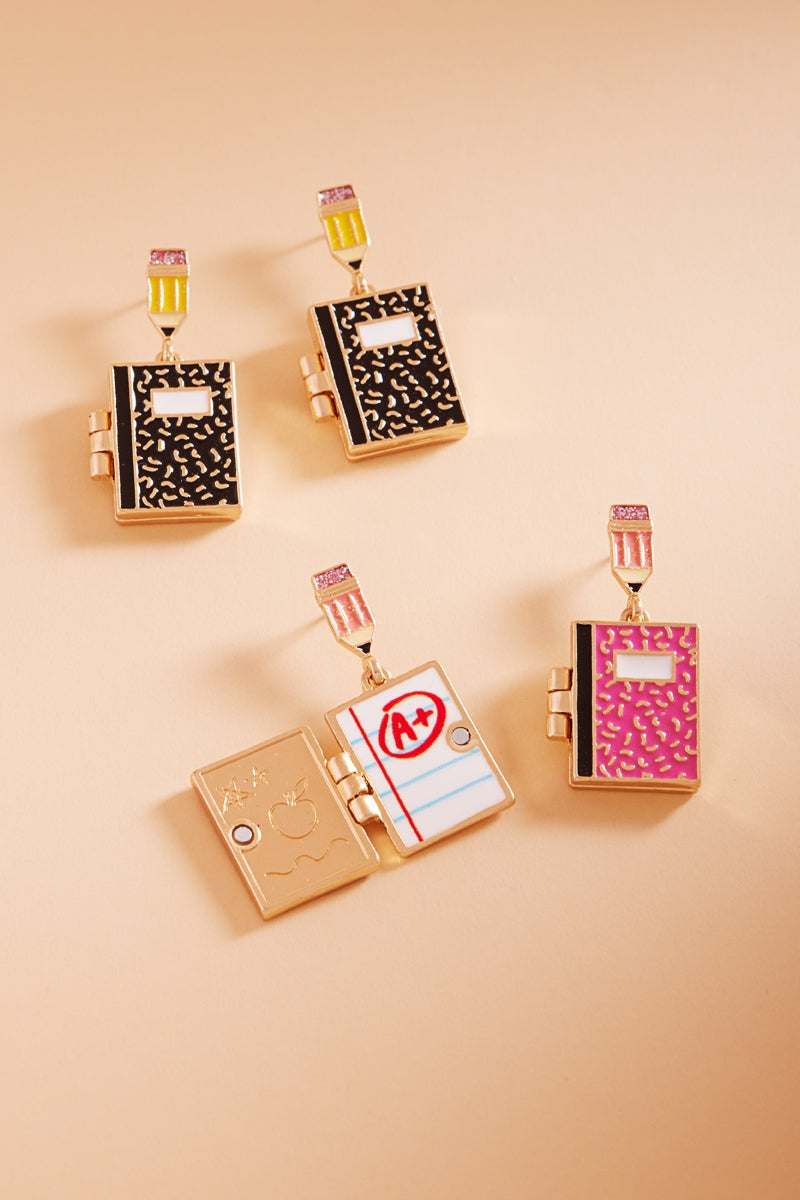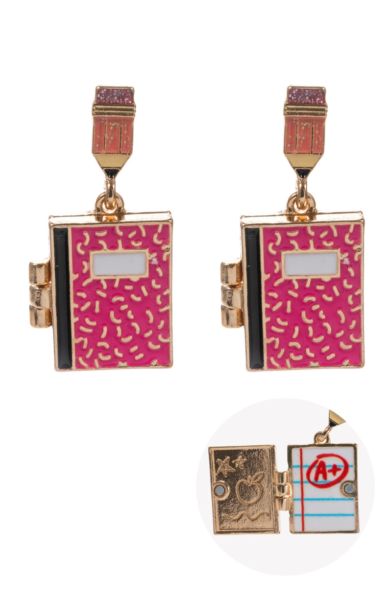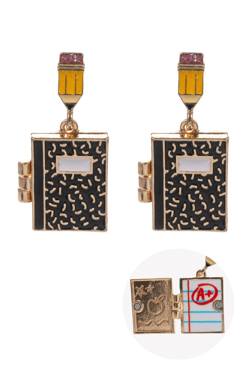 Enhance your style with these chic 1.5 inch notebook enameled locket earrings. Made with hypoallergenic titanium posts and featuring a charming pencil design, these earrings are perfect for everyday wear. Stay comfortable and fashionable with this unique accessory.