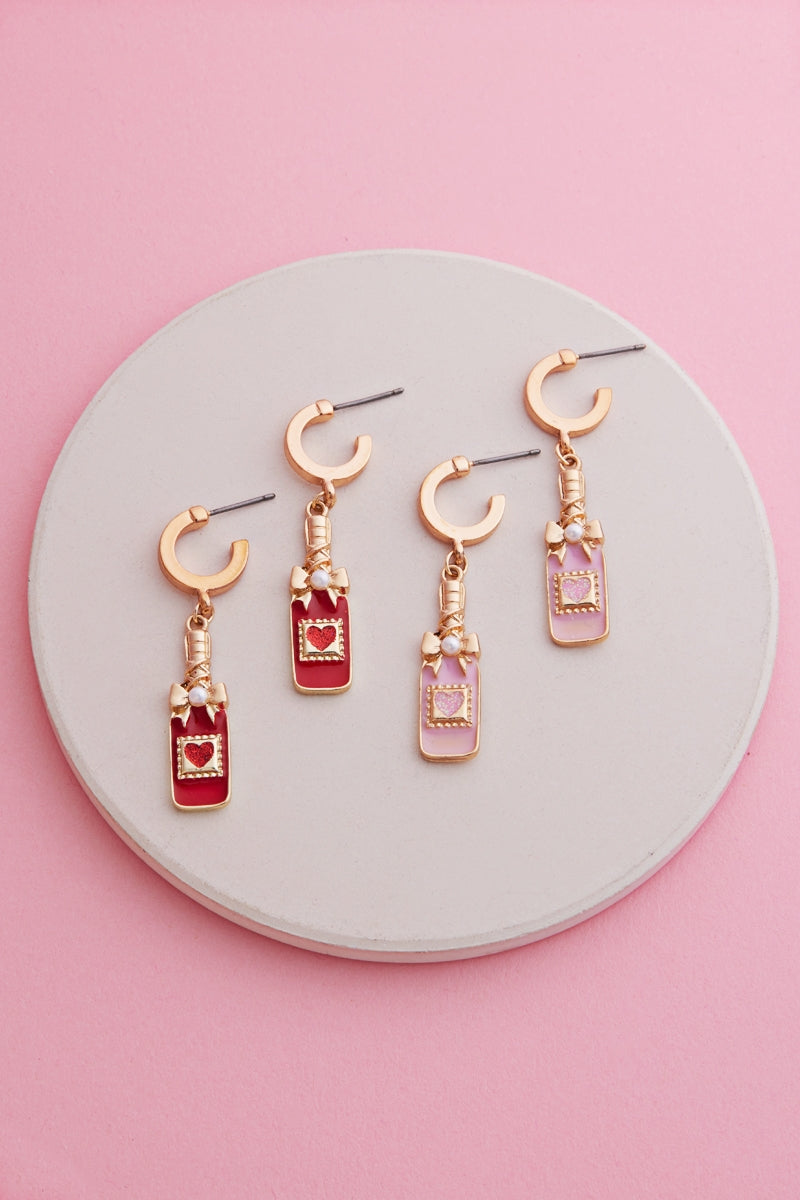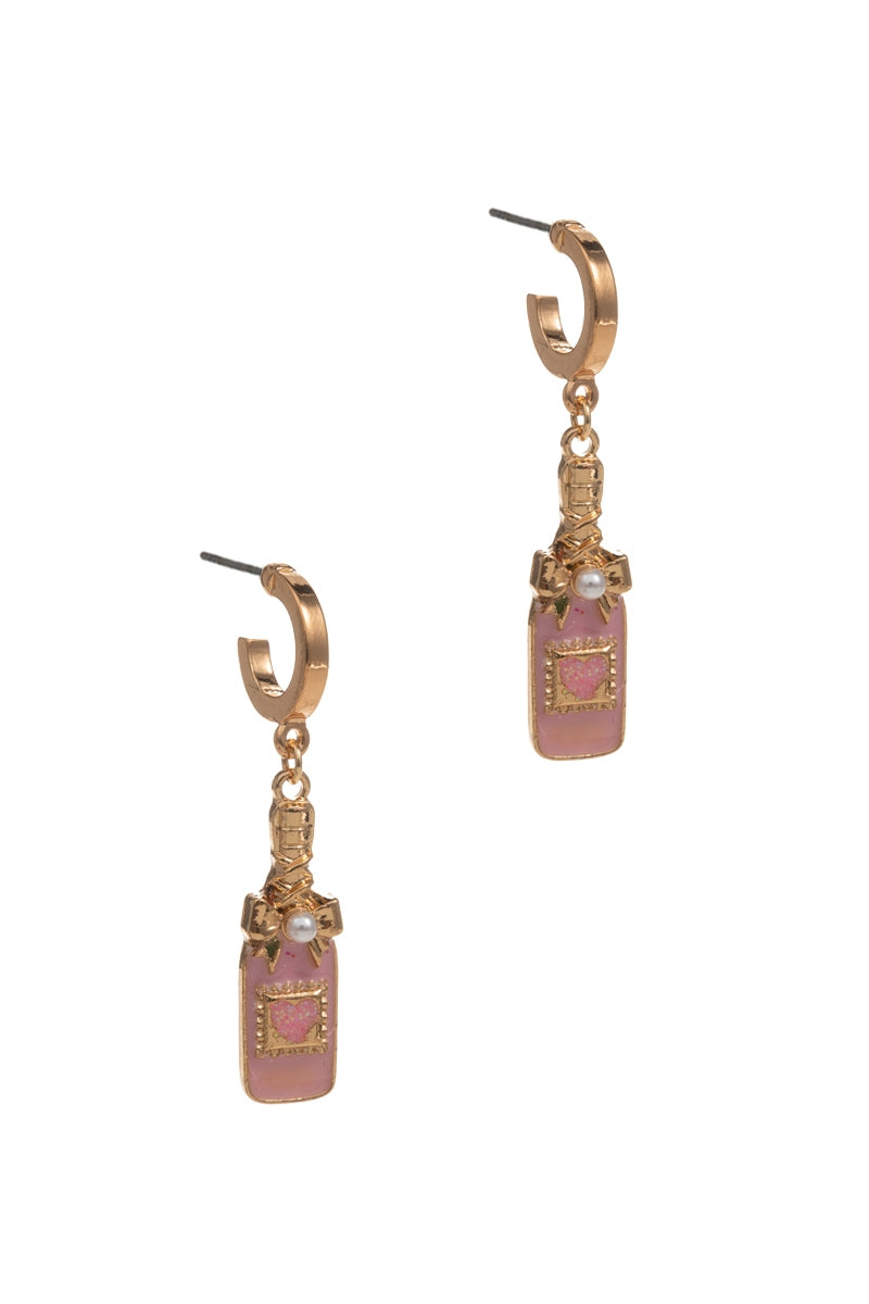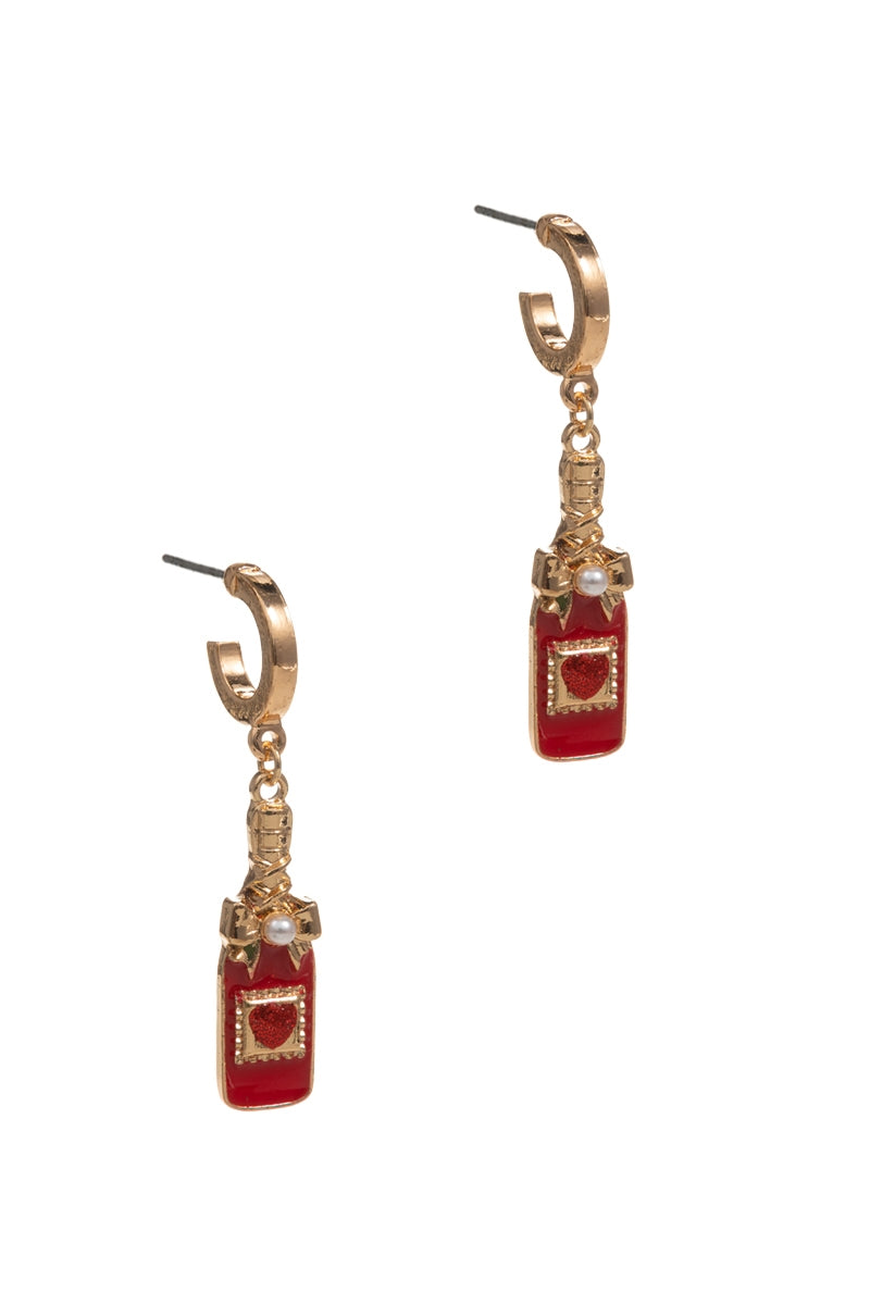 These 1.75 inch champagne bottle enamel hoop earrings add a touch of sophistication to any outfit. Made with high-quality materials, these earrings are both stylish and durable. The perfect accessory for any event, these earrings are sure to make a statement.
