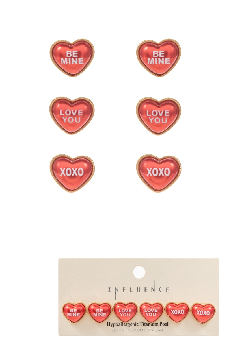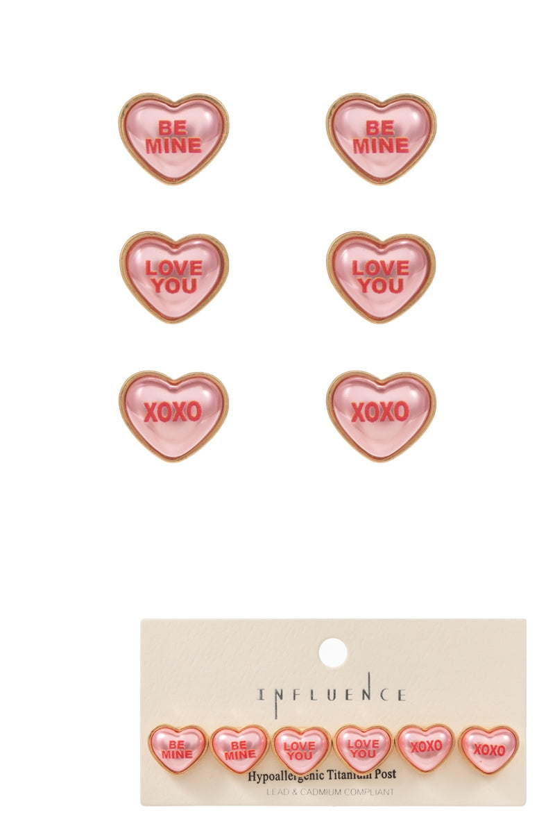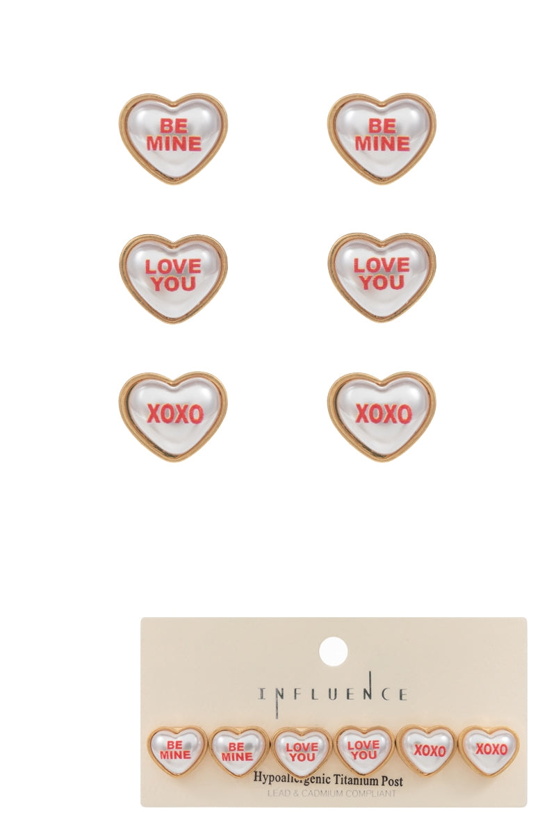 These 0.5 inch heart-shaped BE MINE, LOVE, and XOXO printed pearl post earrings are the perfect way to express your love. With their delicate and stylish design, they make a great addition to any outfit. Show your affection and style with these charming earrings.