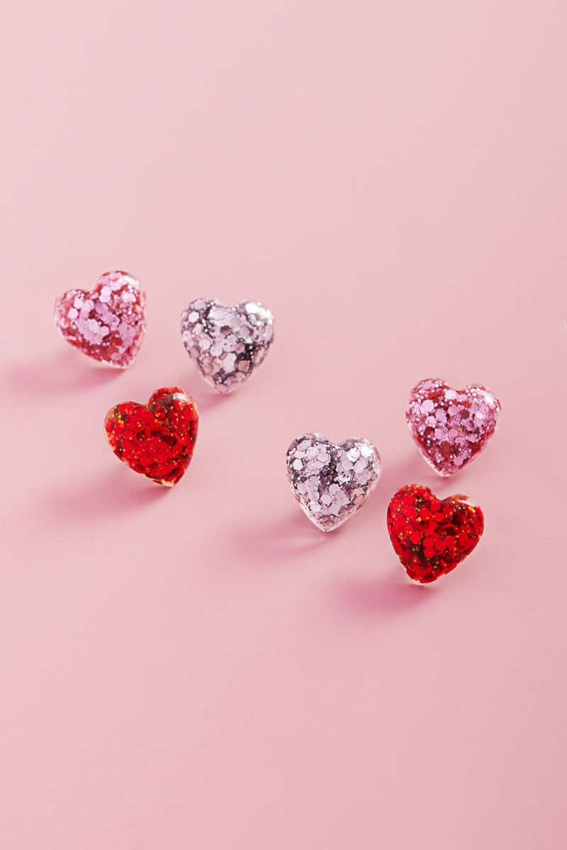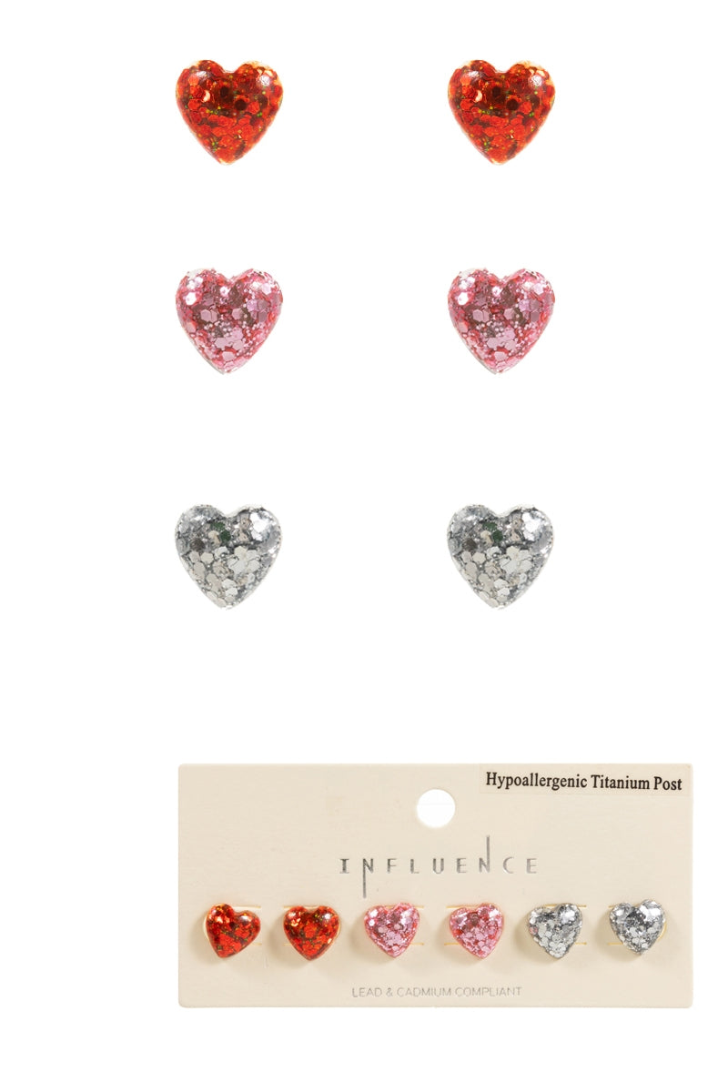 Valentines Heart Glitter Stone 3 Set Post Earrings