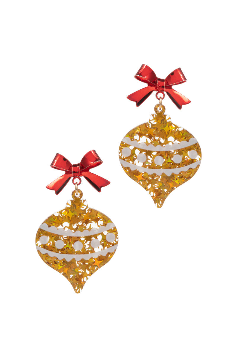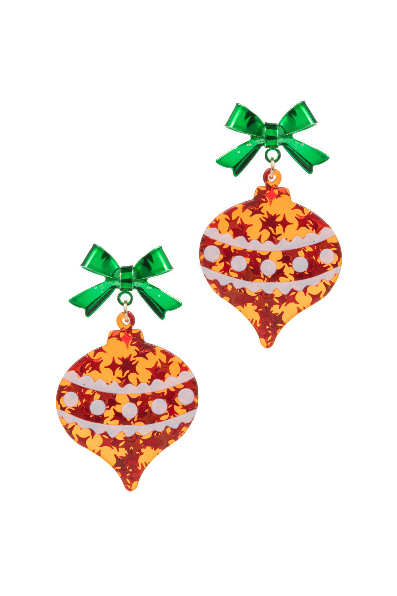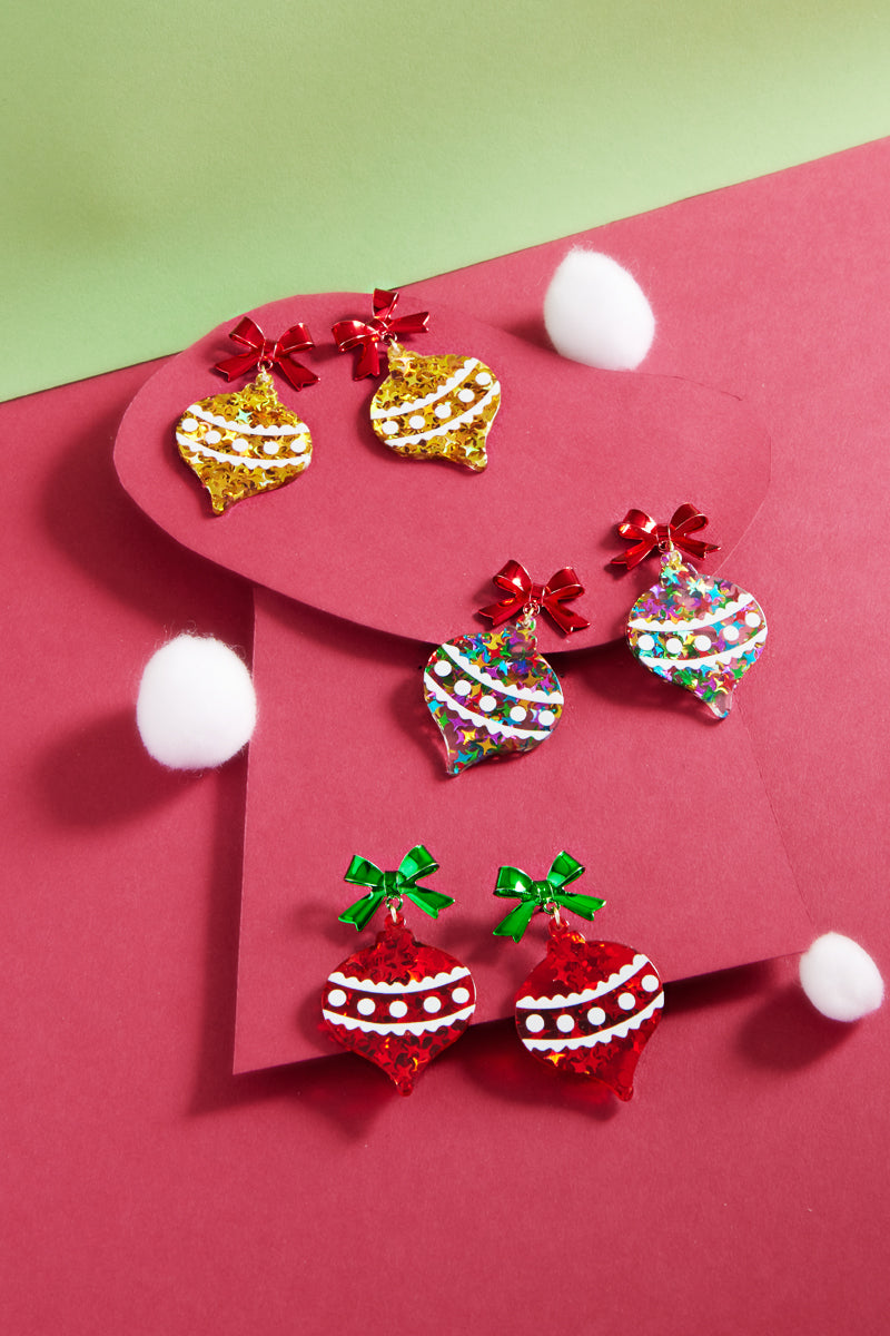 Enhance your holiday style with our 2-inch Christmas ornament-shaped earrings. Made of printed glitter resin, these post earrings add a touch of festive sparkle to any outfit. Lightweight and comfortable to wear, they're the perfect accessory for any holiday event.