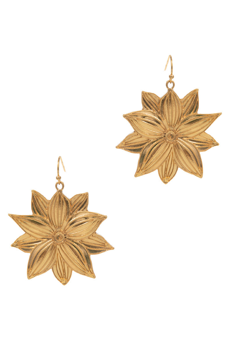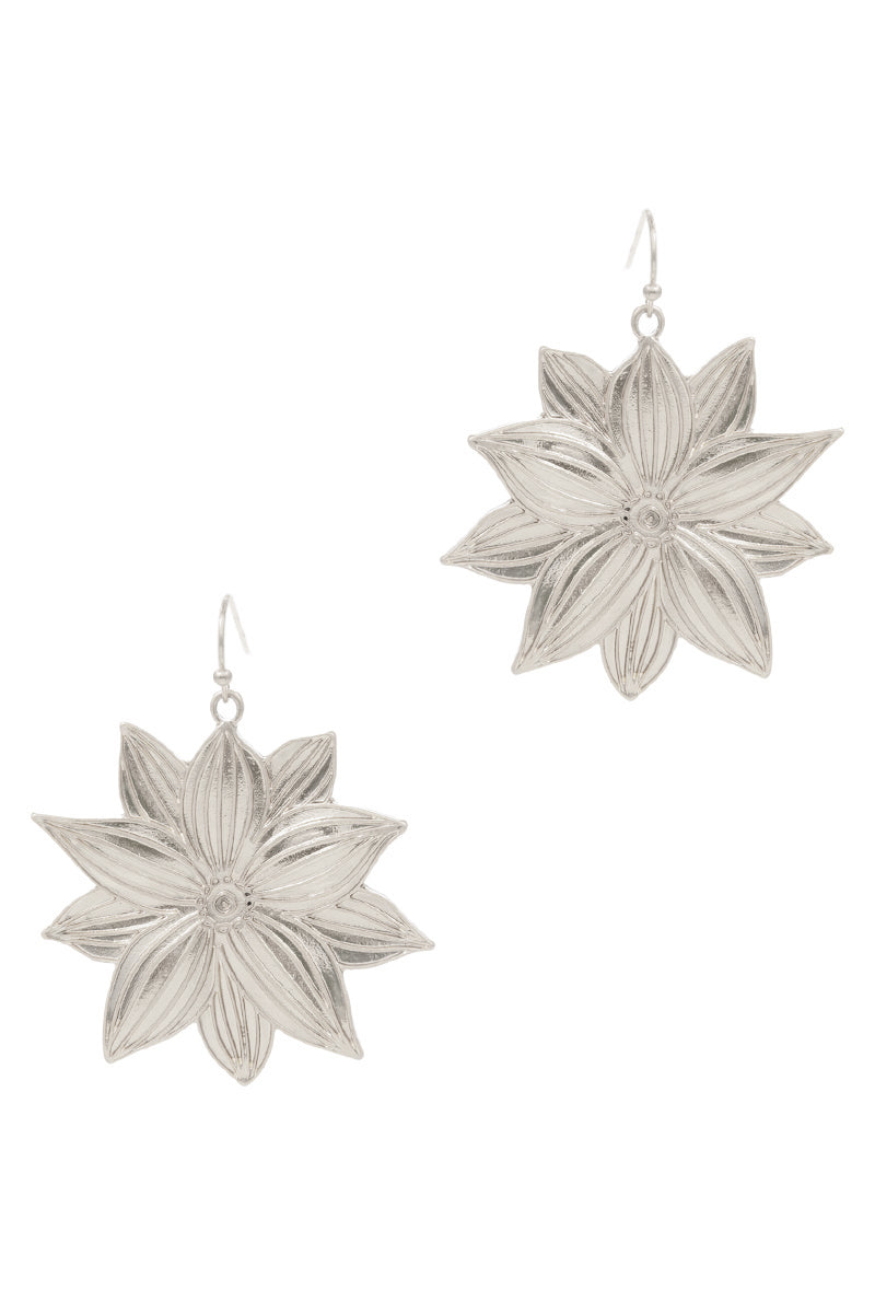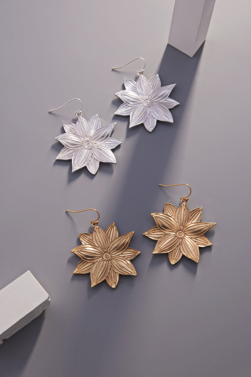 These intricately designed 2 inch flower-shaped metal hook earrings feature a unique engraving pattern, adding an elegant touch to any outfit.