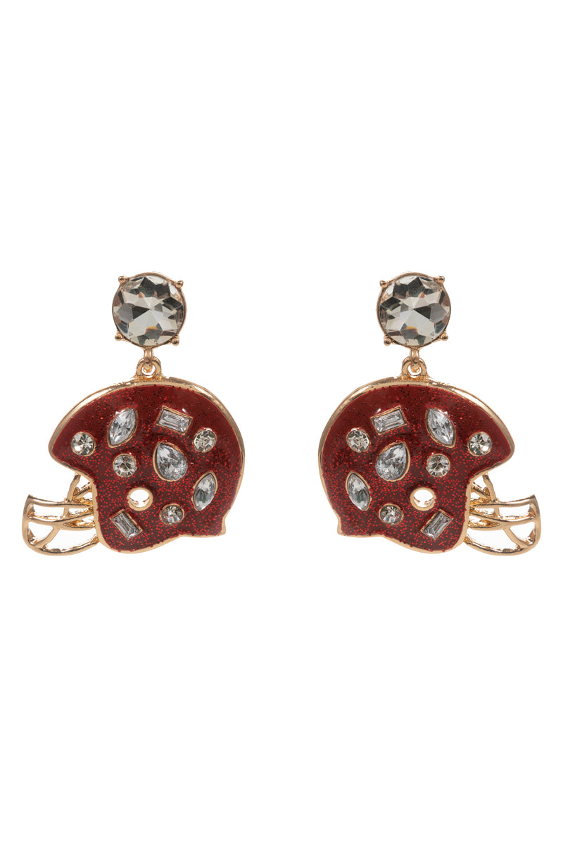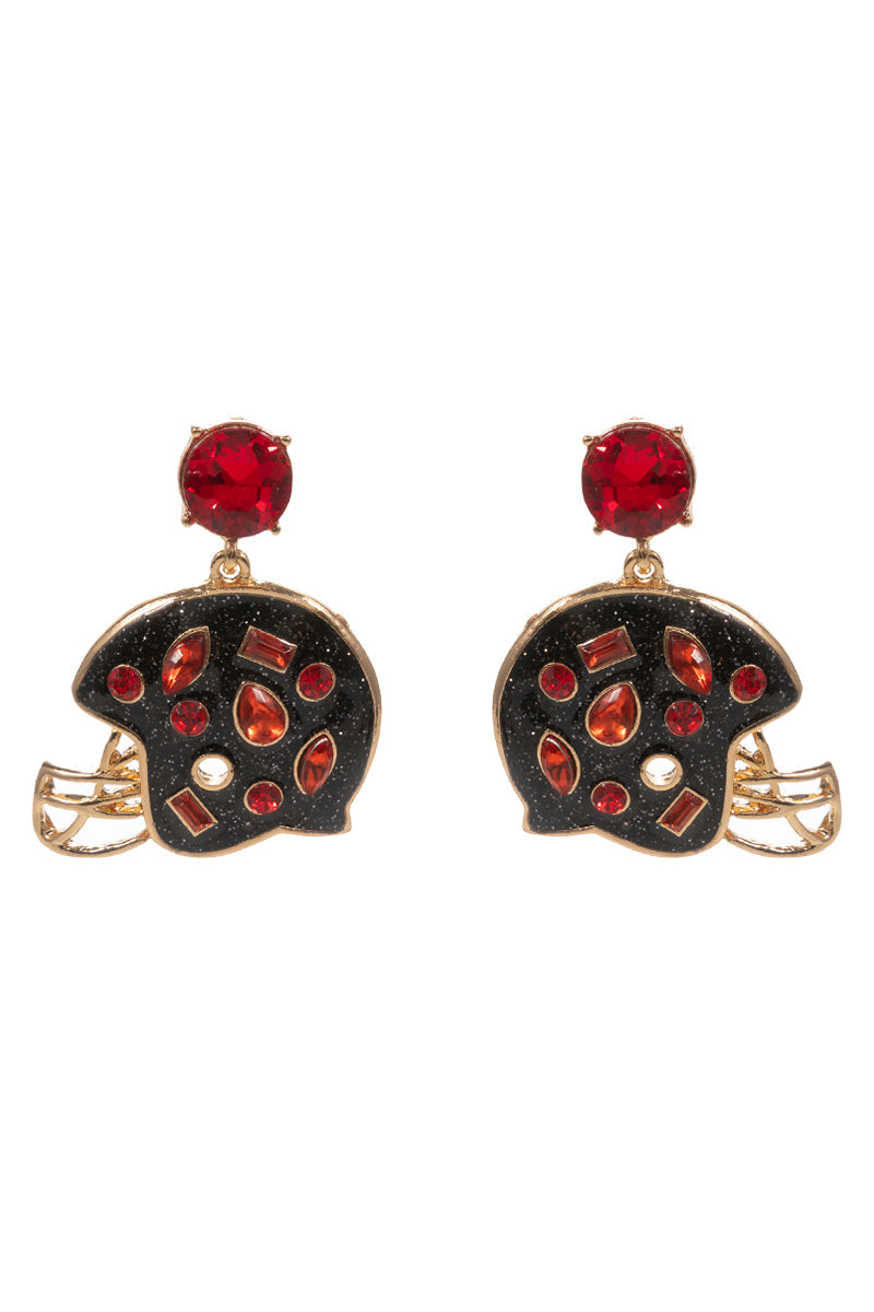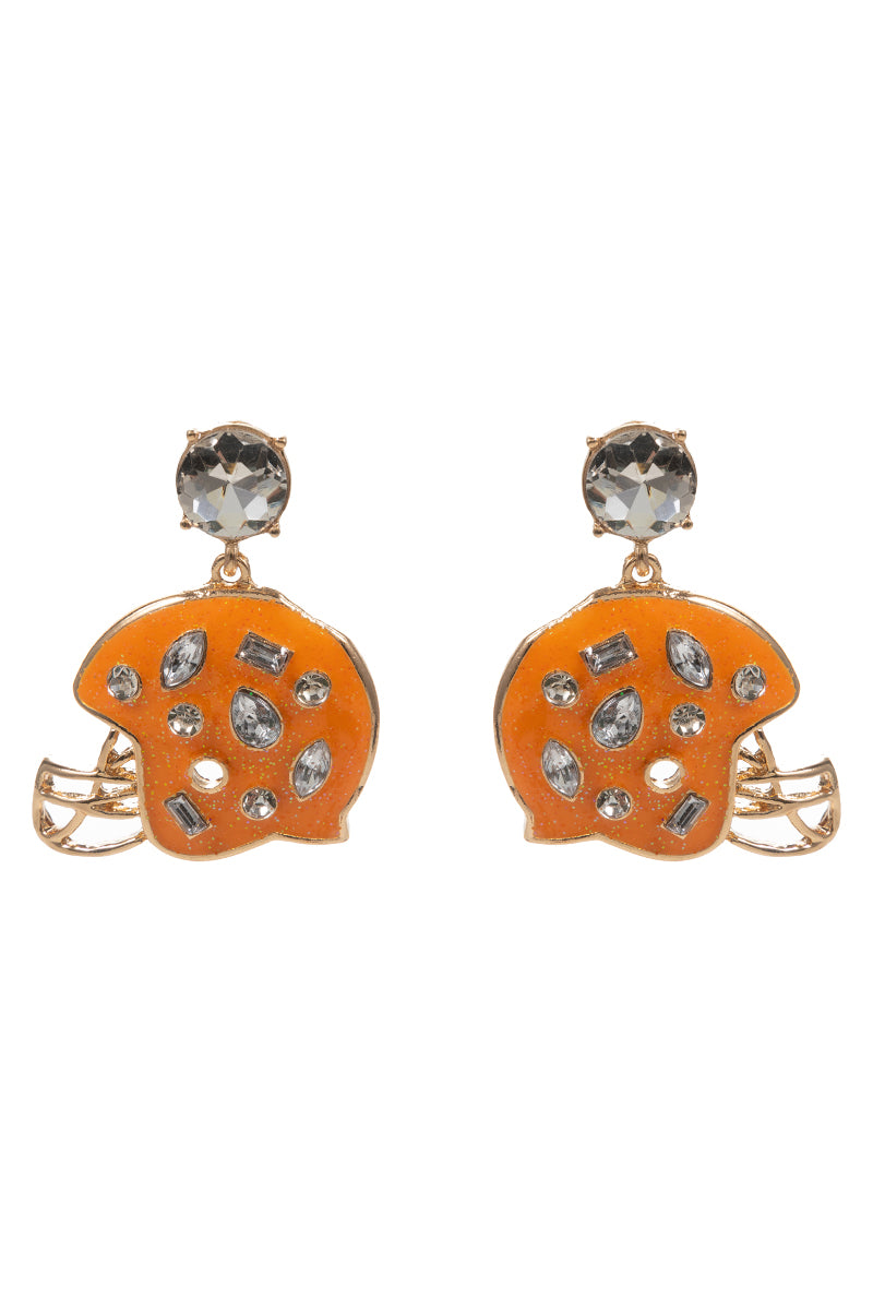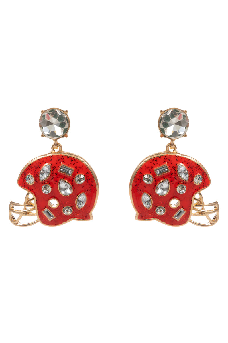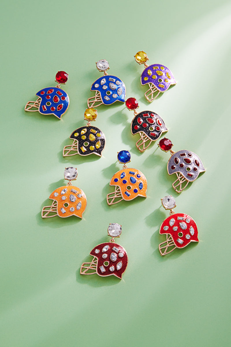 These 1.75-inch football helmet shaped earrings are perfect for game day, featuring bold enamel colors and sparkling acrylic stones.