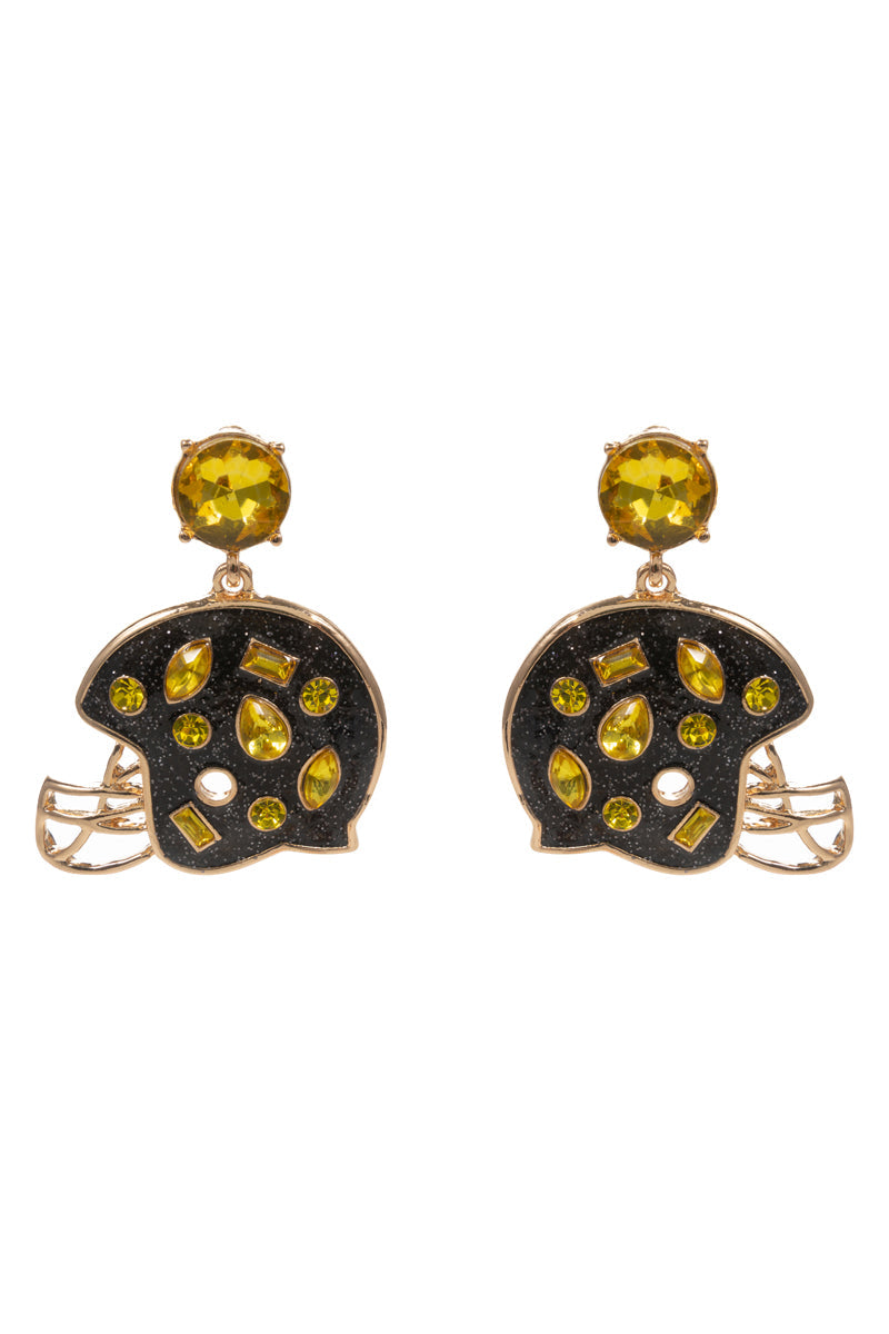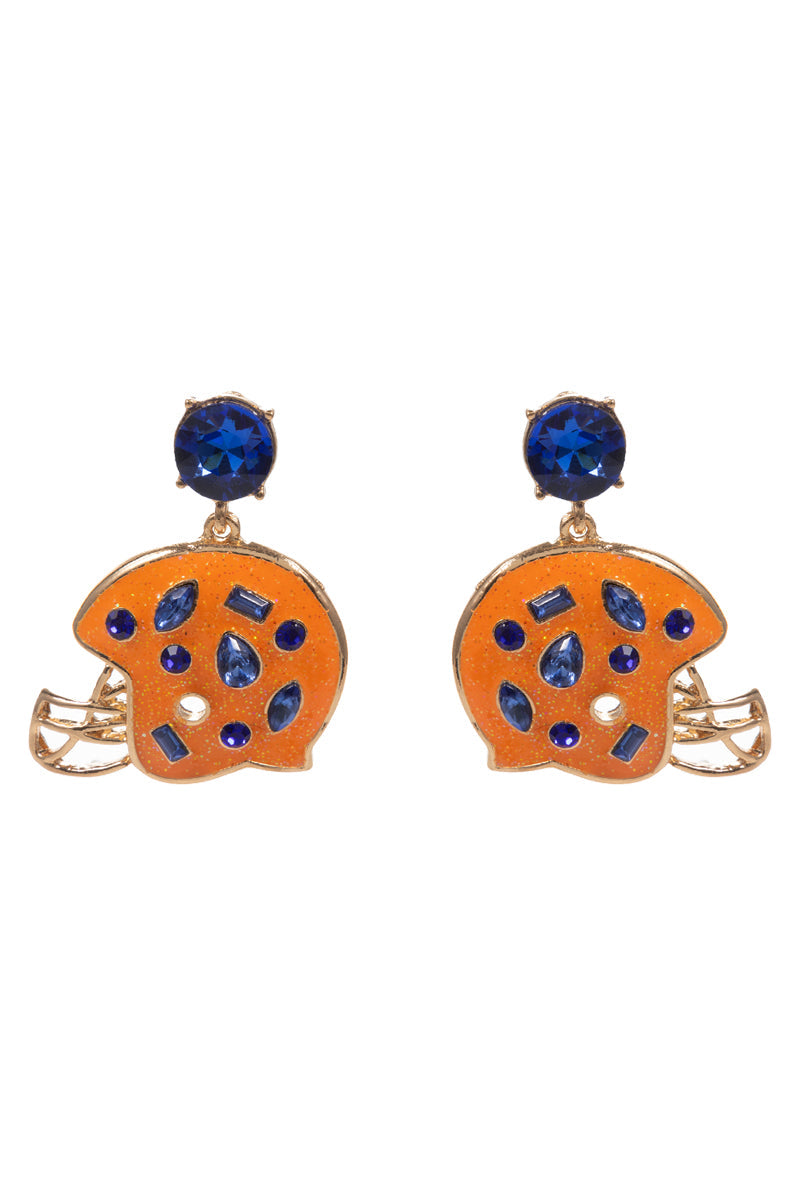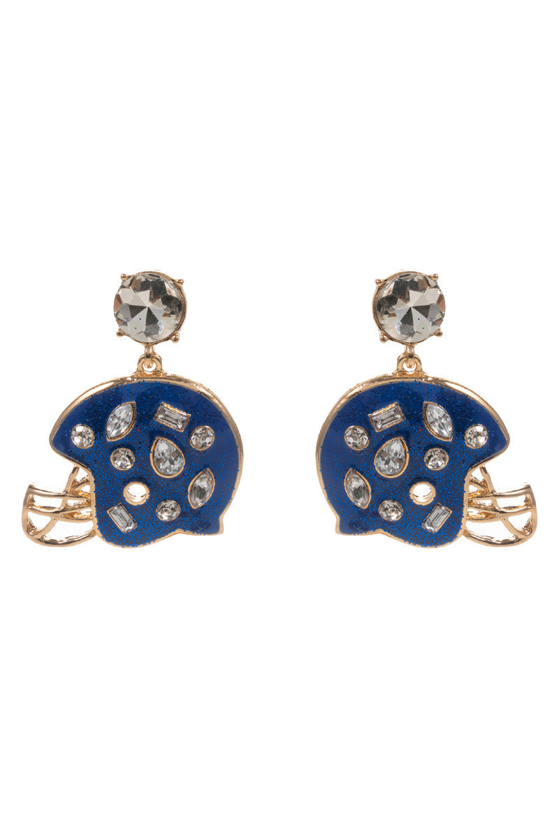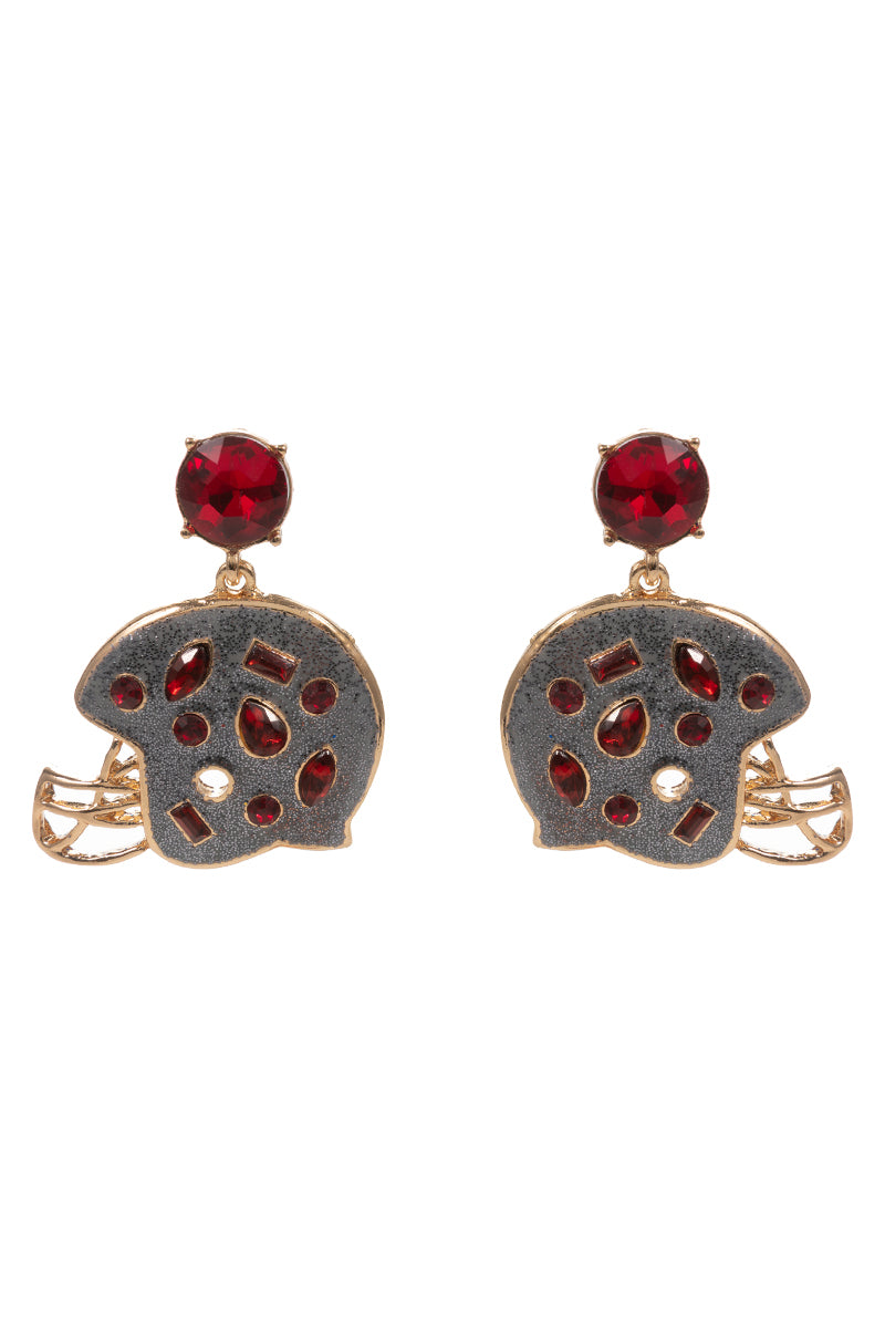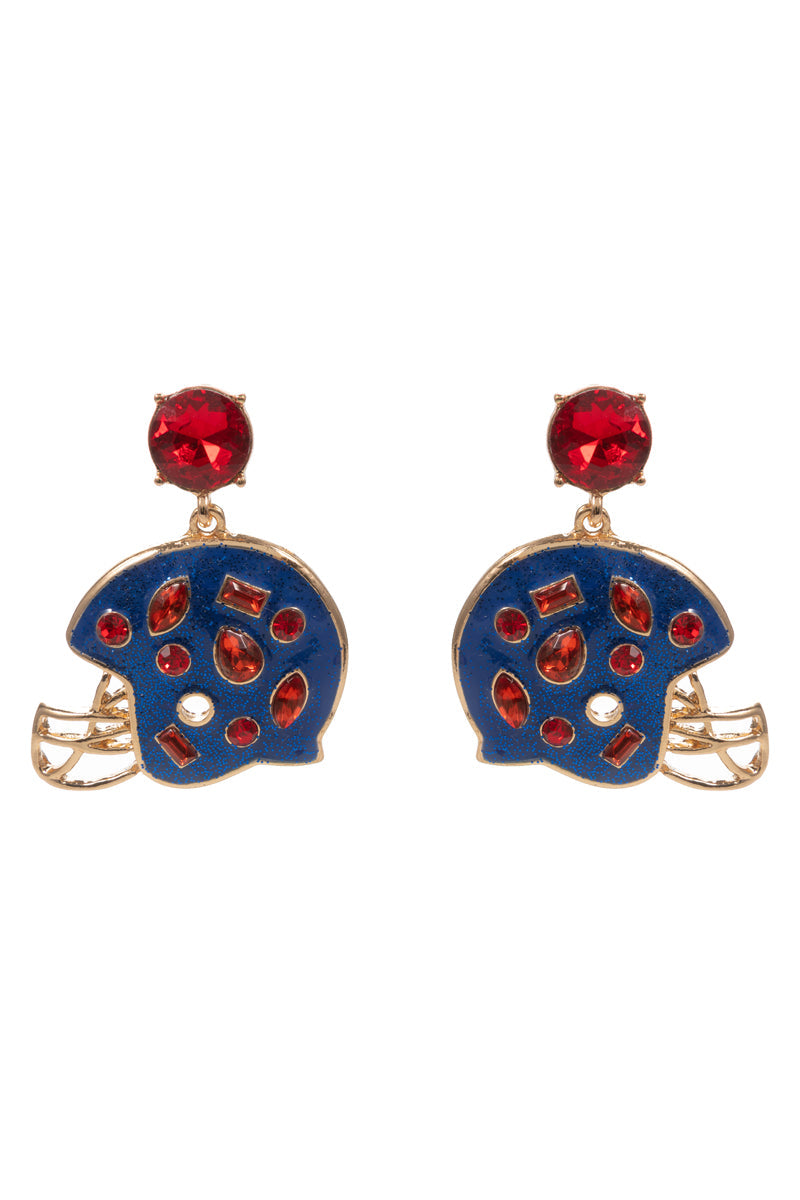 These 1.75-inch football helmet shaped earrings are perfect for game day, featuring bold enamel colors and sparkling acrylic stones.