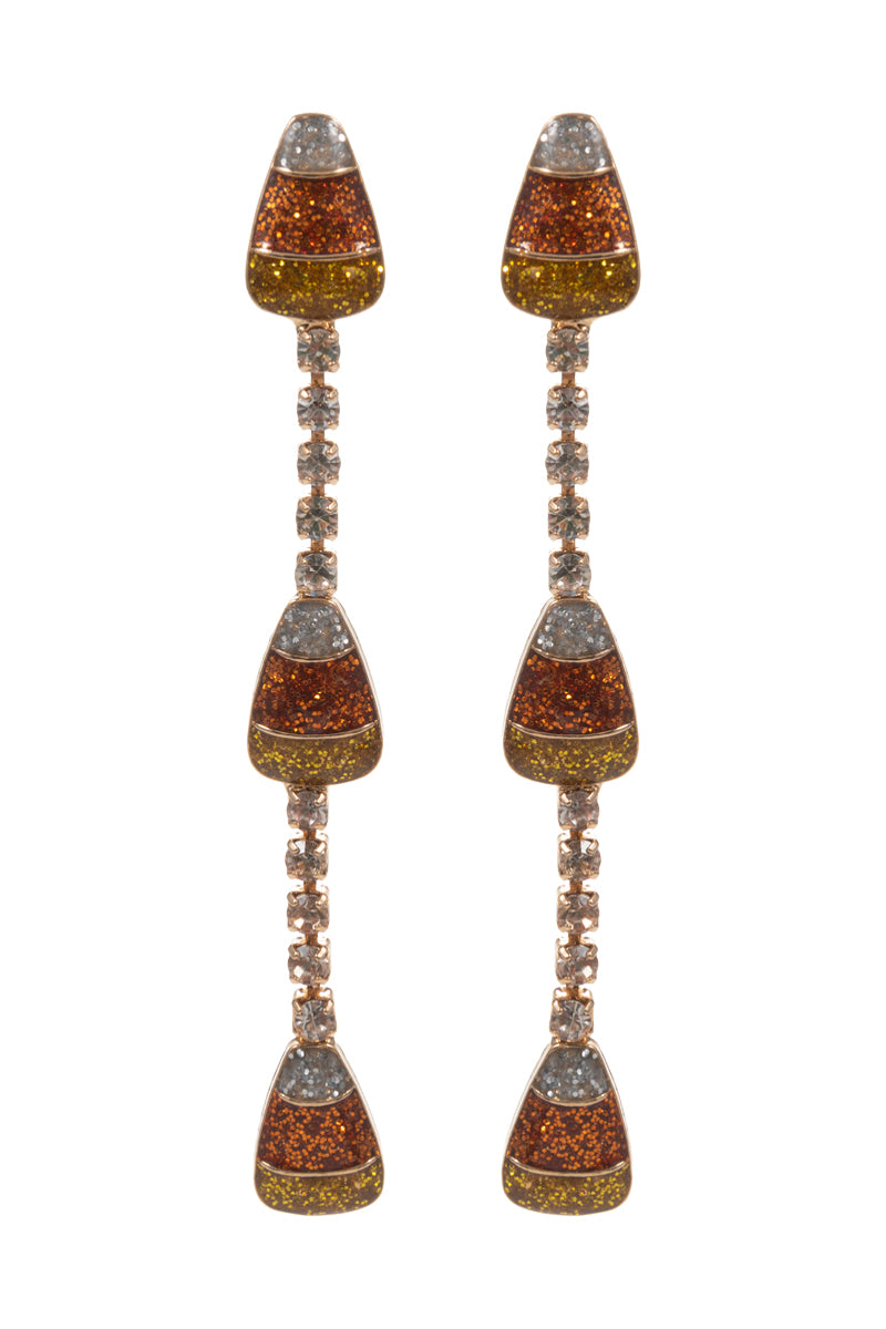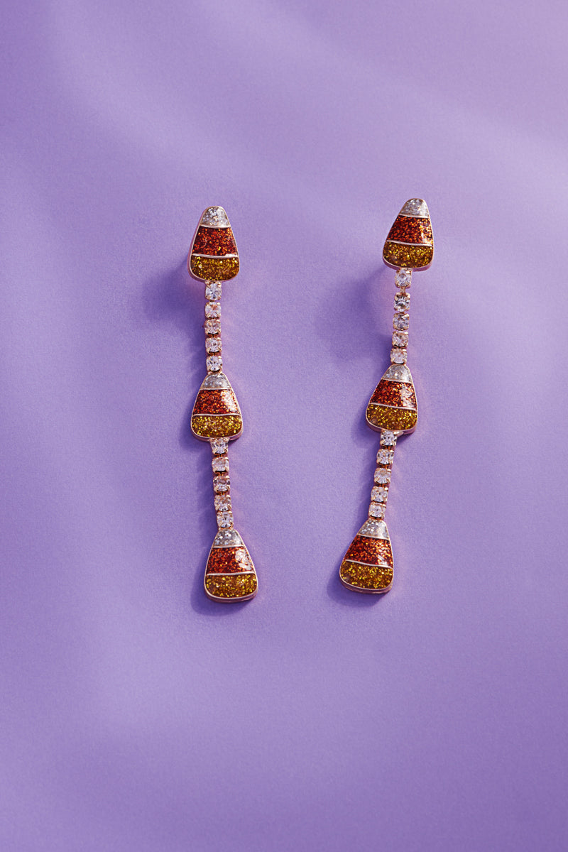 These hypoallergenic titanium earrings feature a fun and festive candy corn shape, adorned with sparkling rhinestones. Measuring 2.5 inches, they are the perfect accessory for any Halloween or fall-themed outfit. Made with enamel, they are safe for those with sensitive skin.