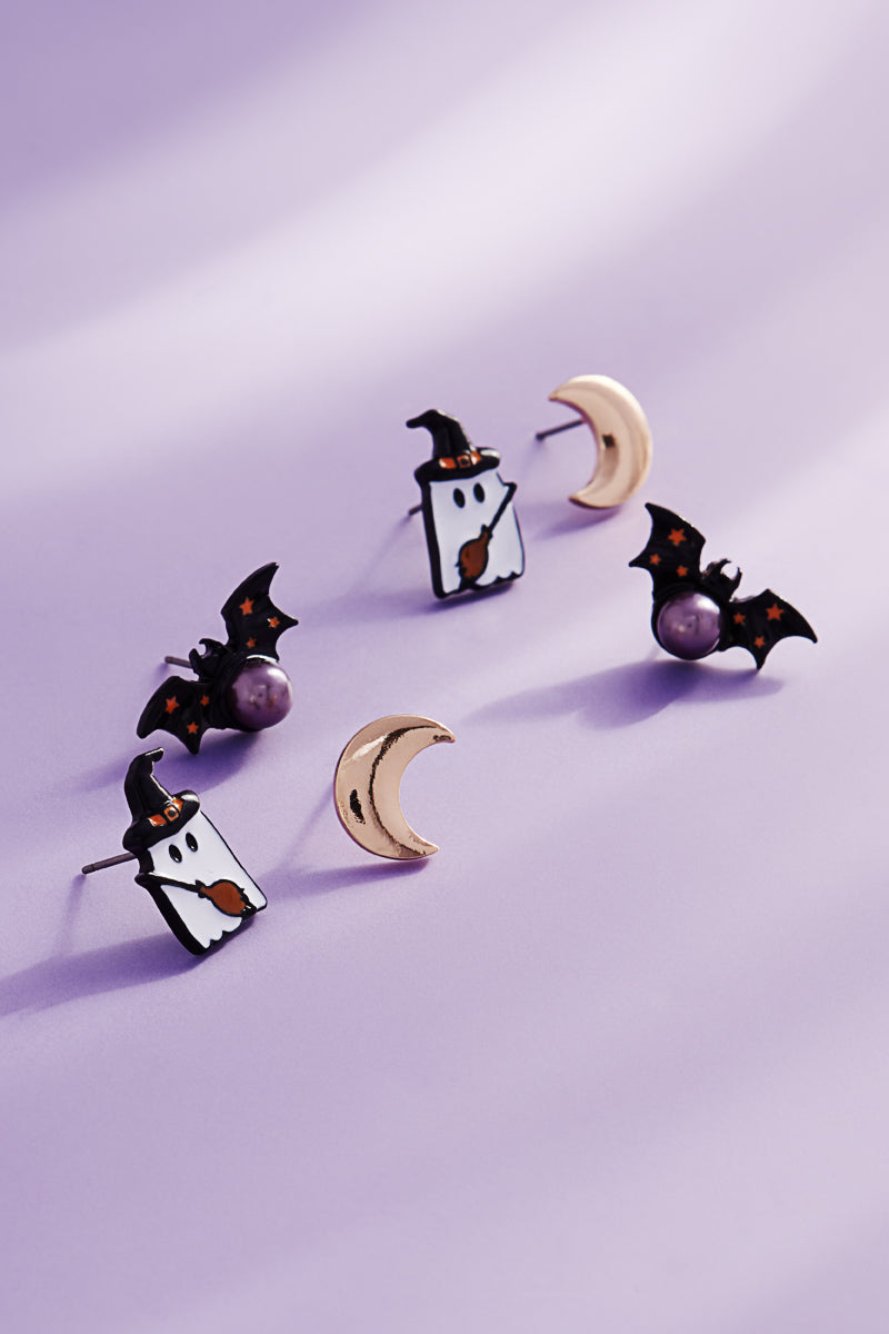 Halloween Crescent Bat Ghost 3 Set Post Earrings