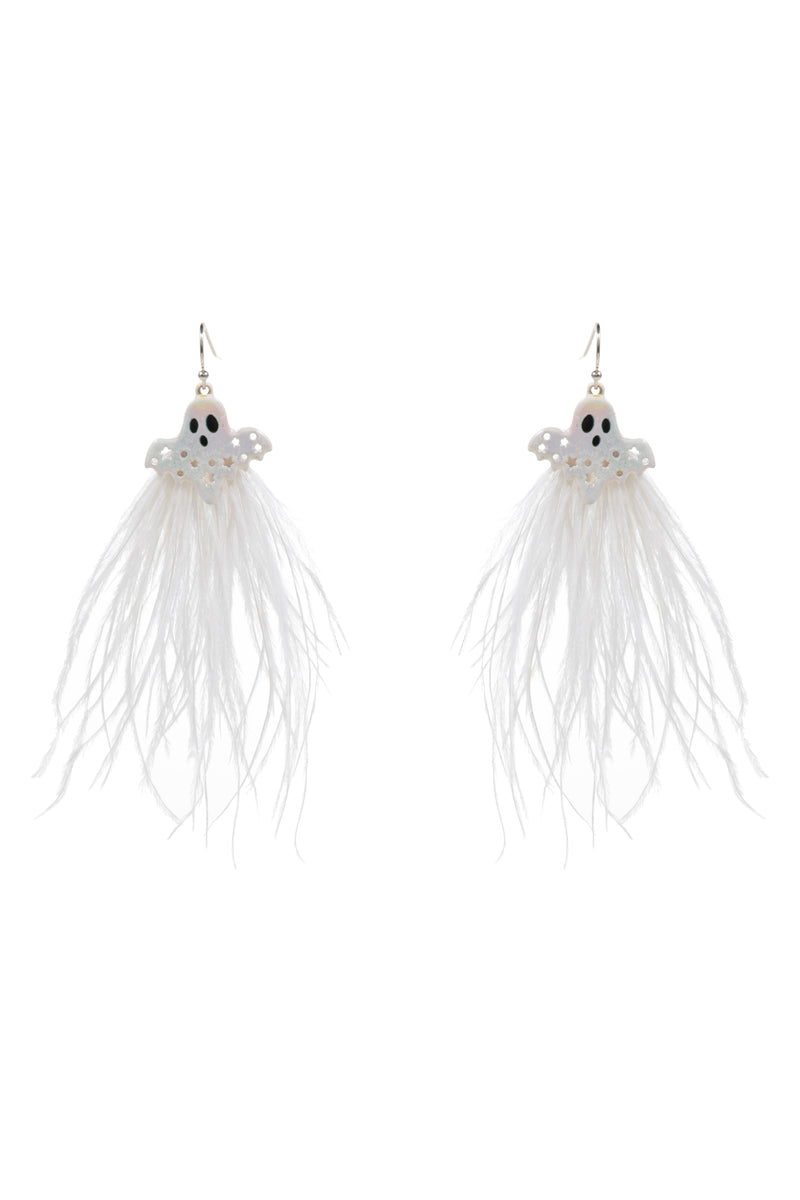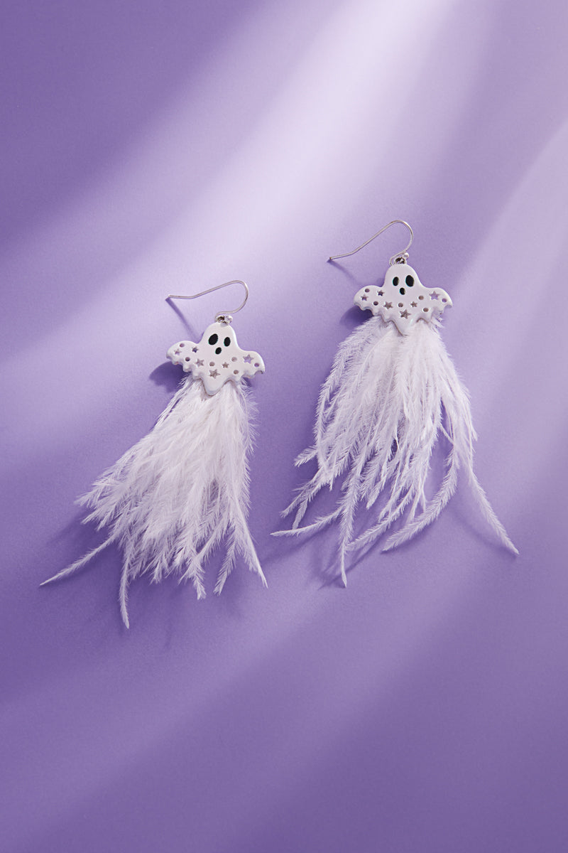 These 4 inch boo shaped iridescent coating earrings with feathers have a unique design that will make a statement. The iridescent coating adds a touch of shimmer while the feathers give a playful and chic touch. These earrings are a perfect addition to any outfit, making you stand out in style.