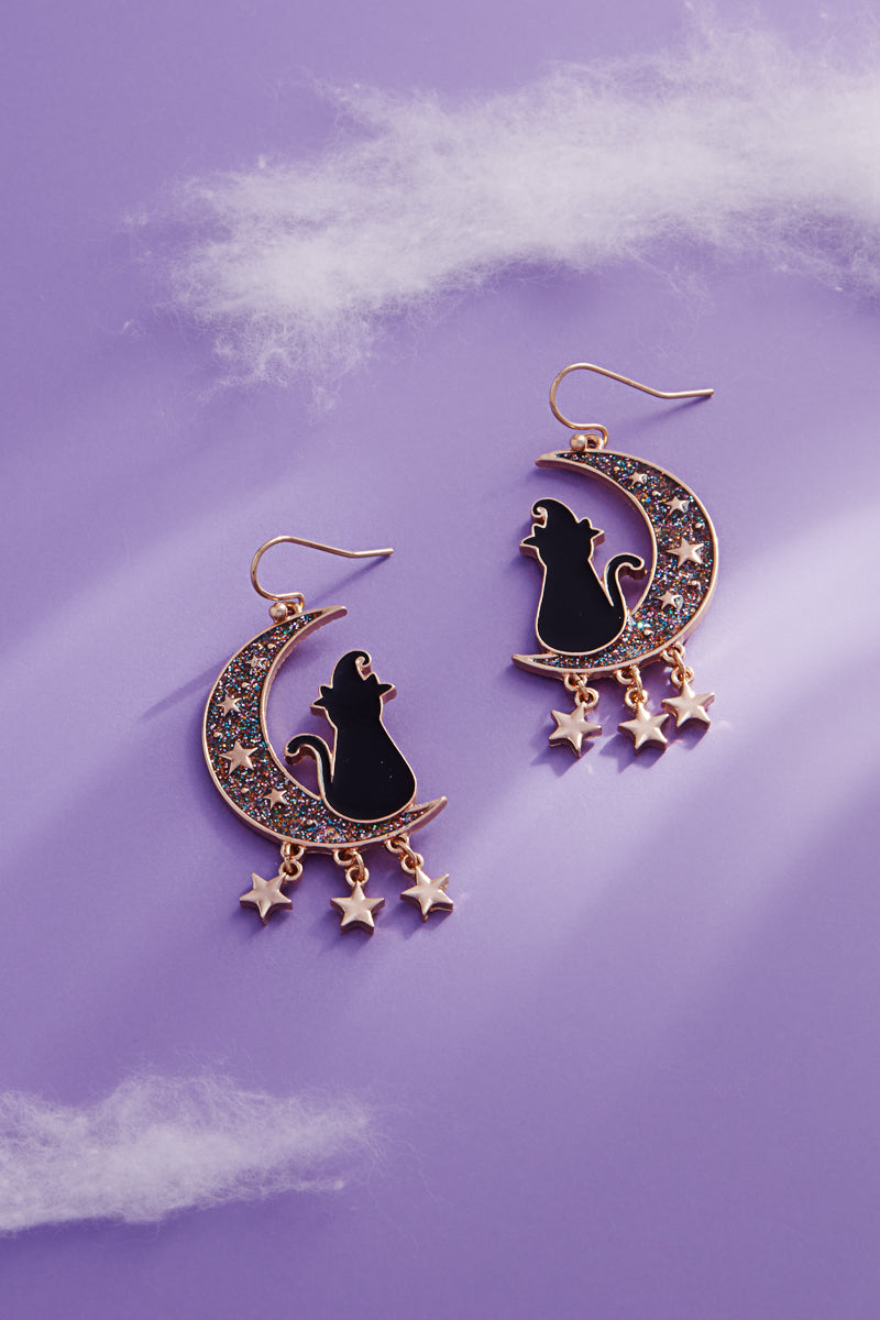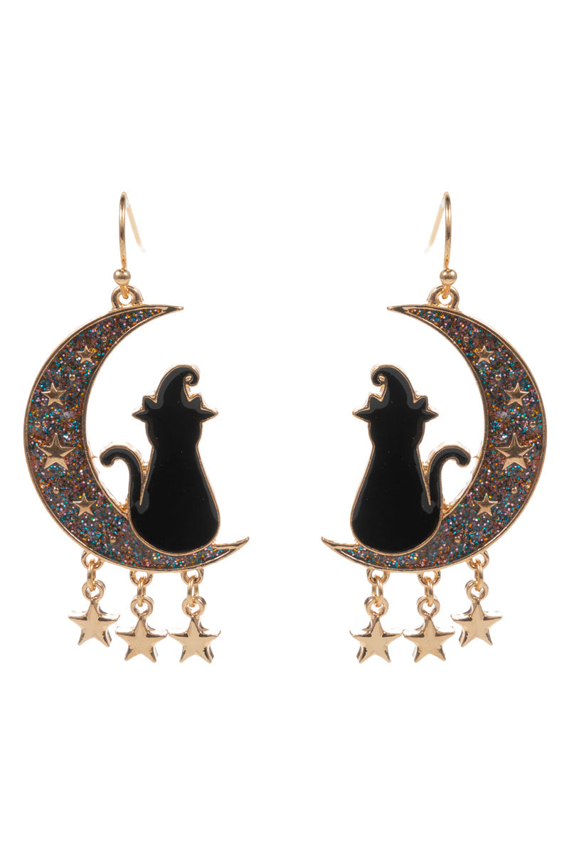 Halloween Moon N Cat Glitter Enamel Hook Earrings