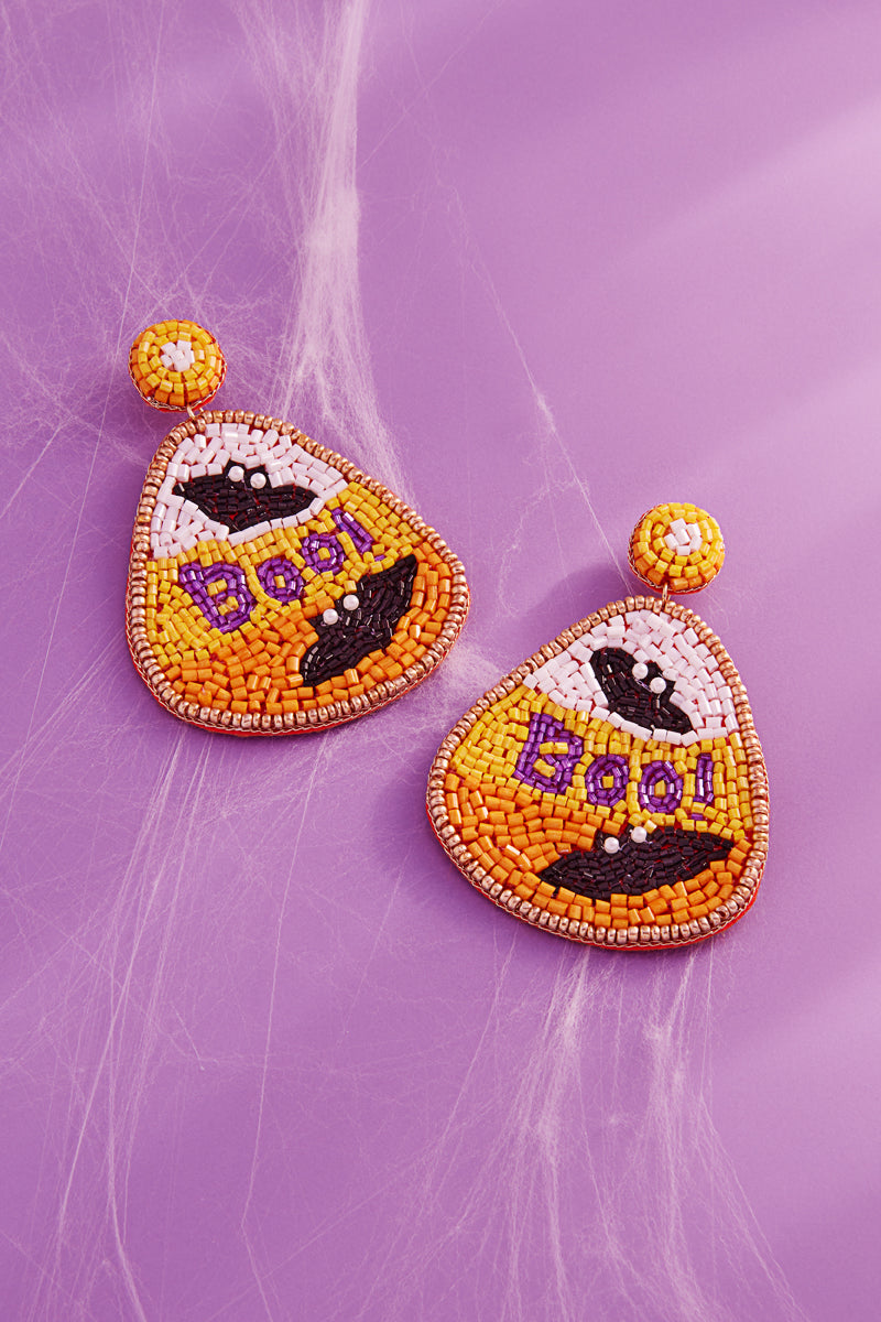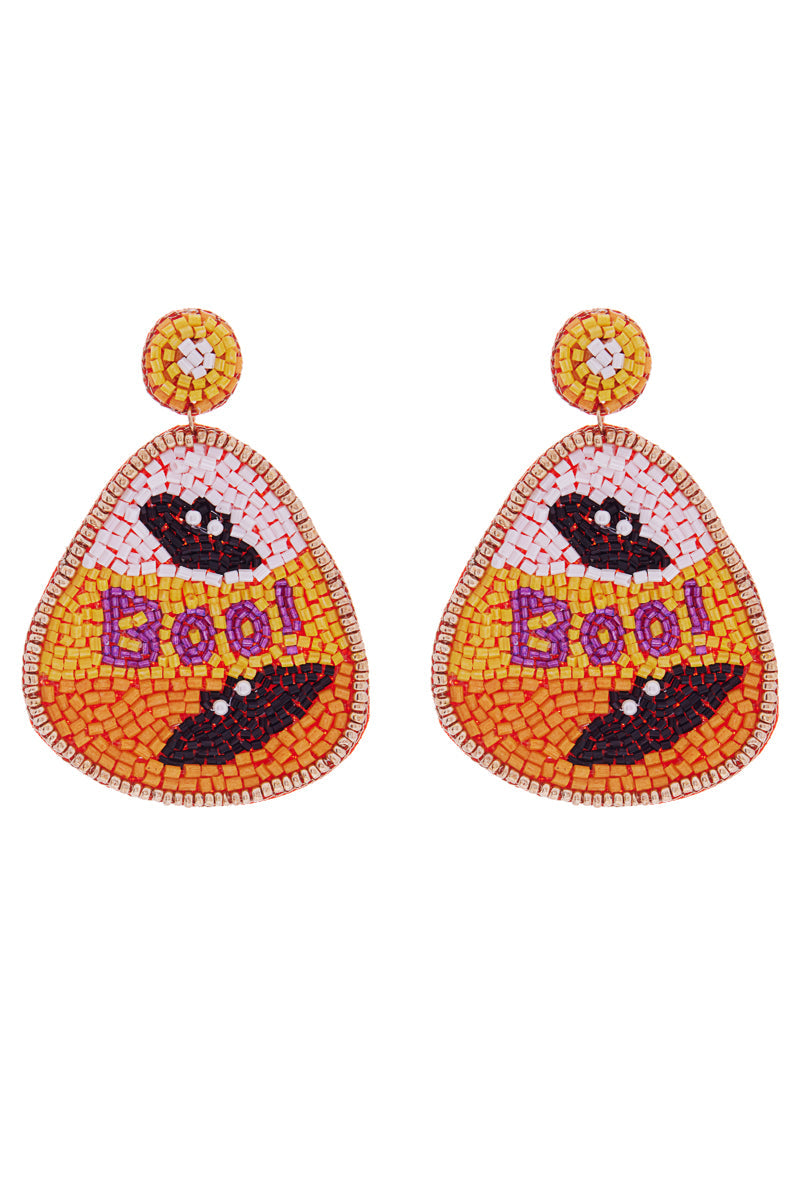 Crafted with precision and care, our 3 INCH BOO candy corn shaped handcrafted Indian bead post earrings are a unique accessory that will add a touch of whimsy to any outfit. Made from high-quality materials and attention to detail, these earrings are a perfect blend of style and craftsmanship.