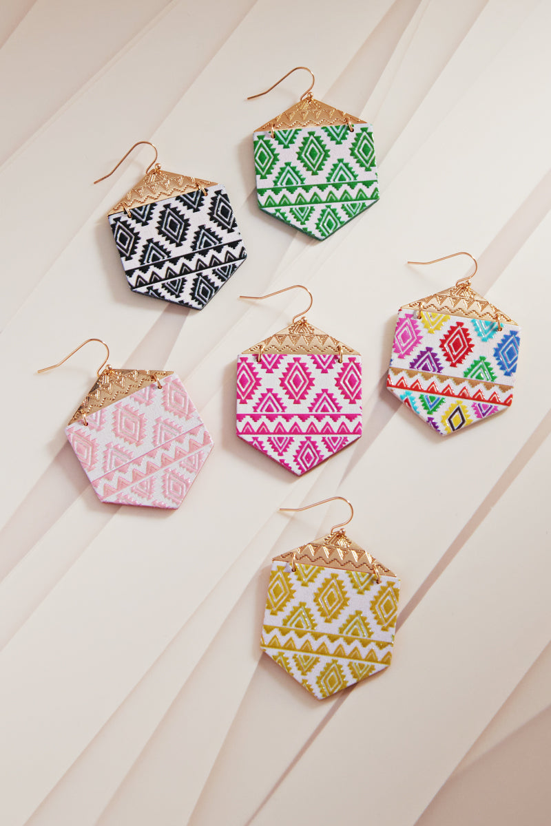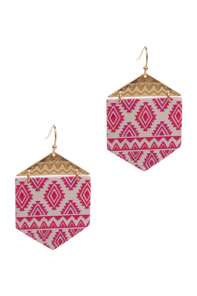 Hexagonal Shape Wood Chevron Pattern Hook Earrings