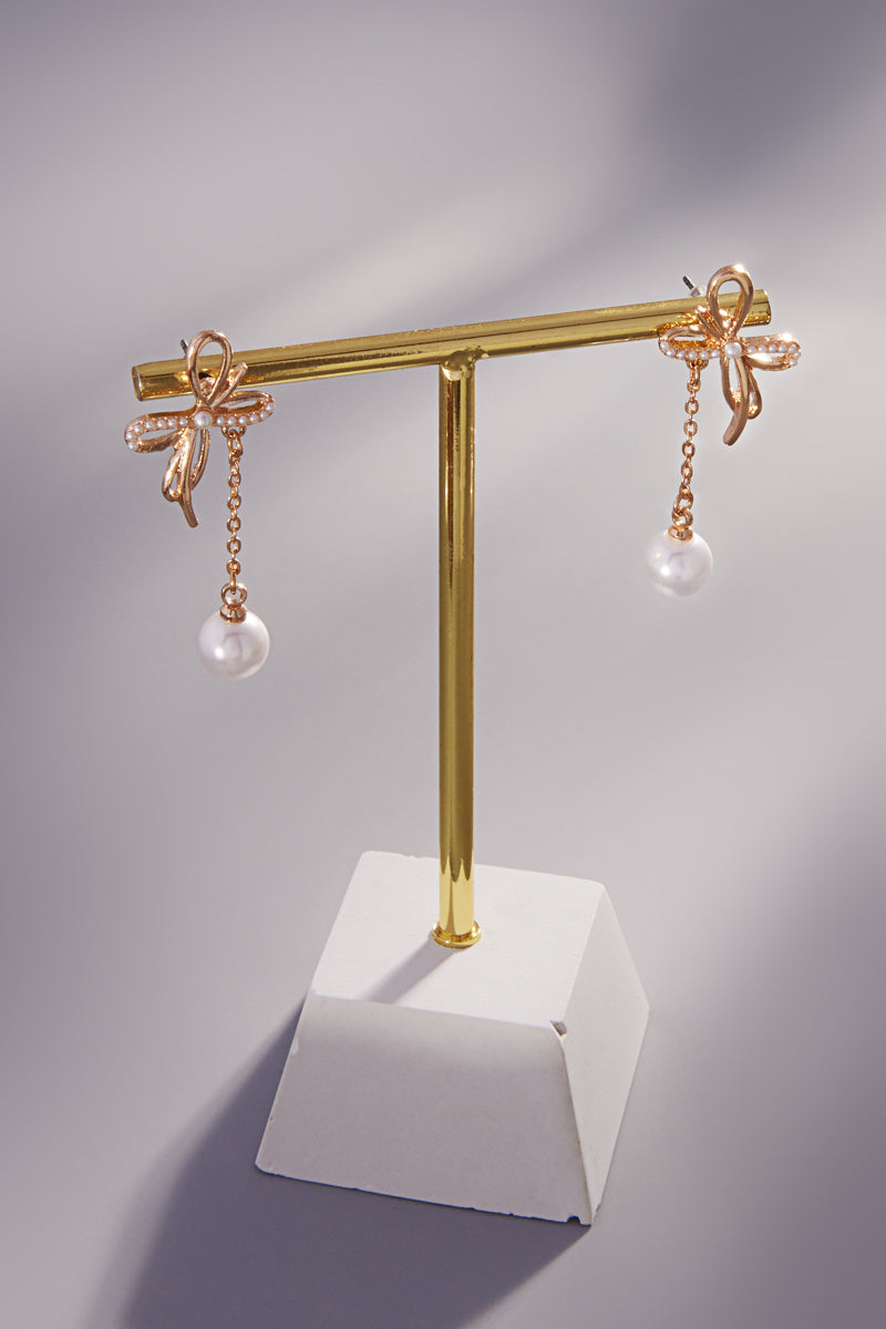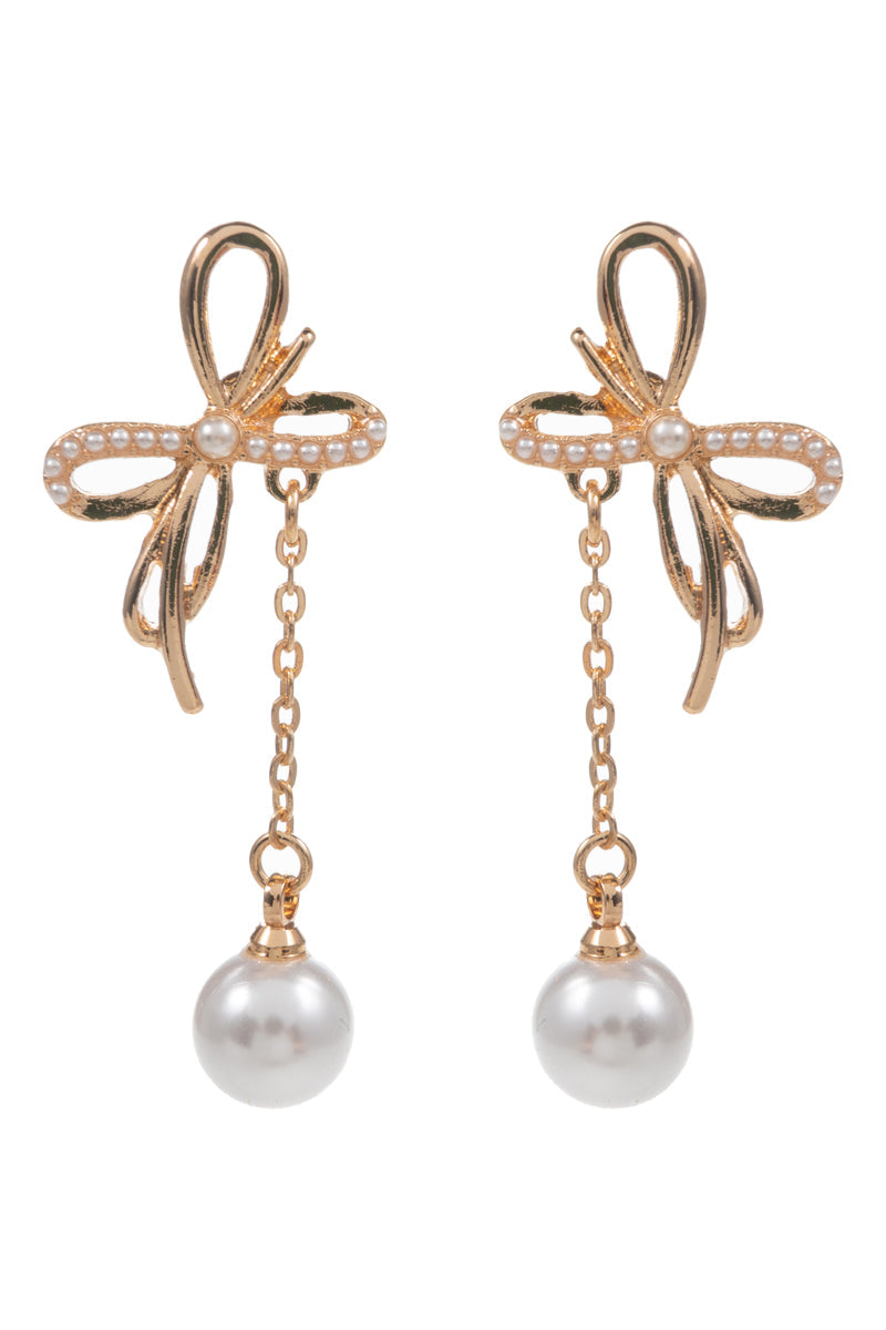 Ribbon Shaped Bow Pearl Drop Post Earrings
