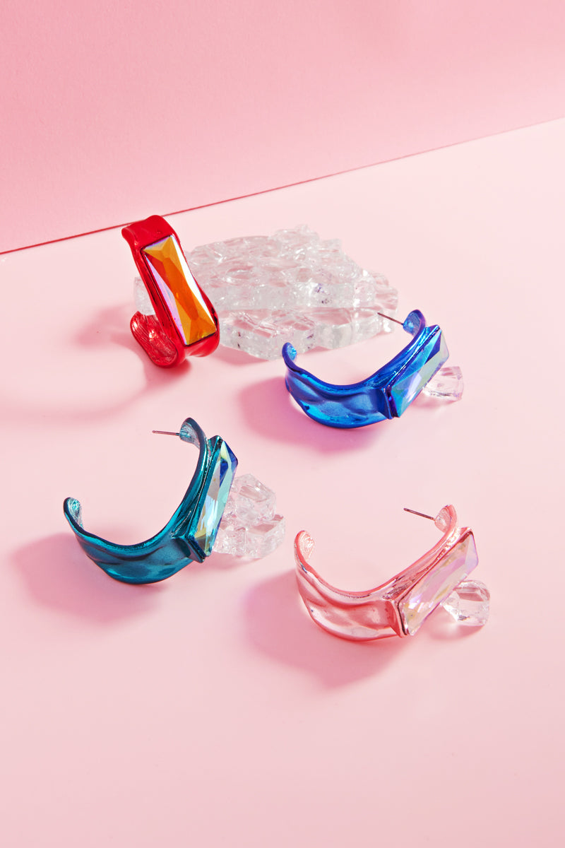 These 2 inch round shaped multicolored glass hoop earrings are perfect for adding a pop of color to any outfit.
