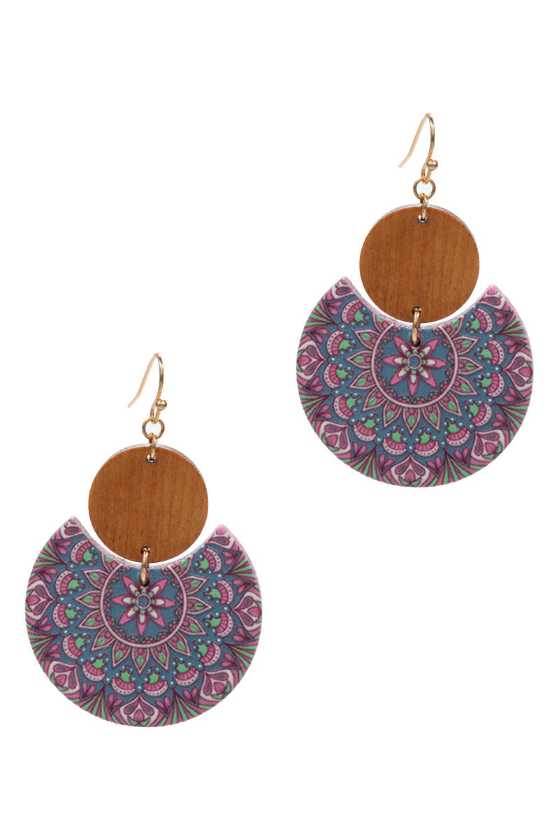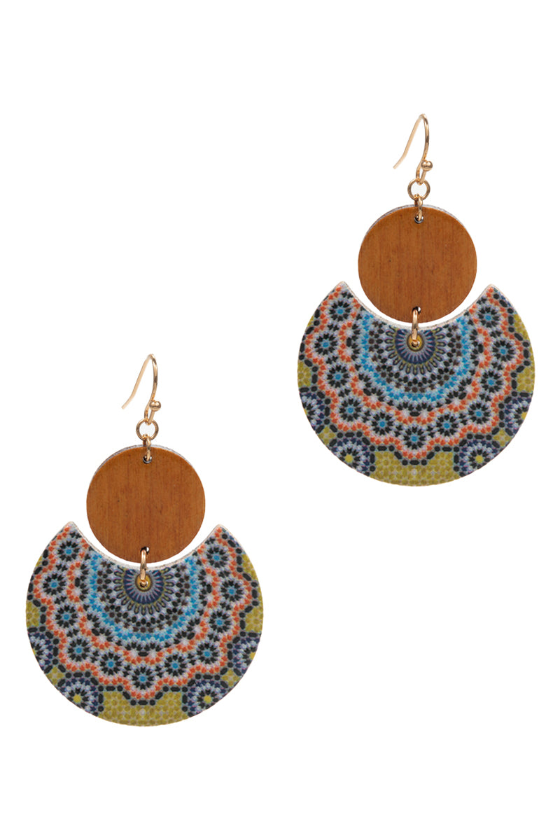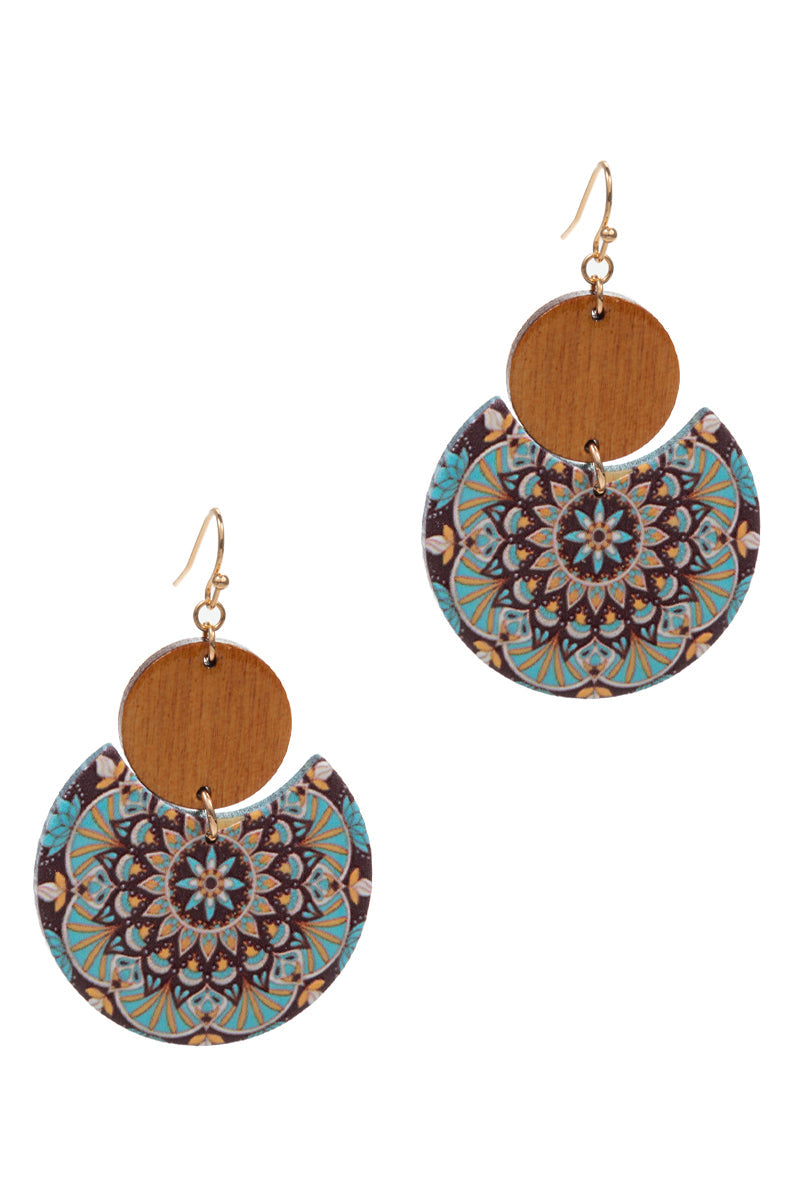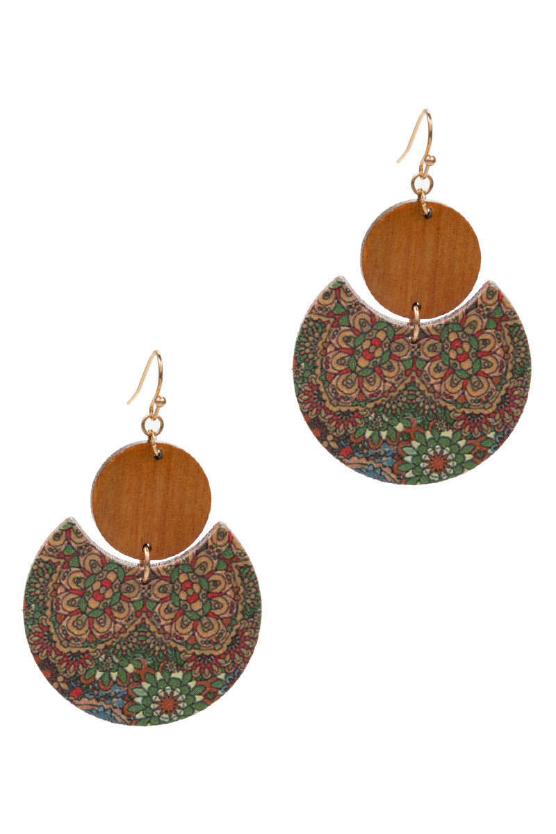 Round Shape Wood With Ethnic Pattern Hook Earrings