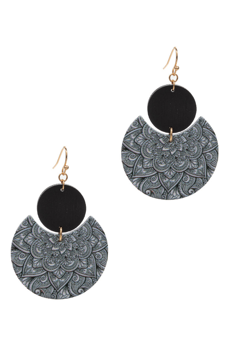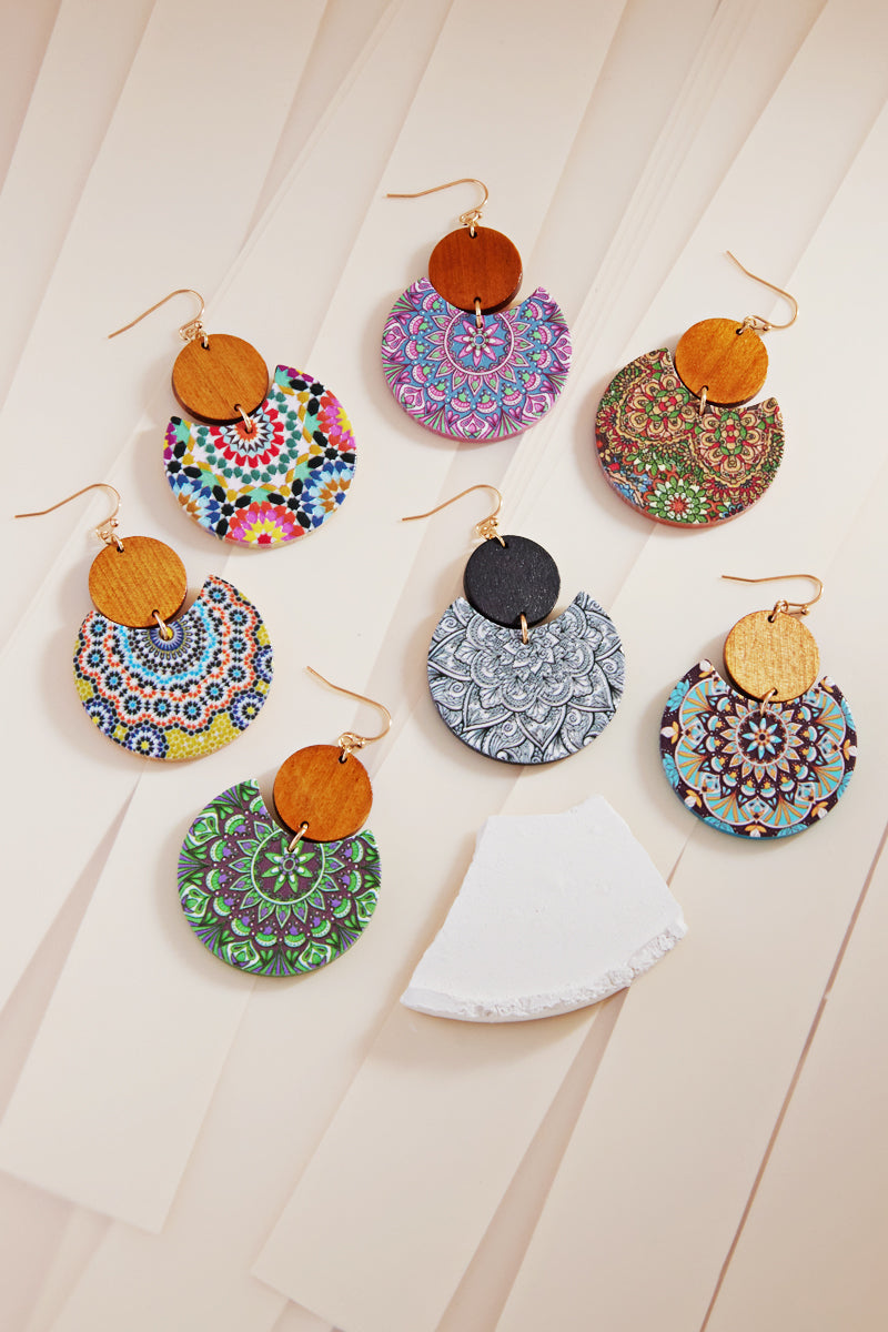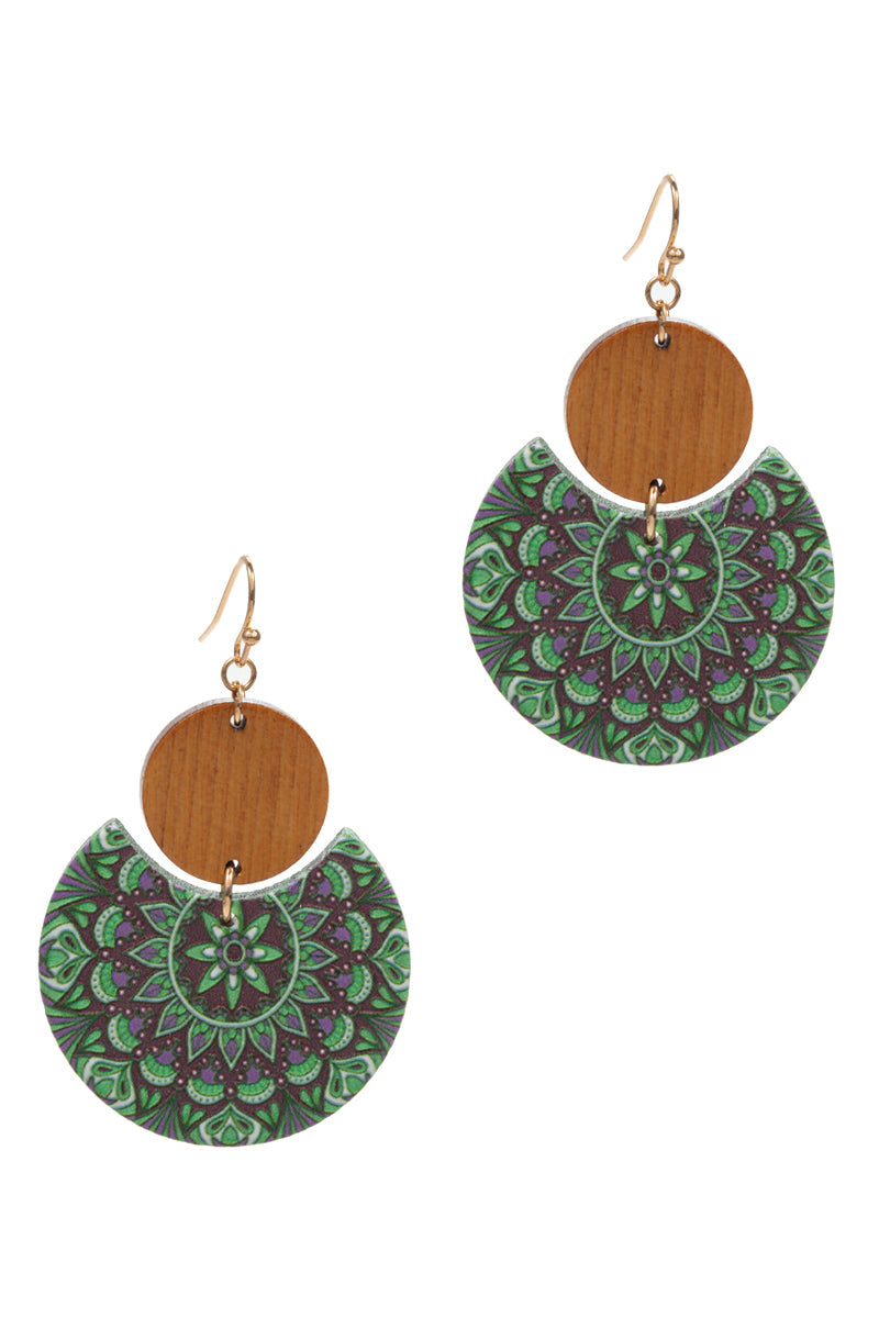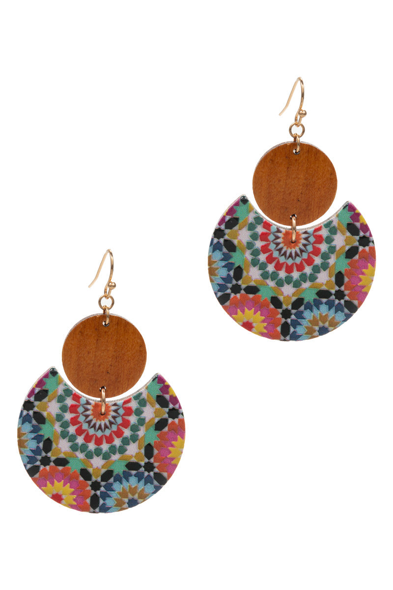 Round Shape Wood With Ethnic Pattern Hook Earrings