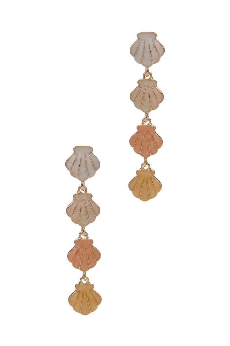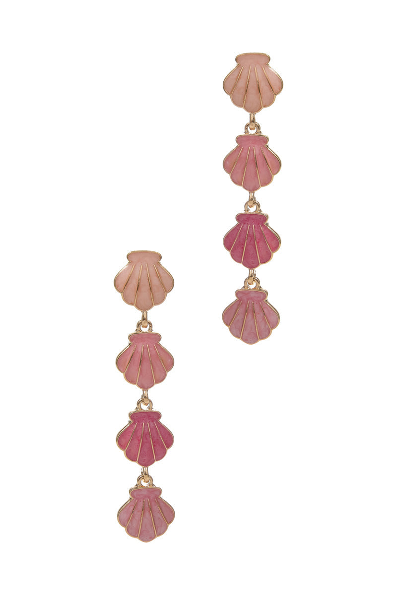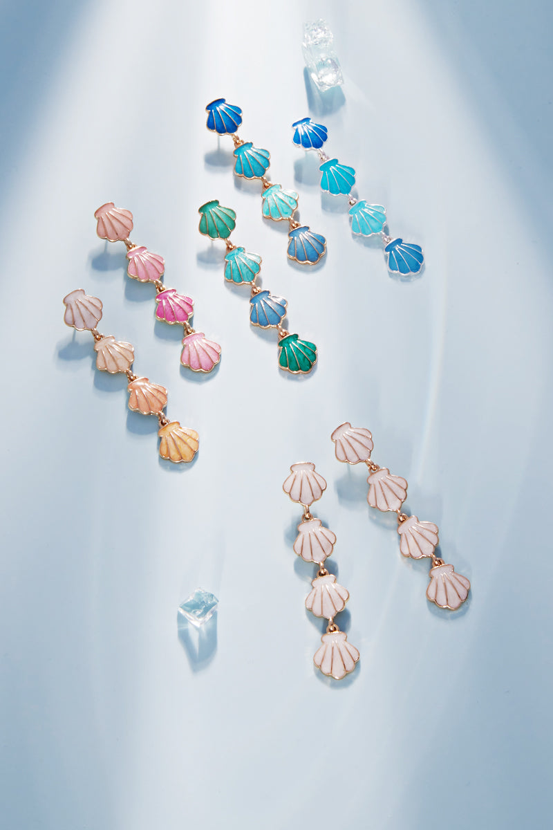 Crafted with precision and style, these 2.5 inch shell shaped earrings are sure to make a statement. Adorned with 4 drop pearlized swirl enamel, they are the perfect embodiment of elegance and sophistication.