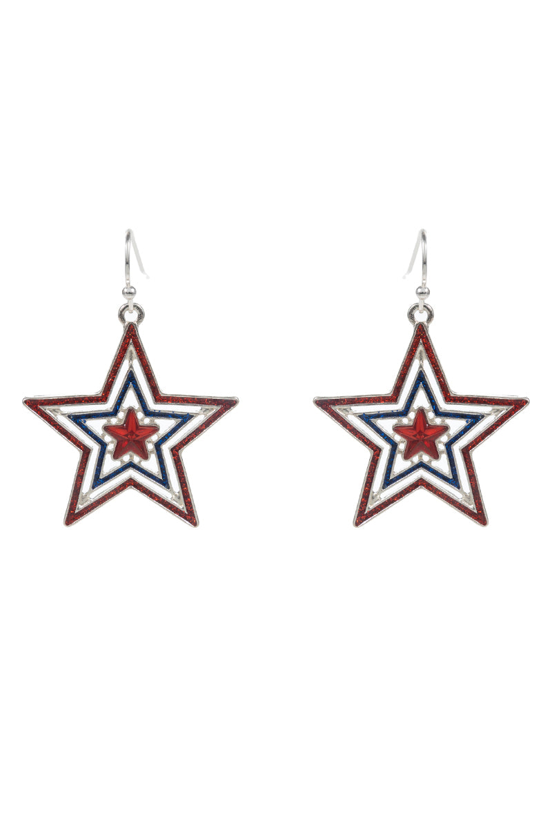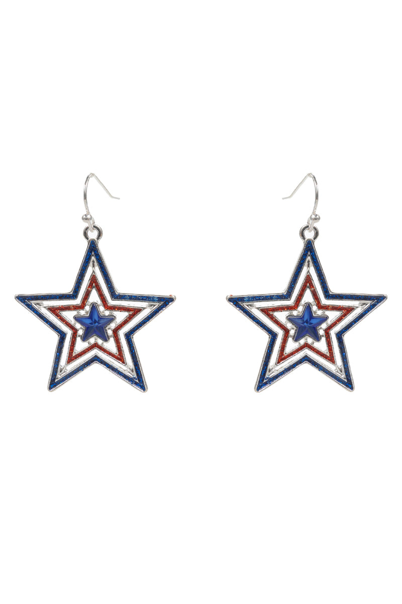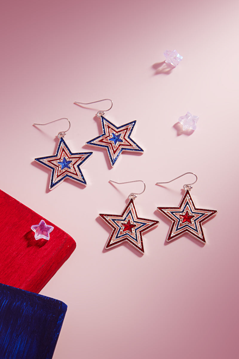 These 1.5 inch star-shaped American flag earrings feature a stunning glitter enamel design and a secure hook closure. Add a touch of patriotic sparkle to your outfit while showing off your love for the USA.