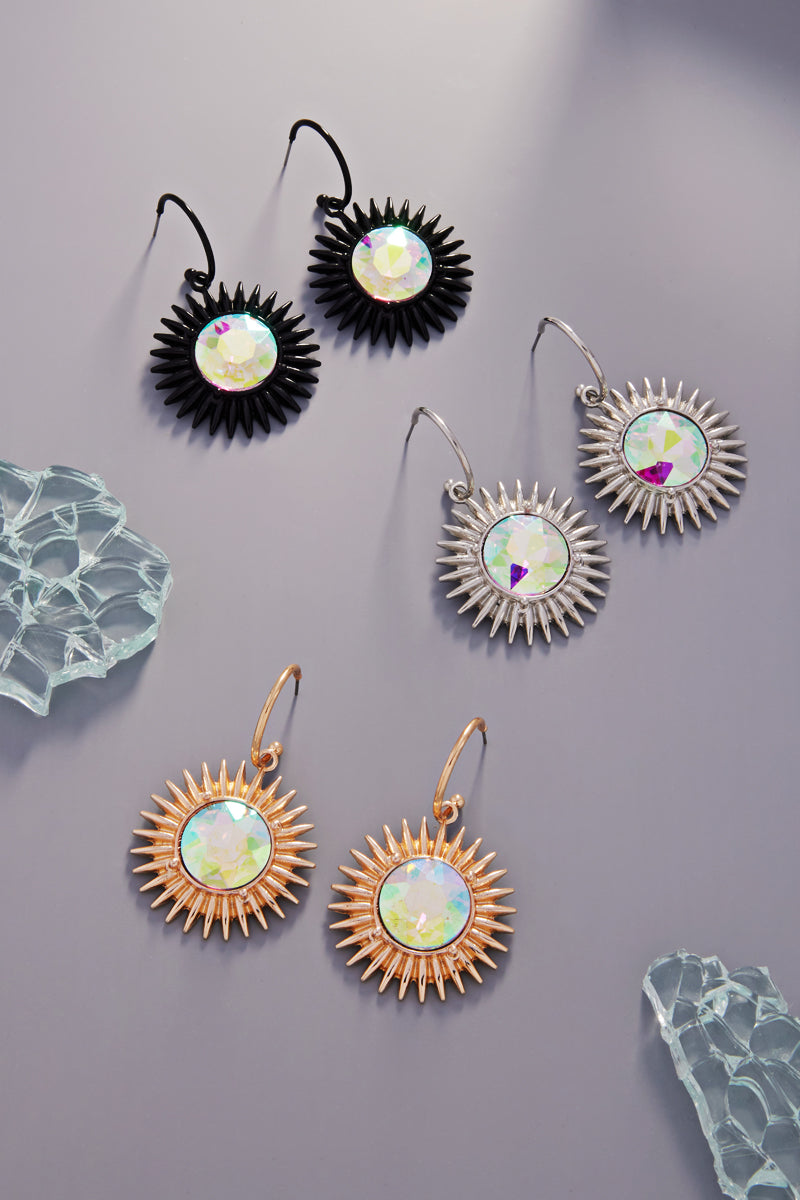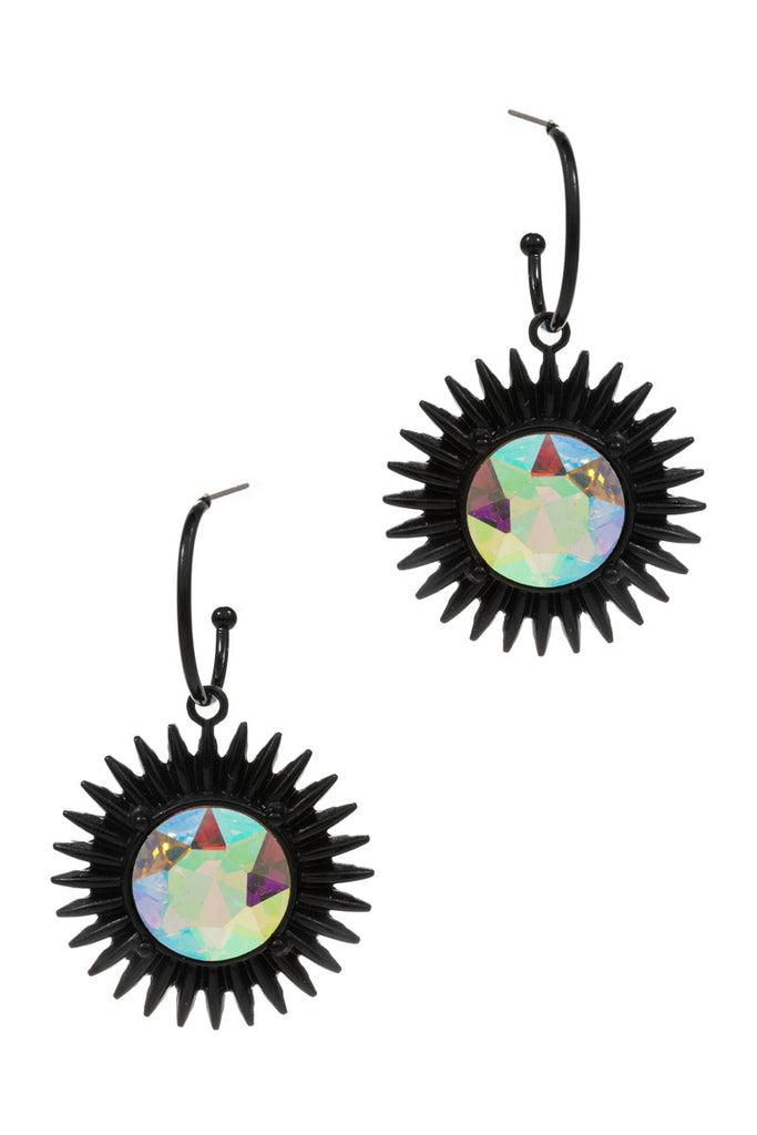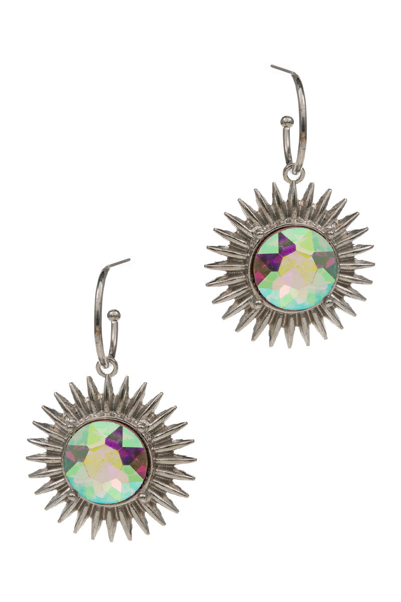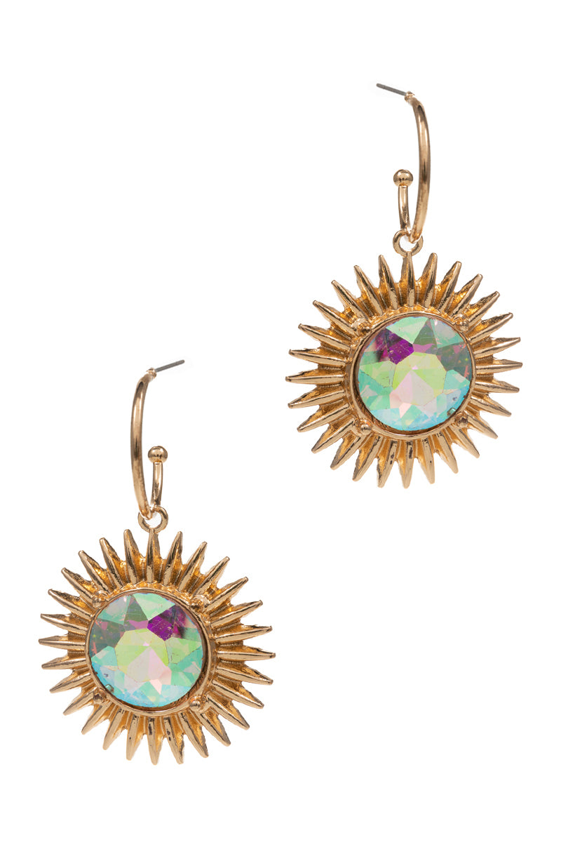 Expertly crafted with rhinestones, these 2.5 inch hoop earrings are designed in a beautiful sunflower shape.