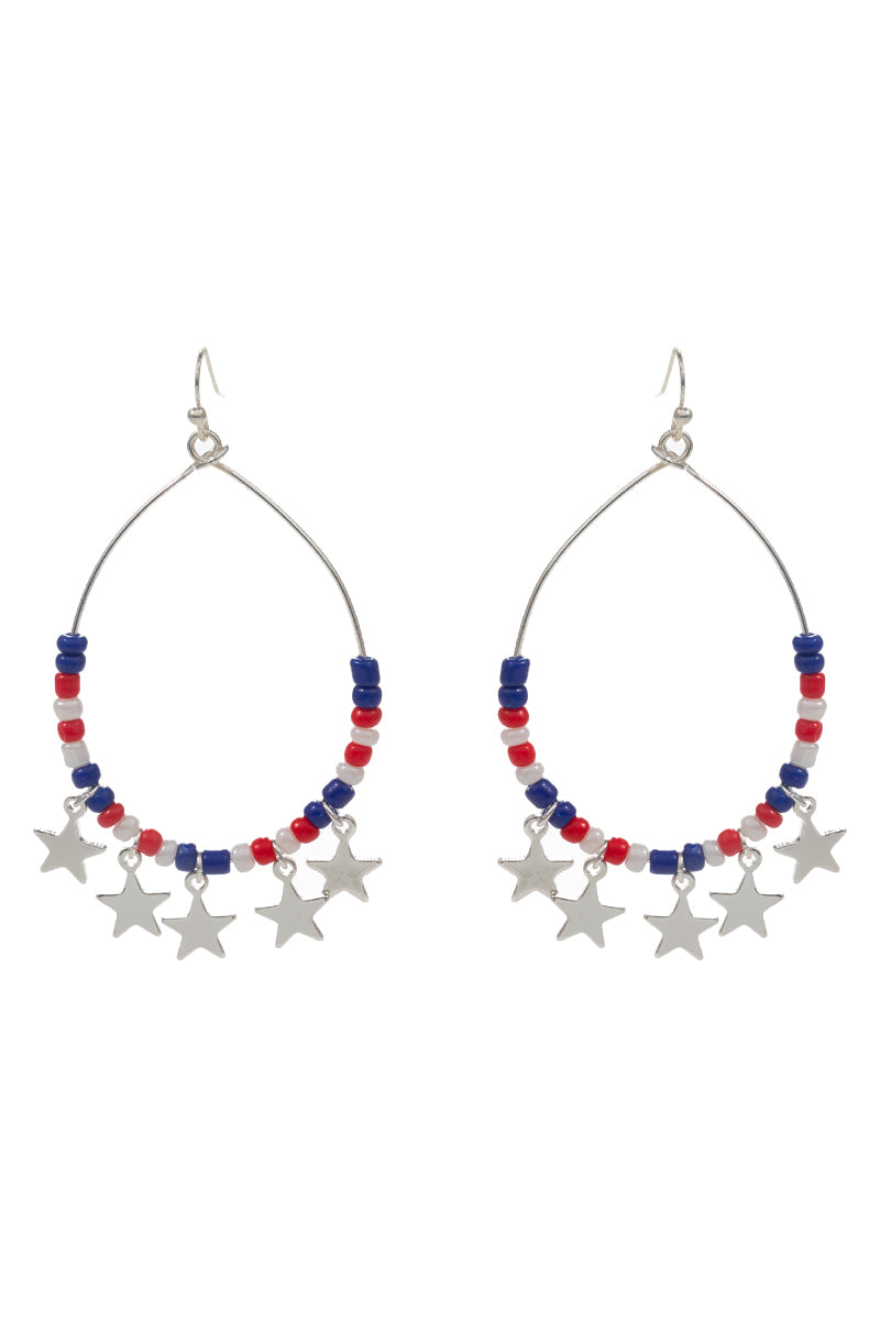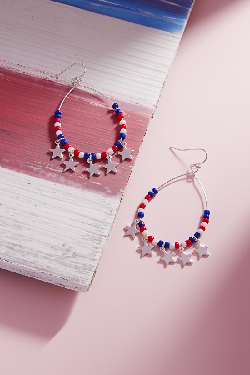 Expertly crafted, this 2.5 inch teardrop shaped earring features the iconic American flag colors and a delicate star hook. Made with high-quality seed beads, this piece adds a touch of patriotism to any outfit. The perfect accessory for any proud American.