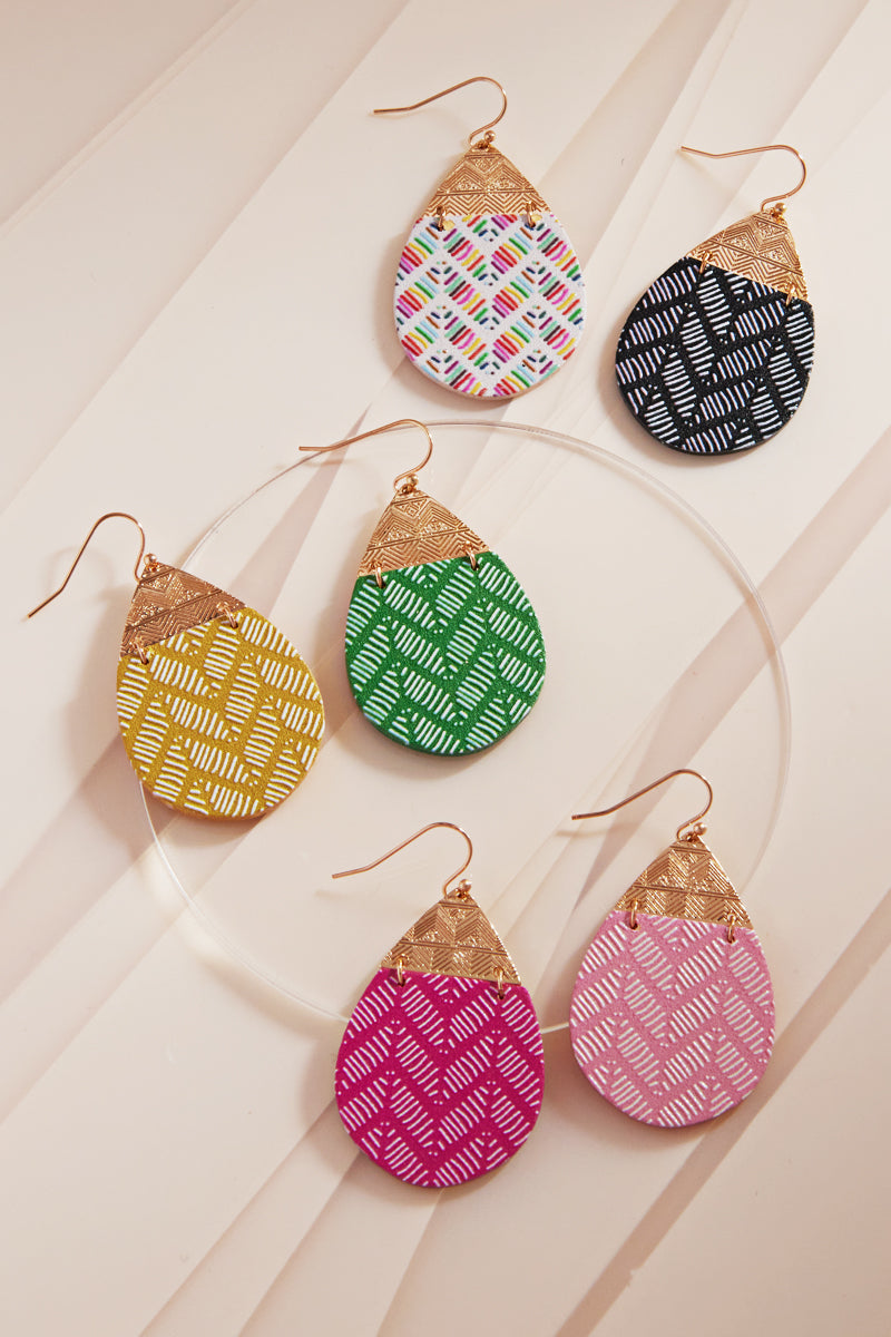 These stylish 2" teardrop-shaped wood earrings showcase a trendy chevron pattern. The sturdy hooks make them easy to wear and the lightweight design ensures all-day comfort. Perfect for adding a touch of contemporary elegance to any outfit.