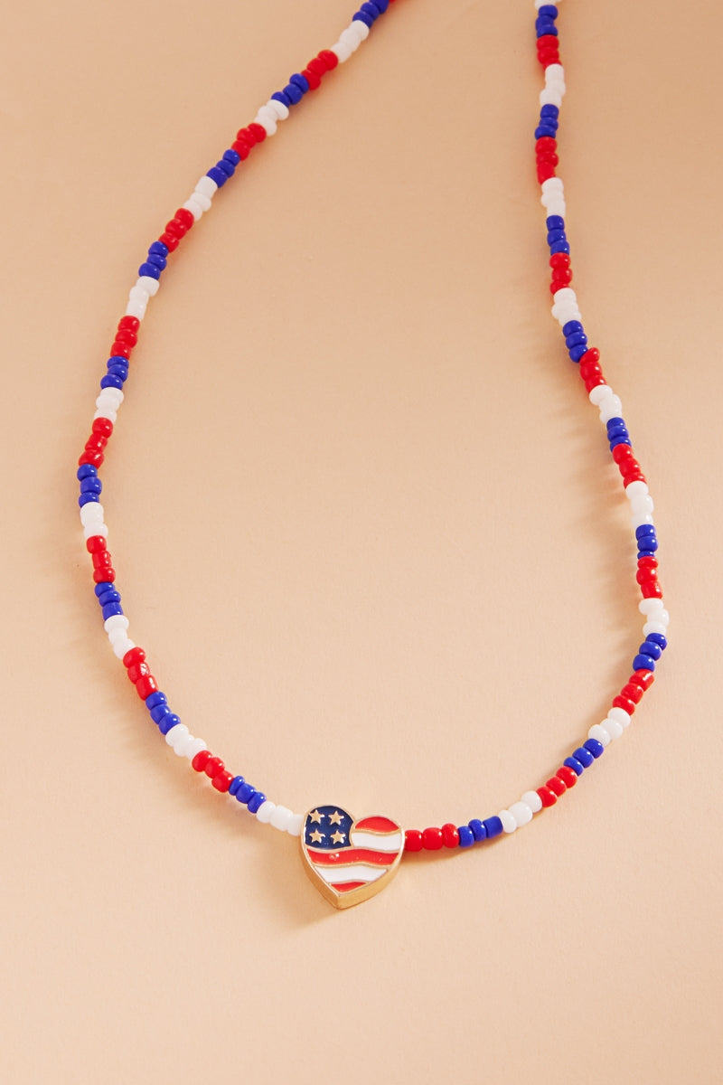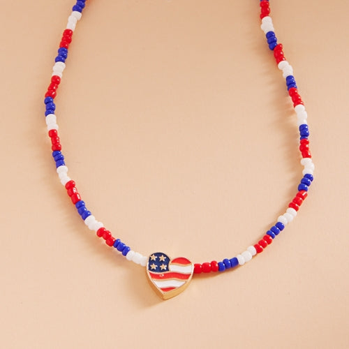 With 16 inches of length, this heart flag beaded necklace is both stylish and patriotic. The perfect accessory for any outfit, it features intricate beadwork and a heart-shaped flag pendant that symbolizes love for country. Show off your love for your country in a subtle yet stunning way.
