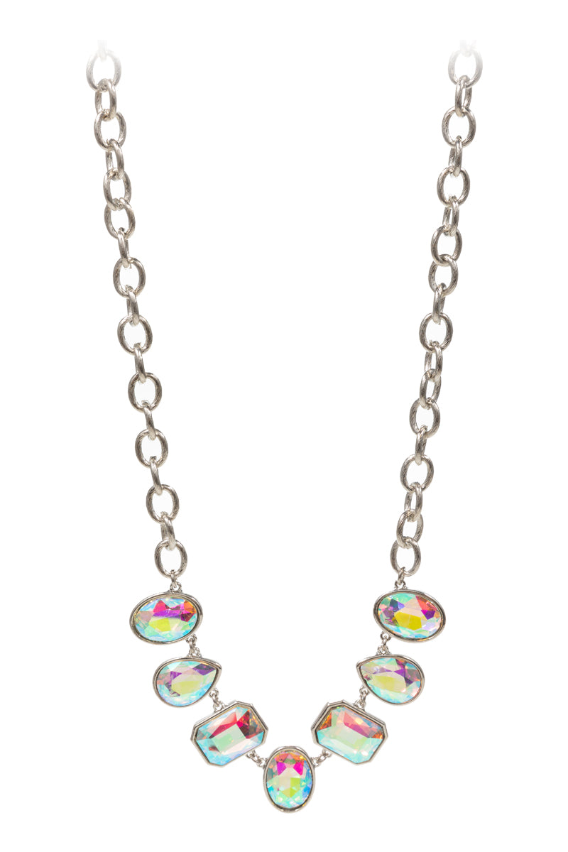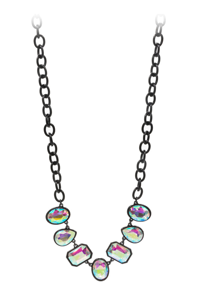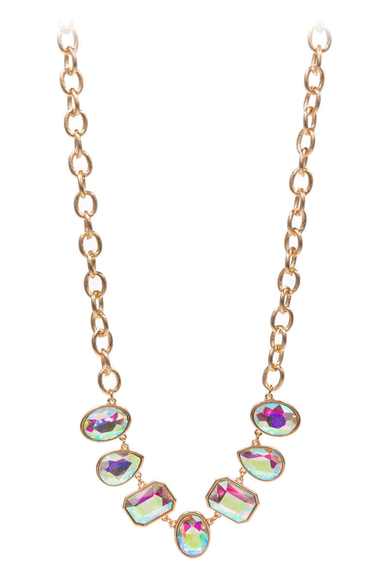 Expertly crafted with a mix of rhinestones, this 18 inch statement necklace adds a touch of glamour to any outfit. The combination of different shapes adds visual interest and elevates your style.
