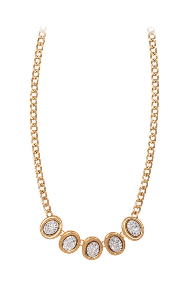 Upgrade your style with our 16-inch oval shaped metal necklace, adorned with faux druzy stones. Make a statement with this short necklace that adds a touch of elegance to any outfit.