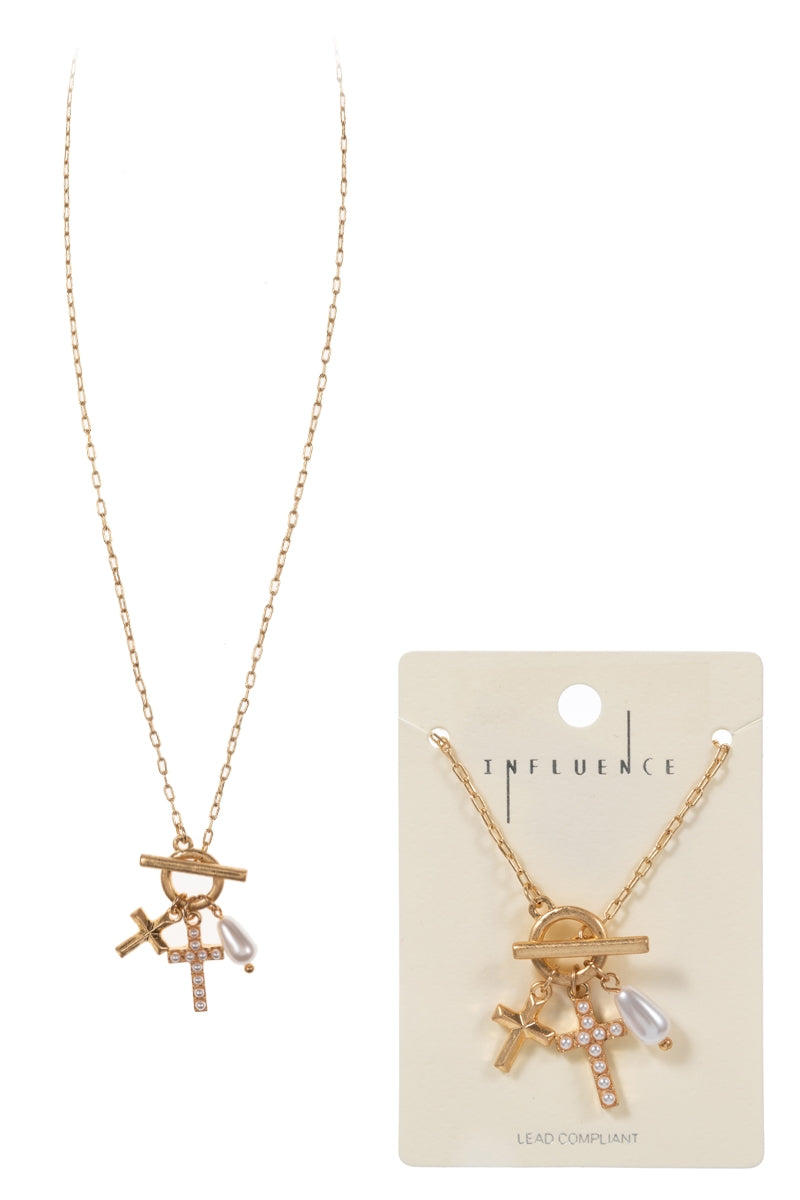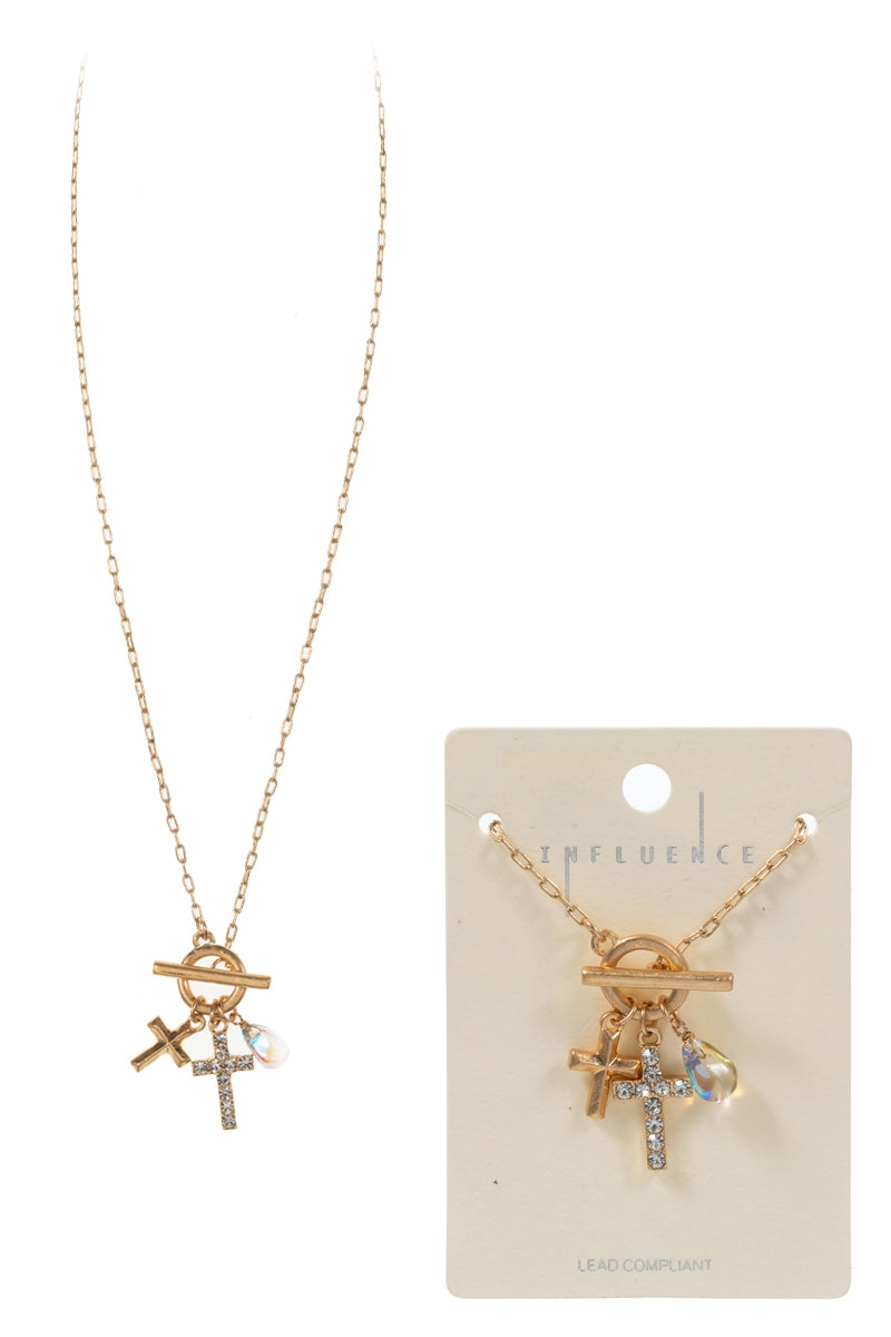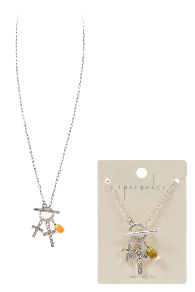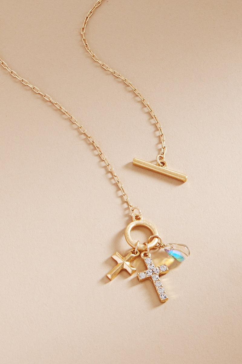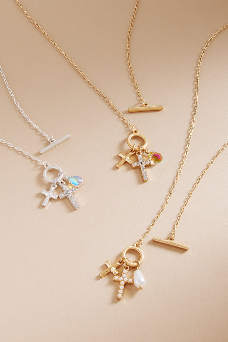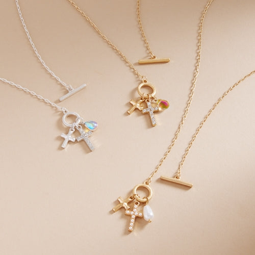 Paved Cross W Multi Charm Cluster Short Necklace
