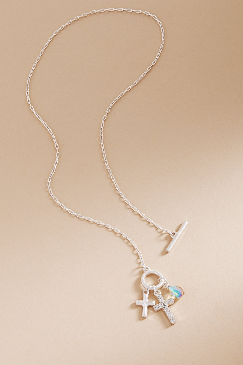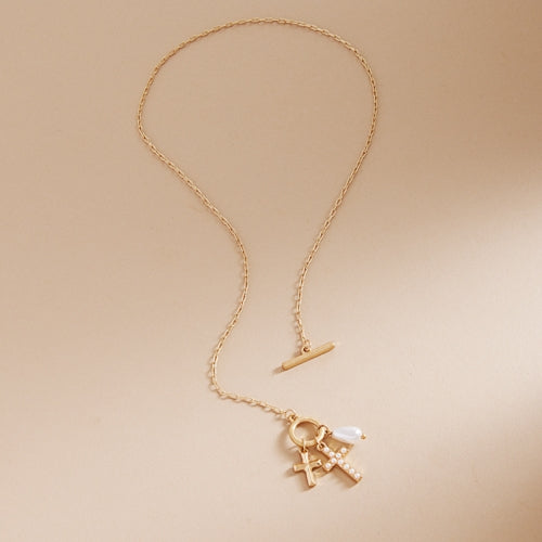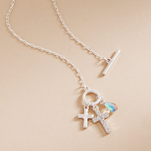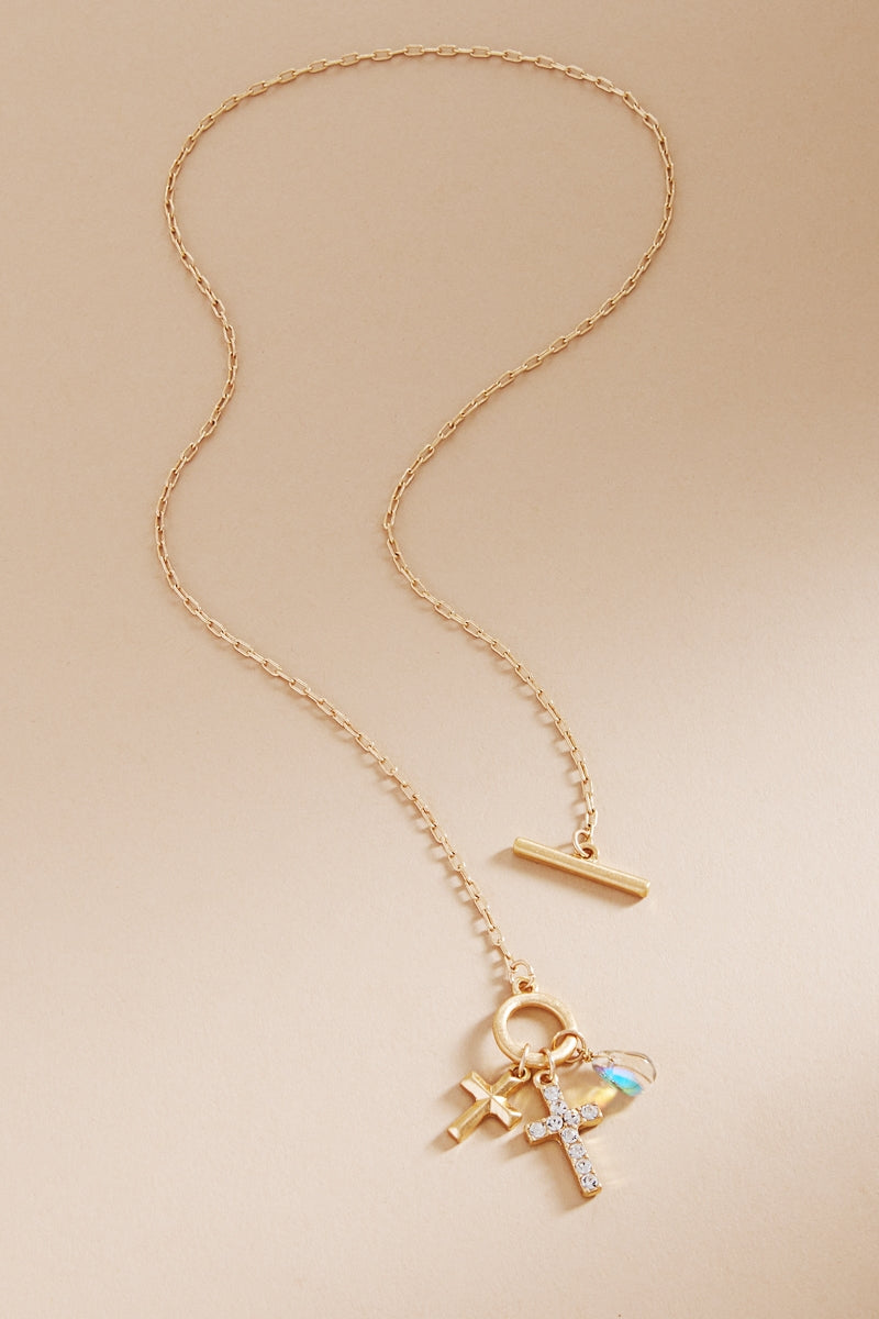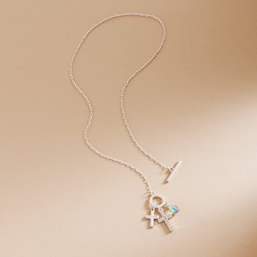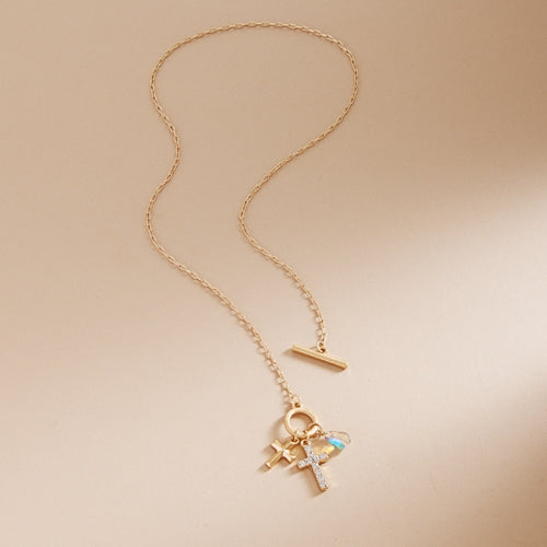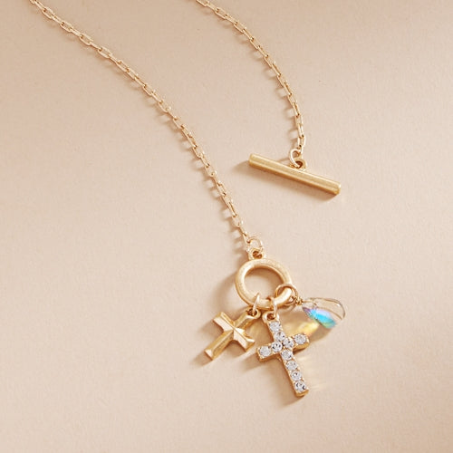 Expertly crafted, this 17 inch necklace features a stunning paved cross and a multi-charm cluster that adds elegance to any outfit. Made with high-quality materials, this necklace is a perfect choice for any occasion. Be stylish and confident with this eye-catching necklace.