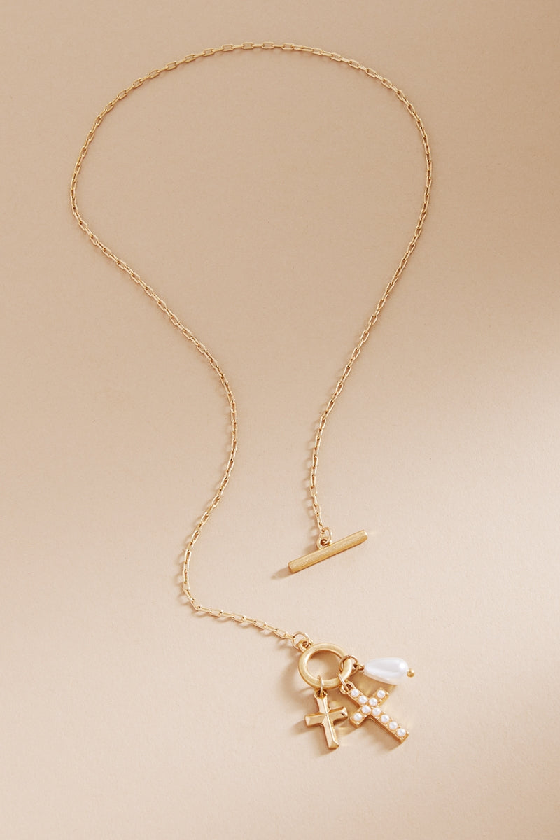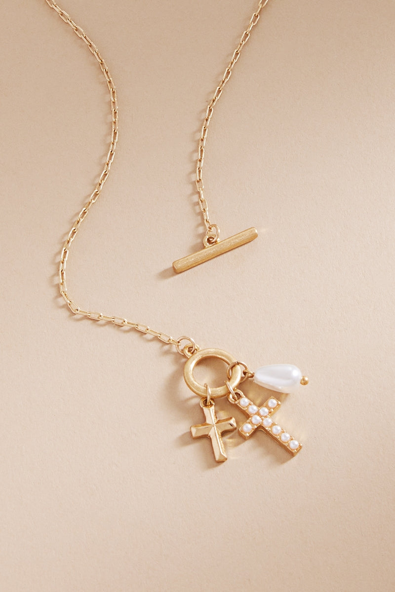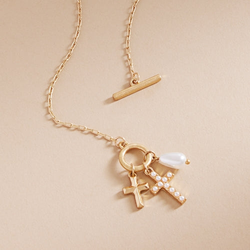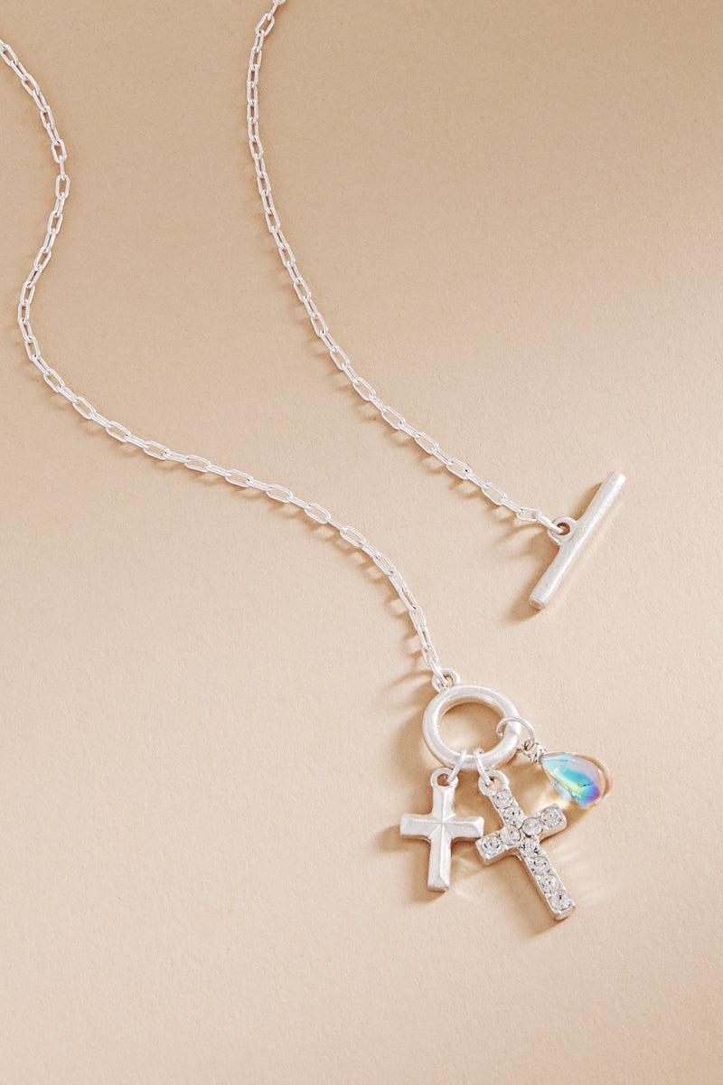 Expertly crafted, this 17 inch necklace features a stunning paved cross and a multi-charm cluster that adds elegance to any outfit. Made with high-quality materials, this necklace is a perfect choice for any occasion. Be stylish and confident with this eye-catching necklace.