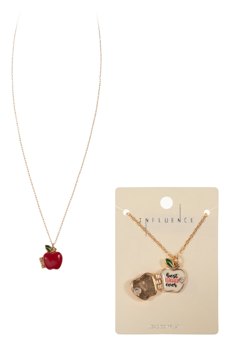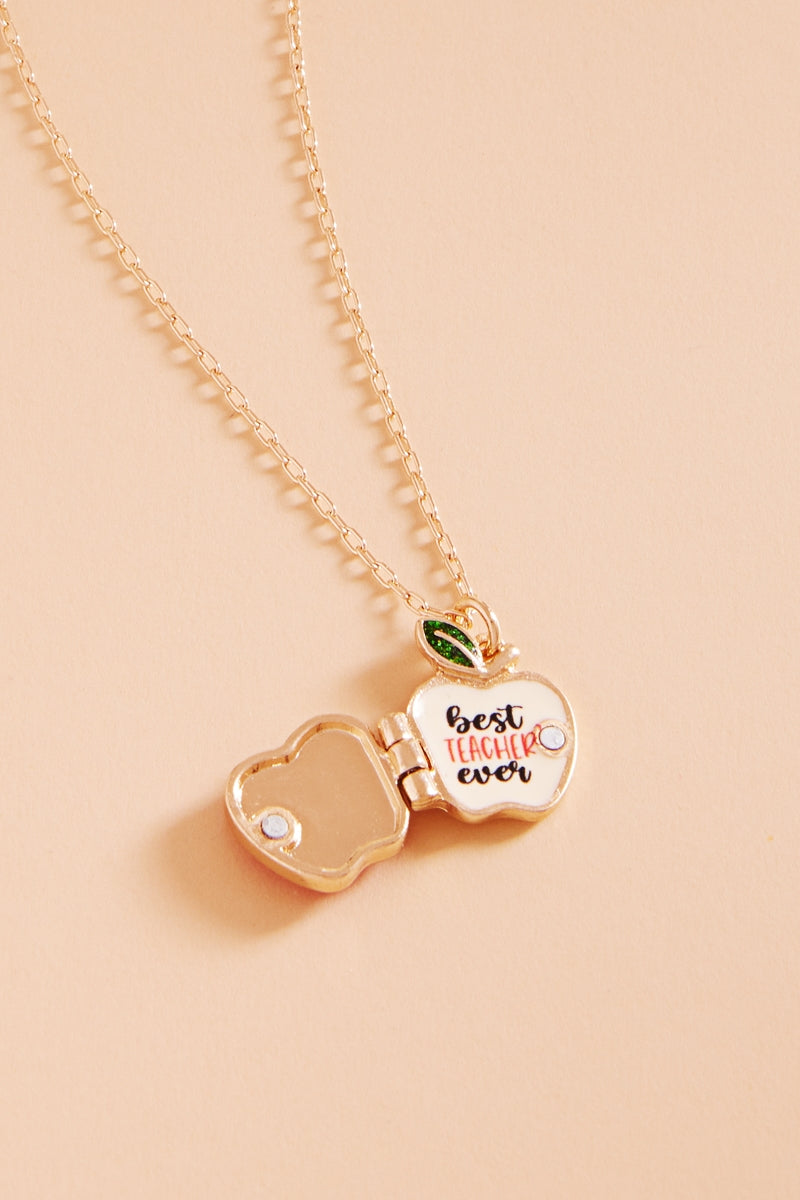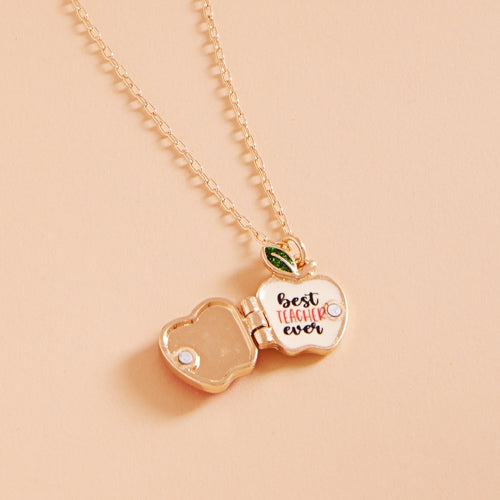 This Apple-shaped locket necklace is a perfect gift for the best teacher ever! Measuring 18 inches in length, it's sure to make a thoughtful and heartfelt statement. The top quality craftsmanship and unique design make it a one-of-a-kind piece. Show your appreciation with this charming necklace.